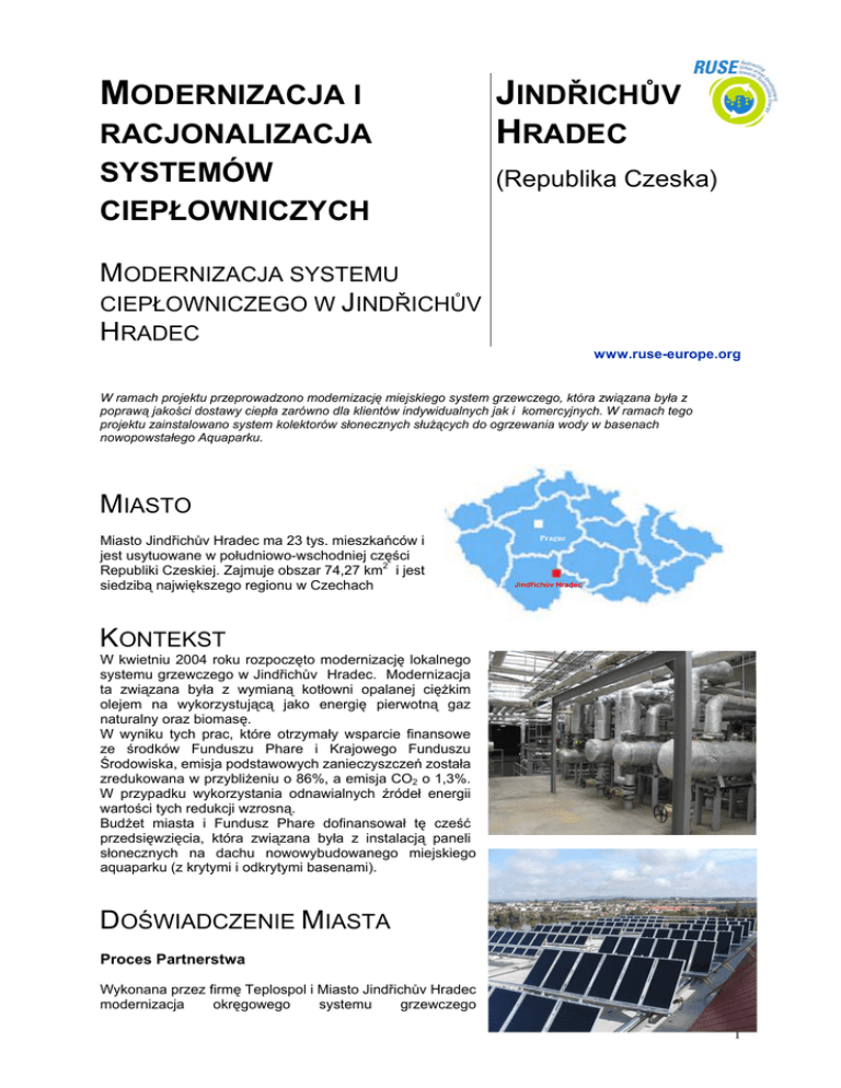 MODERNIZACJA I RACJONALIZACJA SYSTEMÓW CIEPŁOWNICZYCH JINDŘICHŮV HRADEC (Republika Czeska) MODERNIZACJA SYSTEMU CIEPŁOWNICZEGO W JINDŘICHŮV HRADEC www.ruse-europe.org W ramach projektu przeprowadzono modernizację miejskiego system grzewczego, która związana była z poprawą jakości dostawy ciepła zarówno dla klientów indywidualnych jak i komercyjnych. W ramach tego projektu zainstalowano system kolektorów słonecznych służących do ogrzewania wody w basenach nowopowstałego Aquaparku. MIASTO Miasto Jindřichův Hradec ma 23 tys. mieszkańców i jest usytuowane w południowo-wschodniej części Republiki Czeskiej. Zajmuje obszar 74,27 km2 i jest siedzibą największego regionu w Czechach Prague Jindřichův Hradec KONTEKST W kwietniu 2004 roku rozpoczęto modernizację lokalnego systemu grzewczego w Jindřichův Hradec. Modernizacja ta związana była z wymianą kotłowni opalanej ciężkim olejem na wykorzystującą jako energię pierwotną gaz naturalny oraz biomasę. W wyniku tych prac, które otrzymały wsparcie finansowe ze środków Funduszu Phare i Krajowego Funduszu Środowiska, emisja podstawowych zanieczyszczeń została zredukowana w przybliżeniu o 86%, a emisja CO2 o 1,3%. W przypadku wykorzystania odnawialnych źródeł energii wartości tych redukcji wzrosną. Budżet miasta i Fundusz Phare dofinansował tę cześć przedsięwzięcia, która związana była z instalacją paneli słonecznych na dachu nowowybudowanego miejskiego aquaparku (z krytymi i odkrytymi basenami). DOŚWIADCZENIE MIASTA Proces Partnerstwa Wykonana przez firmę Teplospol i Miasto Jindřichův Hradec modernizacja okręgowego systemu grzewczego 1 reprezentuje jedną z najlepiej udoskonalonych form gospodarki ciepłem w regionie Południowej Bohemy zrealizowanej przy udziale Funduszu Phare, Krajowego Funduszu Środowiska, Czeskiej Agencji Energetycznej oraz SEVEn. Centrum Efektywności Energetycznej przygotowało rozwiązanie do etapu konstrukcyjnego wspólnie przez K–projekt Dačice i Teplospol Jindřichův Hradec. Realizację w praktyce wykonała firma ŽS Brno bazując na projekcie wykonanym przez Energoprojekt Praha i Teplospol Jindřichův Hradec. Rozbudowa systemu paneli słonecznych została sfinansowana z budżetu miasta i wcześniej wspomnianego Funduszu Phare. Panele zostały zainstalowane przez Envi, s.r.o. Třeboň Company. Dane techniczne Projekt obejmuje modernizację dwóch niezależnych systemów grzewczych w Jindřichův Hradec dostarczających ciepło dla 15 000 mieszkańców. W szczególności w ramach projektu rozbudowano system grzewczy w dzielnicy „U nádraží”. Obecnie system ciepłowniczy bazuje na nowym źródle ciepłej wody z zainstalowaną mocą grzewczą o wartości 6 MW. Jako paliwo wykorzystuje biomasę oraz gaz ziemny w pomocniczej kotłowni dostarczającej ciepło do 924 mieszkań, sklepów i lokali użytkowych. System daje możliwość podłączenia wszystkich konsumentów w przyszłości. Drugi, dalekosiężny system grzewczy został zrealizowany w dzielnicy mieszkaniowej “Vajgar a Hvězdárna”. Znajduje się tam gazowa kotłownia wodna o mocy wyjściowej 30 MW, która będzie pracowała w kogeneracji z elektrociepłownią o mocy 150 kW produkując ciepło i prąd elektryczny. Ciepło dostarczane jest do 3 703 mieszkań, dwóch szkół podstawowych, szkoły pielęgniarskiej, obiektów handlu detalicznego i zakładów produkcyjnych. Kompleks basenów za pośrednictwem nowego przyłącza korzysta z nowej ciepłowni w celu podgrzewania wody w niecce basenu, która również ogrzewana jest poprzez baterie słoneczne. W przyszłości mogą zostać podłączeni do systemu dodatkowi odbiorcy (około 200 nowych mieszkań). Panele słoneczne umiejscowione są na dachu krytej pływalni i składają się z 96 płaskich kolektorów Heliostar H300 N2L. Każdy o powierzchni absorpcyjnej 1,76 m2 . Kolektory ułożone są w ośmiu rzędach, a ich całkowita powierzchnia absorpcyjna wynosi 168,96 m2. Kolektory zorientowane są w kierunku południowo-wschodnim i nachylone w stosunku do powierzchni poziomej pod kątem 45o tworząc optymalne warunki do absorpcji ciepła przez cały rok. Ciepło z kolektorów słonecznych jest dostarczane bezpośrednio do basenów poprzez wymiennik ciepła z systemem akumulacyjnym. Pomiary i regulacja realizowane są przez centralny komputerowy system monitorujący. KOSZTY I KORZYŚCI Ekonomiczne Modernizacja systemu grzewczego została przeprowadzona na podstawie opracowania energetycznego wykonanego przez firmę SEVEn na zlecenie miasta. Opracowanie zawierało analizę obecnego stanu zaopatrzenia miasta w paliwo i energię, wraz z przedstawieniem scenariuszy możliwych zmian w przyszłości. Główną częścią opracowania był obszerny projekt rekonstrukcji miejskiego systemu dystrybucji ciepła z dwóch osobnych okręgowych systemów grzewczych dzielnic Vajgar i U Nádraží. Modernizacja systemu gospodarki ciepłem dzięki zastosowaniu biomasy i gazu ziemnego jako źródeł energii przyniosła wymierny efekt ekologiczny, zwłaszcza w kategoriach redukcji emisji gazów cieplarnianych będąc rezultatem użycia odnawialnych źródeł energii. Wymiana systemu dystrybucji ciepła poprzez zastąpienie pary jako nośnika ciepła gorącą/ciepłą wodą spowodowała korzyści ekonomiczne a także umożliwiła wprowadzenie przystępnych cen ciepła dla klientów końcowych. Roczne potencjalne oszczędności sięgają poziomu 9,383 GJ w przypadku paliwa, a całkowite koszty wymiany wynoszą 137,6 mln CZK. Wykres. Emisja podstawowych zanieczyszczeń (ton/rok) i CO2 (tys. ton/rok) przed i po zrealizowaniu projektu 2 Środowiskowe Emisja podstawowych zanieczyszczeń została zredukowana o około 86%, a emisja CO2 o 1,3%. W przypadku wykorzystania odnawialnych źródeł energii wartości tych redukcji zanieczyszczeń wzrosną. Przewidywana roczna produkcja energii z systemu kolektorów słonecznych zainstalowanych na dachu Aquaparku wynos