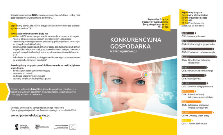Sprzyjamy rozwojowi firm, tworzeniu nowych produktów i usług oraz gospodarczemu wykorzystaniu pomysłów. Regionalny Program Operacyjny Województwa Świętokrzyskiego na lata 2014-2020 Zapewnimy pomoc dla MŚP w przygotowaniu nowych modeli biznesowych w oparciu o TIK Inwestycje ukierunkowane będą na: • wsparcie MŚP na wczesnym etapie rozwoju (start-upy), w szczególności w obszarach regionalnych inteligentnych specjalizacji • rozbudowę przedsiębiorstwa, prowadzącą do pojawienia się na rynku nowych produktów/usług • dokonywanie zasadniczych zmian procesu produkcyjnego lub zmian w sposobie świadczenia usług za pośrednictwem zakupu zaawansowanych nowych technologii lub w wyniku wdrożenia wyników prac B+R • wdrożenie do produkcji prototypu zrealizowanego i przetestowanego w ramach „pierwszej produkcji” Przedsiębiorcy mogą otrzymać dofinansowanie na realizację inwestycji, które: • zwiększą ich potencjał konkurencyjny • zapewnią im rozwój • podniosą poziom innowacyjności • pozwolą zwiększyć liczbę miejsc pracy Konkurencyjna gospodarka w stronę innowacji Regionalny Program Operacyjny Województwa Świętokrzyskiego na lata 2014-2020 11 Osi Priorytetowych z alokacją (w mln euro) 96,17 OŚ 1. Innowacje i nauka 161,25 OŚ 2. Konkurencyjna gospodarka 167,30 OŚ 3. Efektywna i zielona energia 176,56 OŚ 4. Dziedzictwo naturalne i kulturowe 129,52 OŚ 5. Nowoczesna komunikacja 118,64 OŚ 6. Rozwój miast 131,28 OŚ 7. Sprawne usługi publiczne Wsparcie w formie dotacji kierujemy dla projektów charakteryzujących się wysokim poziomem innowacyjności oraz zakładających znaczący wzrost zatrudnienia. Dowiedz się więcej na temat Regionalnego Programu Operacyjnego Województwa Świętokrzyskiego na lata 2014-2020: www.rpo-swietokrzyskie.pl 109,19 OŚ 8. Rozwój edukacji i aktywne społeczeństwo 99,57 OŚ 9. Włączenie społeczne i walka z ubóstwem 125,08 OŚ 10. Otwarty rynek pracy 50,00 OŚ 11. Pomoc techniczna Dowiedz się więcej! Urząd Marszałkowski Województwa Świętokrzyskiego Departament Wdrażania Europejskiego Funduszu Rozwoju Regionalnego ul. Sienkiewicza 63, 25-002 Kielce tel.: 41 365 81 00 Departament Wdrażania Europejskiego Funduszu Społecznego ul. Sienkiewicza 27, 25-007 Kielce tel.: 41 349 89 00 Departament Polityki Regionalnej ul. Sienkiewicza 63, 25-002 Kielce tel.: 41 365 81 70 Wojewódzki Urząd Pracy w Kielcach ul. Witosa 86, 25-561 Kielce tel.: 41 364 16 00 Główny Punkt Informacyjny o Funduszach Europejskich ul. Św. Leonarda 1, 25-311 Kielce tel.: 41 343 22 95 e-mail: [email protected] www.gpi-swietokrzyskie.pl Bezpłatna infolinia: 800 800 440 Serwis Regionalnego Programu Operacyjnego Województwa Świętokrzyskiego www.rpo-swietokrzyskie.pl Kto jeszcze może liczyć na wsparcie w ramach Osi Priorytetowej1? Nauka dla biznesu Innowacyjne przedsiębiorstwa, wykorzystujące wiedzę i badania naukowe, to lokomotywy konkurencyjnej gospodarki. Dlatego w nowym okresie programowania kładziemy nacisk na nowatorskie firmy i wsparcie jednostek badawczo-rozwojowych. W ramach Osi Priorytetowej 1 Innowacje i nauka interwencja skierowana będzie na projekty realizowane w obszarze inteligentnych specjalizacji regionu, czyli w branżach o największym potencjale. Pozwoli to mądrze i efektywnie wspierać regionalną gospodarkę. Przedsiębiorstwa, które chcą: • zakupić wyniki prac B+R • opatentować wyniki swoich prac • sfinansować zakup wyposażenia lub budowę infrastruktury niezbędnej do prowadzenia prac badawczo-rozwojowych Jesteś dużym przedsiębiorcą, współpracującym z MŚP, NGO i instytucjami badawczymi? Twoje nowatorskie pomysły również mogą liczyć na dofinansowanie! Inwestujemy w innowacje – od fazy badań, przez prace rozwojowe, aż po pierwszą produkcję. Inteligentne specjalizacje województwa świętokrzyskiego: • przemysł metalowo-odlewniczy • zasobooszczędne budownictwo • nowoczesne rolnictwo i przetwórstwo spożywcze • turystyka zdrowotna i prozdrowotna Specjalizacje horyzontalne województwa świętokrzyskiego: • technologie informacyjno-komunikacyjne ICT • branża targowo-kongresowa • zrównoważony rozwój energetyczny Będziemy sprzyjać nawiązywaniu silnej współpracy na linii sektor B+R i sektor przedsiębiorczości tak, by firmy mogły wykorzystywać wyniki badań w praktyce. Sfinansujemy budowę oraz zakup wyposażenia i aparatury naukowo-badawczej jednostek naukowych. Powstała infrastruktura B+R będzie wykorzystywana przez sektor biznesu. Zapewnimy realizację pomysłów IOB na tworzenie kompleksowych pakietów usług dla przedsiębiorstw, zachęcających do podejmowania działań B+R Podniesienie jakości i rozszerzenie usług IOB pozwoli uzupełnić wsparcie przedsiębiorczości w regionie W ramach Osi Priorytetowej 2 Konkurencyjna gospodarka tworzymy klimat dla biznesu po to, by świętokrzyskie firmy z powodzeniem konkurowały na rynku krajowym i międzynarodowym. Zwiększamy potencjał instytucji otoczenia biznesu, które profesjonalizują swoje usługi i rozwijają przedsiębiorczość. Wzmacniamy niezbędną dla biznesu infrastrukturę. Inwestujemy w niezagospodarowane tereny, a także te poprzemysłowe – odpowiednio zaadaptowane, które stanowić będą atrakcyjne miejsca do lokowania nowych przedsięwzięć. Na szczególne wsparcie mogą liczyć inwestycje: • na terenach zlokalizowanych w bliskim sąsiedztwie znaczącej infrastruktury transportowej • realizowane na terenach zdegradowanych • wykazujące dużą zdolność do pozyskania inwestorów