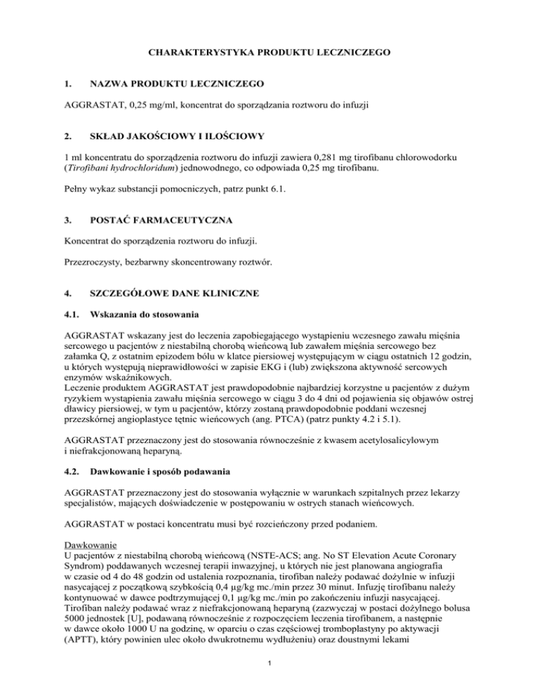 CHARAKTERYSTYKA PRODUKTU LECZNICZEGO 1. NAZWA PRODUKTU LECZNICZEGO AGGRASTAT, 0,25 mg/ml, koncentrat do sporządzania roztworu do infuzji 2. SKŁAD JAKOŚCIOWY I ILOŚCIOWY 1 ml koncentratu do sporządzenia roztworu do infuzji zawiera 0,281 mg tirofibanu chlorowodorku (Tirofibani hydrochloridum) jednowodnego, co odpowiada 0,25 mg tirofibanu. Pełny wykaz substancji pomocniczych, patrz punkt 6.1. 3. POSTAĆ FARMACEUTYCZNA Koncentrat do sporządzenia roztworu do infuzji. Przezroczysty, bezbarwny skoncentrowany roztwór. 4. SZCZEGÓŁOWE DANE KLINICZNE 4.1. Wskazania do stosowania AGGRASTAT wskazany jest do leczenia zapobiegającego wystąpieniu wczesnego zawału mięśnia sercowego u pacjentów z niestabilną chorobą wieńcową lub zawałem mięśnia sercowego bez załamka Q, z ostatnim epizodem bólu w klatce piersiowej występującym w ciągu ostatnich 12 godzin, u których występują nieprawidłowości w zapisie EKG i (lub) zwiększona aktywność sercowych enzymów wskaźnikowych. Leczenie produktem AGGRASTAT jest prawdopodobnie najbardziej korzystne u pacjentów z dużym ryzykiem wystąpienia zawału mięśnia sercowego w ciągu 3 do 4 dni od pojawienia się objawów ostrej dławicy piersiowej, w tym u pacjentów, którzy zostaną prawdopodobnie poddani wczesnej przezskórnej angioplastyce tętnic wieńcowych (ang. PTCA) (patrz punkty 4.2 i 5.1). AGGRASTAT przeznaczony jest do stosowania równocześnie z kwasem acetylosalicylowym i niefrakcjonowaną heparyną. 4.2. Dawkowanie i sposób podawania AGGRASTAT przeznaczony jest do stosowania wyłącznie w warunkach szpitalnych przez lekarzy specjalistów, mających doświadczenie w postępowaniu w ostrych stanach wieńcowych. AGGRASTAT w postaci koncentratu musi być rozcieńczony przed podaniem. Dawkowanie U pacjentów z niestabilną chorobą wieńcową (NSTE-ACS; ang. No ST Elevation Acute Coronary Syndrom) poddawanych wczesnej terapii inwazyjnej, u których nie jest planowana angiografia w czasie od 4 do 48 godzin od ustalenia rozpoznania, tirofiban należy podawać dożylnie w infuzji nasycającej z początkową szybkością 0,4 µg/kg mc./min przez 30 minut. Infuzję tirofibanu należy kontynuować w dawce podtrzymującej 0,1 μg/kg mc./min po zakończeniu infuzji nasycającej. Tirofiban należy podawać wraz z niefrakcjonowaną heparyną (zazwyczaj w postaci dożylnego bolusa 5000 jednostek [U], podawaną równocześnie z rozpoczęciem leczenia tirofibanem, a następnie w dawce około 1000 U na godzinę, w oparciu o czas częściowej tromboplastyny po aktywacji (APTT), który powinien ulec około dwukrotnemu wydłużeniu) oraz doustnymi lekami 1 przeciwpłytkowymi, w tym między innymi, z kwasem acetylosalicylowym (patrz punkt 5.1), o ile nie ma przeciwwskazań do ich stosowania. Wykazano skuteczność kliniczną u pacjentów poddanych przezskórnej interwencji wieńcowej (PCI, ang. Percutaneous Coronary Interventions), u których zastosowano tirofiban we wstrzyknięciu nasycającym (bolus) 25 μg/kg mc w ciągu 3 minut i kontynuowano leczenie wlewem z szybkością 0,15 μg/kg mc/min trwającym od 18-24 godziny do 48 godzin. Tirofiban należy podawać wraz z niefrakcjonowaną heparyną i doustnymi lekami przeciwpłytkowymi, w tym między innymi, z kwasem acetylosalicylowym (patrz punkt 5.1), o ile nie ma przeciwwskazań do ich stosowania. Nie jest wymagana modyfikacja dawki produktu leczniczego u osób w podeszłym wieku (patrz punkt 4.4). Pacjenci z ciężką niewydolnością nerek U pacjentów z ciężką niewydolnością nerek (klirens kreatyniny < 30 ml/min), dawkowanie produktu leczniczego AGGRASTAT należy zmniejszyć o 50% (patrz punkty 4.4 i 5.2). Dzieci i młodzież Nie ustalono bezpieczeństwa stosowania i skuteczności produktu AGGRASTAT u dzieci. Brak dostępnych danych. Poniższa tabela służy jako pomoc do dostosowania dawki względem masy ciała pacjenta. AGGRASTAT, koncentrat do sporządzania roztworu do infuzji, musi być rozcieńczony przed użyciem, tak jak opisano w części „Instrukcje dotyczące stosowania”. Masa 0,4 µg/kg mc./min ciała Dawkowanie nasycające pacjenta Większość pacjentów (kg) 30-37 38-45 46-54 55-62 63-70 71-79 80-87 88-95 96-104 105-112 113-120 121-128 129-137 138-145 146-153 Szybkość 30-min infuzji nasycającej (ml/h) 16 20 24 28 32 36 40 44 48 52 56 60 64 68 72 Szybkość infuzji podtrzymującej (ml/h) 4 5 6 7 8 9 10 11 12 13 14 15 16 17 18 0,4 µg/kg mc./min Dawkowanie nasycające Ciężka niewydolność nerek 25 μg/kg mc. 25 μg/kg mc. Dawkowanie Dawkowanie z zastosowaniem z zastosowaniem bolusa bolusa Większość Ciężka pacjentów niewydolność nerek Szybkość Szybkość infuzji Bolus Szybkość Bolus Szybkość 30-min infuzji podtrzymującej (ml) infuzji (ml) infuzji nasycającej (ml/h) podtrzymującej podtrzymującej (ml/h) (ml/h) (ml/h) 8 10 12 14 16 18 20 22 24 26 28 30 32 34 36 2 3 3 4 4 5 5 6 6 7 7 8 8 9 9 17 21 25 29 33 38 42 46 50 54 58 62 67 71 75 6 7 9 11 12 14 15 16 18 20 21 22 24 25 27 8 10 13 15 17 19 21 23 25 27 29 31 33 35 37 3 4 5 5 6 7 8 8 9 10 10 11 12 13 13 Rozpoczęcie i czas trwania leczenia produktem leczniczym AGGRASTAT U pacjentów z niestabilną chorobą wieńcową (NSTE-ACS; ang. No ST Elevation Acute Coronary Syndrom) poddawanych wczesnej terapii inwazyjnej, u których nie jest planowana angiografia w czasie od 4 do 48 godzin od ustalenia rozpoznania, leczenie tirofibanem należy rozpocząć od infuzji 2 nasycającej z szybkością 0,4 µg/kg mc./min podawanej po ustaleniu diagnozy. Zalecany czas trwania leczenia wynosi co najmniej 48 godzin. Infuzję produktu leczniczego AGGRASTAT oraz niefrakcjonowanej heparyny można kontynuować podczas wykonywania angiografii tętnic wieńcowych i powinna ona być utrzymywana przez co najmniej 12 godzin, i nie dłużej niż 24 godziny po wykonaniu angioplastyki lub aterektomii. Infuzję należy przerwać w momencie, gdy stan kliniczny pacjenta jest stabilny i nie planuje się wykonywania żadnej z wieńc