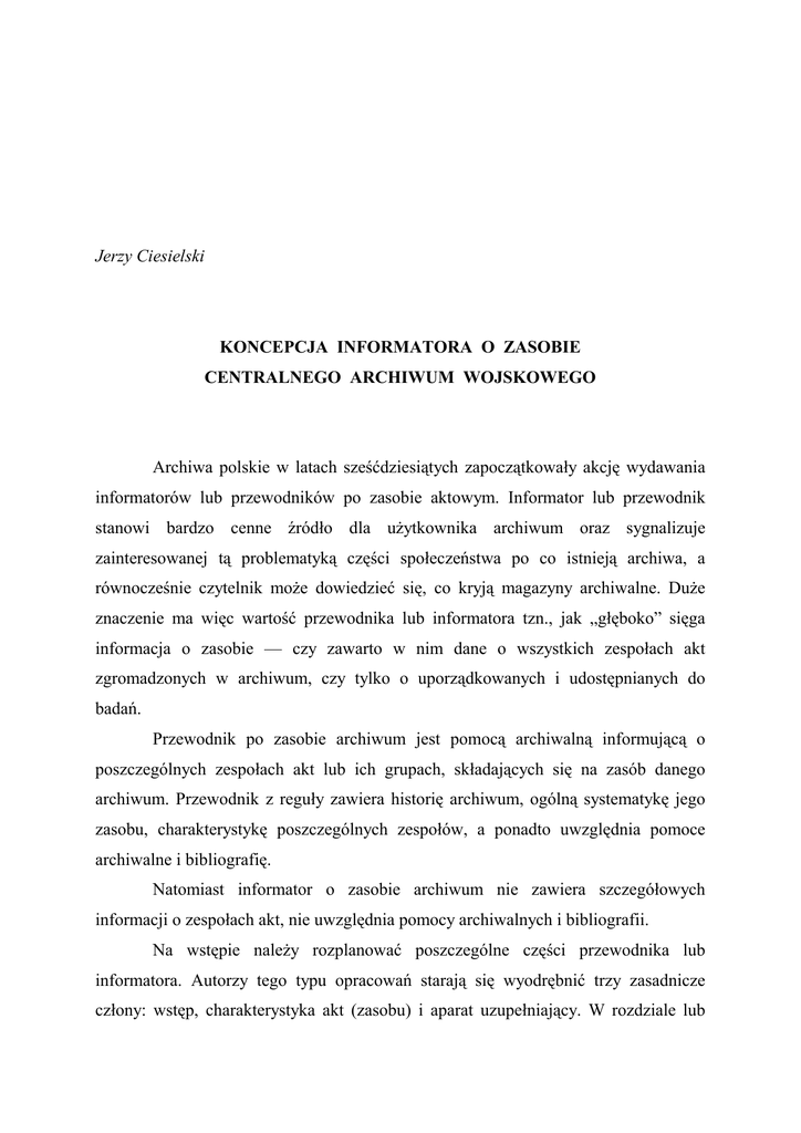 Jerzy Ciesielski KONCEPCJA INFORMATORA O ZASOBIE CENTRALNEGO ARCHIWUM WOJSKOWEGO Archiwa polskie w latach sześćdziesiątych zapoczątkowały akcję wydawania informatorów lub przewodników po zasobie aktowym. Informator lub przewodnik stanowi bardzo cenne źródło dla użytkownika archiwum oraz sygnalizuje zainteresowanej tą problematyką części społeczeństwa po co istnieją archiwa, a równocześnie czytelnik może dowiedzieć się, co kryją magazyny archiwalne. Duże znaczenie ma więc wartość przewodnika lub informatora tzn., jak „głęboko” sięga informacja o zasobie — czy zawarto w nim dane o wszystkich zespołach akt zgromadzonych w archiwum, czy tylko o uporządkowanych i udostępnianych do badań. Przewodnik po zasobie archiwum jest pomocą archiwalną informującą o poszczególnych zespołach akt lub ich grupach, składających się na zasób danego archiwum. Przewodnik z reguły zawiera historię archiwum, ogólną systematykę jego zasobu, charakterystykę poszczególnych zespołów, a ponadto uwzględnia pomoce archiwalne i bibliografię. Natomiast informator o zasobie archiwum nie zawiera szczegółowych informacji o zespołach akt, nie uwzględnia pomocy archiwalnych i bibliografii. Na wstępie należy rozplanować poszczególne części przewodnika lub informatora. Autorzy tego typu opracowań starają się wyodrębnić trzy zasadnicze człony: wstęp, charakterystyka akt (zasobu) i aparat uzupełniający. W rozdziale lub rozdziałach wstępnych umieszcza się przede wszystkim informacje o zasadach opracowania informatora lub przewodnika. We wstępie umieszcza się również historię archiwum wraz z dziejami narastania zasobu. Najważniejszą część informatora lub przewodnika stanowi omówienie zasobu archiwum i jego wartości badawczej. Jest to inaczej mówiąc charakterystyka zespołów lub grup zespołów akt. Części składowe tej charakterystyki to: nazwa zespołu, daty skrajne, sygnatura, zawartość zespołu, pomoce archiwalne, bibliografia. N a z w a z e s p o ł u pokrywa się z zasady z nazwą instytucji, która akta wytworzyła. Przy materiale jednorodnym zawartym w kilku zespołach można dać nazwę ogólną, np. jednostki kawalerii, piechoty itp. Nazwę zespołu uzupełniają daty, przy czym niektórzy zamieszczają daty krańcowe akt, inni zaś informują o początku i likwidacji instytucji (twórcy akt)i Podanie w przewodniku dat skrajnych (krańcowych) zespołu jest lepszym rozwiązaniem. S y g n a t u r a zespołu posiada specjalne znaczenie, oznacza bowiem stały numer zespołu w obrębie danego archiwum. Następny element opisu to zawartość z e s p o ł u, czyli bliższa charakterystyka akt w nim zawartych. Sposób opracowania tego elementu jest dość zróżnicowany. Cześć autorów tych opracowań ogranicza się do uwag o podziale wewnętrznym zespołu, formie i języku w jakim akta zostały spisane. Inni autorzy zajmują się treścią akt. Co jest lepsze — do dziś nie ustalono do końca. Kolejna część opisu zespołu to pomoce a r c h i w a l n e, a więc inwentarz, indeksy i repertoria, dzięki którym badacz może uzyskać bezpośredni kontakt z aktami. Również i tu panuje różnorodność zapisów w treści przewodnika lub informatora. Ostatnim punktem opisu zespołu jest b i b l i o g r a f i a z tym zespołem związana. Są to publikacje źródłowe, opracowania ustrojowe itp. Do wyjątków należą przewodniki pomijające ten punkt milczeniem. Centralne Archiwum Wojskowe do tej pory nie posiada opracowanego informatora ani przewodnika o zasobie aktowym. W drugiej połowie 1993 roku na jednym z posiedzeń Komisji Metodycznej, będącej, organem doradczym szefa CAW, postanowiono takie opracowanie wykonać. Od listopada 1993 roku trwają prace nad wersją „rozszerzonego” informatora o zasobie CAW. Nie będzie to przewodnik po zasobie, bowiem jest on zbyt pracochłonny i przygotowanie go do druku, a tym samym wprowadzenie do obiegu, trwałoby zbyt długo. Nie zostanie więc zamieszczona w tym opracowaniu bibliografia dotycząca poszczególnych zespołów, natomiast pozostałe elementy przewodnika będą uwzględnione. Opracowany w CAW informator będzie zawierał w s t ę p, w którym zostanie omówiony układ informatora, ogólne dane o zasobie, informacje o zmikrofilmowanych zespołach oraz ogólne dane o zawartości biblioteki podręcznej. We wstępie przedstawiona zostanie historia powstania CAW i jego przemiany organizacyjne, a także inne dane potrzebne korzystającym z zasobu aktowego CAW. W dalszej części informatora zostanie omówiony zasób aktowy — poszczególne zespoły lub grupy zespołów akt. Omawianie zespołów zaczęto od najstarszych akt przechowywanych w CAW, a układ ten przedstawia się następująco: 1) akta wytworzone przed odzyskaniem niepodległości, wśród których znajdują się m.in. archiwalia Legionów Polskich, Polskiego Korpusu Posiłkowego i inne; 2) akta wytworzone przez naczelne władze wojskowe, jednostki i instytucie w latach 1918—1939; 3) akta z okresu wojny i okupacji, w tym m.in. szczątkowe zespoły akt dotyczących ruchu oporu na ziemiach polskich i 2 Dywizji Strzelców Pieszych; 4) akta Wojska Polskiego utworzonego na terenie ZSRR do zakończenia II wojny światowej; 5) akta Wojska Polskiego po 1945 roku; 6) inne archiwalia, a wśród nich materiały personalne, odznaczeniowe, fotograficzne, kartograficzne oraz instrukcje i regulaminy wojskowe. Autorzy tego opracowania mają nadzieję, że prace nad informatorem zostaną zakończone w III kwartale 1995 roku, a pod koniec tegoż roku zostanie oddany do druku. Egzemplarze informatora zostaną przekazane placówkom naukowym, aby mogli korzystać z niego historycy i badacze wojskowych materiałów archiwalnych.