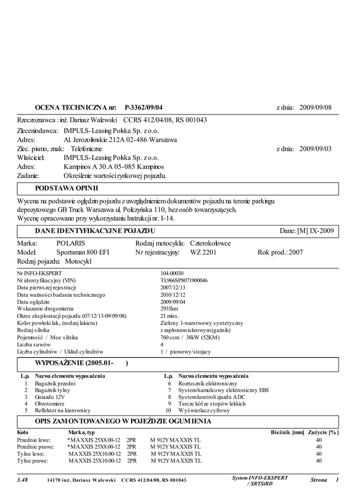 OCENA TECHNICZNA nr: P-3362/09/04 z dnia: 2009/09/08 Rzeczoznawca : inż. Dariusz Walewski CCRS 412/04/08, RS 001043 Zleceniodawca: IMPULS-Leasing Polska Sp. z o.o. Adres: Al. Jerozolimskie 212A 02-486 Warszawa Zlec. pismo, znak: Telefoniczne Właściciel: IMPULS-Leasing Polska Sp. z o.o. Adres: Kampinos A 30.A 05-085 Kampinos Zadanie: Określenie wartości rynkowej pojazdu. z dnia: 2009/09/03 PODSTAWA OPINII Wycena na podstawie oględzin pojazdu z uwzglądnieniem dokumentów pojazdu na terenie parkingu depozytowego GB Truck Warszawa ul. Połczyńska 110, bez osób towarzyszących. Wycenę opracowano przy wykorzystaniu Instrukcji nr. I-14. DANE IDENTYFIKACYJNE POJAZDU Marka: POLARIS Model: Sportsman 800 EFI Rodzaj pojazdu: Motocykl Rodzaj motocykla: Czterokołowce Nr rejestracyjny: WZ 2201 Nr INFO-EKSPERT Nr identyfikacyjny (VIN) Data pierwszej rejestracji Data ważności badania technicznego Data oględzin Wskazanie drogomierza Okres eksploatacji pojazdu (07/12/13-09/09/08) Kolor powłoki lak., (rodzaj lakieru) Rodzaj silnika Pojemność / Moc silnika Liczba suwów Liczba cylindrów / Układ cylindrów WYPOSAŻENIE (2005.01L.p. 1 2 3 4 5 Dane: [M] IX-2009 Rok prod.: 2007 104-00030 TL966SP8071900046 2007/12/13 2010/12/12 2009/09/04 2935km 21 mies. Zielony 1-warstwowy syntetyczny z zapłonem iskrowym (gaźnik) 760 ccm / 38kW (52KM) 4 1 / pionowy/stojący ) Nazwa elementu wyposażenia Bagażnik przedni Bagażnik tylny Gniazdo 12V Obrotomierz Reflektor na kierownicy L.p. 6 7 8 9 10 Nazwa elementu wyposażenia Rozrusznik elektroniczny System hamulcowy elektroniczny EBS System kontroli zjazdu ADC Tarcze kół ze stopów lekkich Wyświetlacz cyfrowy OPIS ZAMONTOWANEGO W POJEŹDZIE OGUMIENIA Koło Przednie lewe: Przednie prawe: Tylne lewe: Tylne prawe: 3.48 Marka, typ *MAXXIS 25X8.00-12 2PR *MAXXIS 25X8.00-12 2PR MAXXIS 25X10.00-12 2PR MAXXIS 25X10.00-12 2PR 14170 inż . Dariusz Wale wski M 912Y MAXXIS TL M 912Y MAXXIS TL M 912Y MAXXIS TL M 912Y MAXXIS TL C C RS 412/04/08, RS 001043 Bieżnik [mm] Zużycie [% ] 40 40 40 40 System INFO-EKSPERT / SRTSiRD Strona 1 P-3362/09/04 STAN TECHNICZNY POJAZDU Do oceny przedstawiono pojazd przejęty przez leasing, kompletny. Oględziny pojazdu dokonano na terenie parkingu depozytowego GB Truck Warszawa ul. Połczyńska 110, bez osób towarzyszących. W czasie oględzin dokonano jazdy próbnej po terenie parkingu. W czasie oględzin stwierdzono: SILNIK Silnik wraz z osprzętem kompletny bez widocznych braków i uszkodzeń mechanicznych. Silnika uruchomiono. Praca silnika w pełnym zakresie prędkości obrotowej nie budzi zastrzeżen. Układ wydechowy mocno skorodowany. PODWOZIE Podzespoły podwozia kpl. bez widocznych braków i uszkodzeń mechanicznych. Utrudnione włączanie wszystkich biegów. Sprężyna zawieszenia przedniego prawego uszkodzona, pojazd przechylony. NADWOZIE Nadwozie koloru zielonego, ze śladami niewielkich uszkodzeń mechanicznych. Części wyposażenia nadwozia uszkodzone kwalifikujące się do naprawy: - poszycia zewnętrzne porysowane,, Części wyposażenia pojazdu pogięte, uszkodzone kwalifikujące się do wymiany: - posesty stopnic po prawej i lewej stronie - popękane, - krata wlotu powietrza - popękana, BRAKI w wyposażeniu pojazdu - brak wkładów bezpieczników w kasecie bezpieczników i przekaźników, WYPOSAŻENIE Wyposażenie fabryczne pojazdu - kompletne. Pojazd posiada 2 komplety kluczyków do włącznika zapłonu. Od niniejszej wyceny przysługuje odwołanie do Zarządu Spółki za pośrednictwem Dyrektora Oddziału. W przypadku konieczności wykonania wyceny komisyjnej wymagana jest wpłata zaliczki w wysokości określonej przez Oddział wykonujący wycenę. WERYFIKATOR RZECZOZNAWCA pieczęć 3.48 14170 inż . Dariusz Wale wski C C RS 412/04/08, RS 001043 System INFO-EKSPERT / SRTSiRD Strona 2