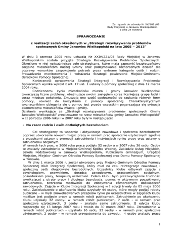 Za łącznik do uchwały Nr XV/108 /08 Rady Miejskiej w Janowcu Wielkopolskim z dnia 24 kwietnia SPRAWOZDANIE z realizacji zadań określonych w „Strategii rozwiązywania problemów społecznych Gminy Janowiec Wielkopolski na lata 2005 – 2013” W dniu 3 czerwca 2005 roku uchwałą Nr XXIV/221/05 Rady Miejskiej w Janowcu Wielkopolskim została przyjęta Strategia Rozwiązywania Problemów Społecznych. Określono w niej najważniejsze cele strategiczne, które mają zapewnić bezpieczeństwo socjalne mieszkańcom naszej Gminy oraz podejmowanie różnorodnych działań dla poprawy warunków zaspokojenia potrzeb przez wybrane kategorie osób i rodzin. Prowadzenie monitorowania i wdrażania Strategii powierzono Miejsko-Gminnemu Ośrodkowi Pomocy Społecznej. Konieczność opracowania Strategii Integracji i Rozwiązywania Problemów Społecznych wynika wprost z art. 17 ust. 1 ustawy o pomocy społecznej z dnia 12 marca 2004 roku. Codziennemu życiu mieszkańców miasta i gminy Janowiec Wielkopolski towarzyszą liczne problemy, obejmujące swoim zasięgiem coraz liczniejszą grupę ludzi i coraz młodsze pokolenia. Zmuszają one część społeczności do szukania różnych form pomocy, również do korzystania z pomocy społecznej. Charakterystycznym wyznacznikiem ubiegania się o pomoc jest przede wszystkim pogarszająca się sytuacja ekonomiczna mieszkańców miasta i gminy. Działania wynikające ze „Strategii rozwiązywania problemów społecznych Gminy Janowiec Wielkopolski” zrealizowane na rzecz mieszkańców gminy Janowiec Wielkopolski” w II półroczu 2006 roku i w 2007 roku były w następujące: - Na rzecz rodzin i osób dotkniętych bezrobociem Cel strategiczny to wsparcie i aktywizacja zawodowa i społeczna bezrobotnych poprzez utworzenie nowych miejsc pracy w ramach prac społecznie użytecznych zgodnie z przepisami ustawy o promocji zatrudnienia i instytucjach rynku pracy oraz ustawy o zatrudnieniu socjalnym. W ramach tych prac, w 2006 roku pracę podjęły 52 osoby a w 2007 roku 36 osób. Osoby te znalazły zatrudnienie w Miejsko-Gminnej Spółce Wodnej, Zakładzie Usług Miejskich, Szkole Podstawowej w Janowcu Wielkopolskim, Publicznym Gimnazjum, Urzędzie Miejskim, Miejsko- Gminnym Ośrodku Pomocy Społecznej oraz Domu Pomocy Społecznej w Tonowie. W dniu 1 marca 2006 r. został utworzony przy Miejsko-Gminnym Ośrodku Pomocy Społecznej Klub Integracji Społecznej, który miał na celu reintegracje zawodową i społeczną osób długotrwale bezrobotnych. Uczestnicy Klubu odbywali zajęcia z psychologiem, prawnikiem, doradcą zawodowym, pracownikiem socjalnym, pośrednikiem pracy, terapeutą uzależnień. Celem klubu było przezwyciężenie trudności wynikającej z utraty pracy i długiego bezrobocia, pomoc w aktywnym poszukiwaniu zatrudnienia, tworzenia możliwości do zdobywania różnorodnych doświadczeń zawodowych. Zajęcia w Klubie Integracji Społecznej w I edycji trwały do 05 maja 2006 roku. Zaświadczenie o ukończeniu klubu uzyskały 44 osoby, które mogły podjąć roboty publiczne – w myśl znowelizowanych przepisów tylko po uczestnictwie w zajęciach klubu możliwe jest podjęcie pracy w ramach robót publicznych. Zatrudnienie po ukończeniu Klubu uzyskały 32 osoby- w ramach robót publicznych, 7 osób - w ramach prac społecznie użytecznych, 3 osoby - znalazły same zatrudnienie. II edycja klubu rozpoczęła się 13 lutego 2007 roku i trwała do 30 marca 2007 roku. Zatrudnienie w ramach robót publicznych - uzyskało 16 osób, 23 osoby - w ramach prac społecznie użytecznych, 2 osoby - w ramach przygotowania do zawodu, 4 osoby znalazły pracę 1 same natomiast 1 osoba nie podjęła zatrudnienia z powodu choroby. Zaświadczenie o ukończeniu Klubu Integracji II edycji uzyskało 46 osób. Ogólnie w latach 2006 i 2007 program Reintegracji Społecznej i Zawodowej oraz przeszkolenie uzyskało 90 osób. Miejsko – Gminny Ośrodek Pomocy Społecznej w Janowcu Wielkopolskim współpracuje z Powiatowym Urzędem Pracy w Żninie i wspiera osoby dotknięte bezrobociem w formie zasiłku okresowego, zasiłku celowego oraz zasiłku celowego w ramach programu wieloletniego „Pomoc państwa w zakresie dożywiania”. Świadczenia środowiskowe realizowane w Miejsko-Gminnym Ośrodku Pomocy Społecznej w Janowcu Wielkopolskim oraz podmiotach współpracujących z ośrodkiem: - Realizacja programu dożywiania dzieci w szkołach podstawowych i gimnazjach MGOPS w Janowcu Wielkopolskim objął programem dożywiania dzieci i młodzież ze szkoły podstawowej i gimnazjum. Z tej formy pomocy skorzystało w 2006 roku 276 dzieci a 2007 roku 330 dzieci.\ Co roku ośrodek pomocy społecznej organizuje wypoczynek dzieciom z rodzin najuboższych poprzez spędzenie przez nich wakacji poza miejscem zamieszkania - w 2006 roku dziewięcioro dzieci zostało skierowanych na wypoczynek letni do Krówki Leśnej i czternaścioro dzieci do Funki . W 2007 roku dziesięcioro dzieci wytypowanych zostało na wypoczynek letni do Funki. Wypoczynek letni był zorganizowany przez Harcerskie Centrum Ekologiczne w Bydgoszczy. Osoby i rodziny korzystają z różnych form pomocy finansowej i rzeczowej. Ośrodek otrzymuje żywność z Wielkopolskiego Banku Żywności z Poznania. Z tej formy pomocy średnio korzysta około 142 osób. Żywność jest wydawana dwa razy w miesiącu, ponadto 23 osoby dorosłe skorzystały z jednego gorącego posiłku. Pracownicy socjalni w 2006 roku i 2007 roku w miesiącach zimowych ogłaszają zbiórkę odzieży i obuwia dla osób najbardziej potrzebujących. W latach 2006 -2007 nadal kontynuowała działalność świetlica środowiskowa w Brudzyniu – udział w zajęciach brało 25 dzieci w grupie wiekowej od 5 do 15 lat. Świetlica zapewnia dzieciom i młodzieży opiekę po zajęciach szkolnych, pomoc w odrabianiu lekcji, udział w zajęciach specjalistycznych, organizowanie czasu wolnego. Zajęcia odbywają się od poniedziałku do czwartku w godz. od 16 00 do