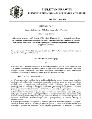 BIULETYN PRAWNY UNIWERSYTETU MIKOŁAJA KOPERNIKA W TORUNIU Rok 2015; poz. 171 UCHWAŁA Nr 87 Senatu Uniwersytetu Mikołaja Kopernika w Toruniu z dnia 26 maja 2015 r. zmieniająca uchwałę Nr 37 Senatu UMK z dnia 25 marca 2014 r. w sprawie określenia szczegółowych zasad przyjmowania na studia laureatów i finalistów olimpiad stopnia centralnego, laureatów konkursów ogólnopolskich oraz kandydatów posiadających osiągnięcia sportowe Na podstawie art. 169 ust. 8 i 9 ustawy z dnia 27 lipca 2005 r. Prawo o szkolnictwie wyższym (t.j. Dz. U. z 2012, poz. 572 ze zm.) S e n a t uchwala, co następuje: §1 W uchwale Nr 37 Senatu Uniwersytetu Mikołaja Kopernika w Toruniu z dnia 25 marca 2014 r. w sprawie określenia szczegółowych zasad przyjmowania na studia laureatów i finalistów olimpiad stopnia centralnego, laureatów konkursów ogólnopolskich oraz kandydatów posiadających osiągnięcia sportowe, wprowadza się następujące zmiany: 1. § 4 ust. 1, 4, 5 otrzymuje brzmienie: „1. W postępowaniu kwalifikacyjnym na kierunki chemia, chemia kosmetyczna, materiały współczesnych technologii, pedagogika, pedagogika specjalna, praca socjalna, technologie proekologiczne i zarządzanie środowiskiem, międzywydziałowe indywidualne studia humanistyczne prowadzone w kampusie toruńskim maksymalną liczbę punktów uzyskują laureaci Ogólnopolskiego Konkursu Chemicznego im. Antoniego Swinarskiego. 4. W postępowaniu kwalifikacyjnym na kierunki ekonomia, matematyka i ekonomia, finanse i rachunkowość, komunikacja i psychologia w biznesie, zarządzanie oraz pedagogika, pedagogika specjalna, praca socjalna prowadzone w kampusie toruńskim maksymalną liczbę punktów uzyskują laureaci Ogólnopolskiego Konkursu Wiedzy o Ekonomii i Gospodarce im. Profesora Kazimierza Sokołowskiego oraz Ogólnopolskiego Konkursu Wiedzy o Rachunkowości. 5. W postępowaniu kwalifikacyjnym na kierunki geografia, nauczanie przyrody, turystyka i rekreacja, studia miejskie, technologie proekologiczne i zarządzanie środowiskiem oraz pedagogika, pedagogika specjalna, praca socjalna prowadzone w kampusie toruńskim maksymalną liczbę punktów uzyskują laureaci Ogólnopolskiego Konkursu „Wielki Test Wiedzy Geograficznej”.” §2 Uchwała wchodzi w życie z dniem 26 maja 2015 r. Przewodniczący Senatu prof. dr hab. Andrzej Tretyn Rektor