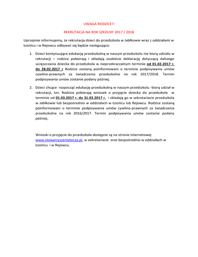 UWAGA RODZICE!! REKRUTACJA NA ROK SZKOLNY 2017 / 2018 Uprzejmie informujemy, że rekrutacja dzieci do przedszkola w Jabłkowie wraz z oddziałami w Łosińcu i w Rejowcu odbywać się będzie następująco: 1. Dzieci kontynuujące edukację przedszkolną w naszym przedszkolu nie biorą udziału w rekrutacji – rodzice pobierają i składają osobiście deklarację dotyczącą dalszego uczęszczania dziecka do przedszkola w nieprzekraczalnym terminie od 01.02.2017 r. do 28.02.2017 r Rodzice zostaną poinformowani o terminie podpisywania umów cywilno-prawnych za świadczenia przedszkolne na rok 2017/2018. Termin podpisywania umów zostanie podany później. 2. Dzieci chcące rozpocząć edukację przedszkolną w naszym przedszkolu -biorą udział w rekrutacji, tzn. Rodzice pobierają wniosek o przyjęcie dziecka do przedszkola w terminie od 01.03.2017 r. do 31.03.2017 r. i składają go w sekretariacie przedszkola w Jabłkowie lub bezpośrednio w oddziałach w Łosińcu lub Rejowcu. Rodzice zostaną poinformowani o terminie podpisywania umów cywilno-prawnych za świadczenia przedszkolne na rok 2016/2017. Termin podpisywania umów zostanie podany później. Wnioski o przyjęcie do przedszkola dostępne są na stronie internetowej www.stowarzyszenietecza.pl, w sekretariacie oraz bezpośrednio w oddziałach w Łosińcu i w Rejowcu.
