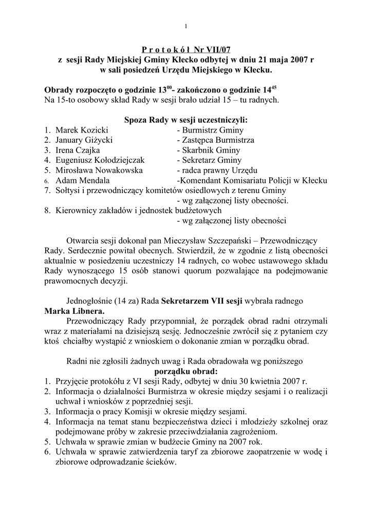 1 P r o t o k ó ł Nr VII/07 z sesji Rady Miejskiej Gminy Kłecko odbytej w dniu 21 maja 2007 r w sali posiedzeń Urzędu Miejskiego w Kłecku. Obrady rozpoczęto o godzinie 1300- zakończono o godzinie 1445 Na 15-to osobowy skład Rady w sesji brało udział 15 – tu radnych. 1. 2. 3. 4. 5. 6. 7. 8. Spoza Rady w sesji uczestniczyli: Marek Kozicki - Burmistrz Gminy January Giżycki - Zastępca Burmistrza Irena Czajka - Skarbnik Gminy Eugeniusz Kołodziejczak - Sekretarz Gminy Mirosława Nowakowska - radca prawny Urzędu Adam Mendala -Komendant Komisariatu Policji w Kłecku Sołtysi i przewodniczący komitetów osiedlowych z terenu Gminy - wg załączonej listy obecności. Kierownicy zakładów i jednostek budżetowych - wg załączonej listy obecności Otwarcia sesji dokonał pan Mieczysław Szczepański – Przewodniczący Rady. Serdecznie powitał obecnych. Stwierdził, że w zgodnie z listą obecności aktualnie w posiedzeniu uczestniczy 14 radnych, co wobec ustawowego składu Rady wynoszącego 15 osób stanowi quorum pozwalające na podejmowanie prawomocnych decyzji. Jednogłośnie (14 za) Rada Sekretarzem VII sesji wybrała radnego Marka Libnera. Przewodniczący Rady przypomniał, że porządek obrad radni otrzymali wraz z materiałami na dzisiejszą sesję. Jednocześnie zwrócił się z pytaniem czy ktoś chciałby wystąpić z wnioskiem o dokonanie zmian w porządku obrad. 1. 2. 3. 4. 5. 6. Radni nie zgłosili żadnych uwag i Rada obradowała wg poniższego porządku obrad: Przyjęcie protokółu z VI sesji Rady, odbytej w dniu 30 kwietnia 2007 r. Informacja o działalności Burmistrza w okresie między sesjami i o realizacji uchwał i wniosków z poprzedniej sesji. Informacja o pracy Komisji w okresie między sesjami. Informacja na temat stanu bezpieczeństwa dzieci i młodzieży szkolnej oraz podejmowane próby w zakresie przeciwdziałania zagrożeniom. Uchwała w sprawie zmian w budżecie Gminy na 2007 rok. Uchwała w sprawie zatwierdzenia taryf za zbiorowe zaopatrzenie w wodę i zbiorowe odprowadzanie ścieków. 2 7. Uchwała w sprawie zatwierdzenia miejscowego planu zagospodarowania przestrzennego terenów zabudowy mieszkaniowej jednorodzinnej oraz letniskowej w Wilkowyji, działki nr ewid. 110, 111 i 168. 8. Uchwała w sprawie przekazania Policji środków finansowych na dodatkowe służby prewencyjne na terenie Gminy Kłecko. 9. Interpelacje i zapytania radnych 10.Wolne wnioski i informacje. Przebieg obrad: Pkt 1. Przewodniczący Rady poinformował, że protokół z VI sesji Rady odbytej w dniu 30 kwietnia 2007 r. w okresie między sesjami był wyłożony do wglądu zainteresowanym. Oświadczył, że protokół czytał i że odzwierciedla przebieg obrad. W związku z tym, że każdy miał możliwość zapoznania się z treścią protokółu zaproponował zgłaszanie uwag i poprawek do protokółu i przyjęcie go bez odczytywania na dzisiejszej sesji. Radni nie zgłosili uwag do protokołu i do propozycji przyjęcia bez odczytywania. Rada jednogłośnie (14 za ) przyjęła protokół Nr VI/07 z dnia 30 kwietnia 2007 r. Pkt 2. Burmistrz Gminy –Marek Kozicki – poinformował o realizacji uchwał. – wg załącznika nr 1 do protokołu. Ponadto poinformował o działaniach bieżących w okresie między sesjami. Radni informacje przyjęli bez uwag przez aklamację. Pkt 3. Przewodniczący Komisji Rady przedstawili informacje o działaniach Komisji w okresie między sesjami Rady: - Przewodniczący Komisji - Roman Winiarski – poinformował o pracy Komisji Rewizyjnej – wg załącznika nr 2. - Przewodniczący Komisji Rolno – Gospodarczej – Marian Kaszyński – wg załącznika nr 3. - Przewodniczący Komisji Oświatowo Społecznej – Waldemar Gołochowicz – wg załącznika nr 4. (O godzinie 1330 na sesję przyszedł radny Mariusz Kasprzyk – Rada obradowała w pełnym 15-to osobowym składzie) 3 Przewodniczący Komisji poinformował Radę, że w posiedzeniu Komisji brał udział przedstawiciel firmy NTB SPA, który przedstawił propozycję pobudowania na terenie Gminy Kłecko ośrodka wypoczynkowego. Wyraził wolę kupna działki gminnej przy jeziorze (w miejscu, gdzie obecnie odbywają się biwaki młodzieży organizowane przez MGOK). Zapewniał, że funkcjonowanie ośrodka odnowy biologicznej i wypoczynkowego w Kłecku na pewno wpłynie na rozwój turystyki i napływ gości. Złożył wniosek w sprawie kupna działki. Burmistrz wyjaśnił, że działka ta nie jest jeszcze przez Radę przeznaczona do sprzedaży, na dzisiejszą sesje nie można było przygotować odpowiedniego projektu uchwały, ponieważ w obrębie działki znajduje się droga dojazdowa do kąpieliska i musi być geodezyjne wyłączona. Uwag do pracy Komisji nie zgłoszono, informacje zostały przyjęte przez aklamację. Pkt 4. Przewodniczący Rady poinformował obecnych, że wysłał zaproszenie do Sądu Rejonowego w Gnieźnie z prośba o przedstawienie informacji dotyczącej bezpieczeństwa dzieci i młodzieży, informacji nie dostarczono, również nikt nie przybył na posiedzenie Rady. Poprosił Komendanta Komisariatu Policji w Kłecku – Adama Mendala o przedstawienie analizy stanu bezpieczeństwa dzieci i młodzieży szkolnej na terenie Gminy Kłecko. Komendant Komisariatu policji przestawił informację – wg załącznika nr 5 do protokołu. Informację uzupełnił Dyrektor Gimnazjum w Kłecku – Zbigniew Beling. Powiedział, że współpraca szkoły z Policją układa się bardzo dobrze, głównie dlatego, że wszystkie negatywne zdarzenia powstałe w szkole są zgłaszane Policji i reakcja jest każdorazowa i natychmiastowa. Problemem jest, że w konsekwencji sąd wymierza bardzo małe kary, lub zupełnie odstępuje od wyznaczenia kary, co ma wpływ na dalsze zachowanie młodzieży. Bardzo często w środowisku taki uczeń staje się bohaterem dla rówieśników i obawa aby jego naganne czyny nie były naśladowane przez innych uczniów. Radny Jacek Molenda – zapytał czy na naszym te
