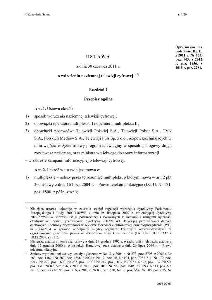 ©Kancelaria Sejmu s. 1/26 Opracowano na podstawie: Dz. U. z 2011 r. Nr 153, poz. 903, z 2012 r. poz. 1456, z 2015 r. poz. 2281. USTAWA z dnia 30 czerwca 2011 r. o wdrożeniu naziemnej telewizji cyfrowej 1), 2) Rozdział 1 Przepisy ogólne Art. 1. Ustawa określa: 1) sposób wdrożenia naziemnej telewizji cyfrowej; 2) obowiązki operatora multipleksu I i operatora multipleksu II; 3) obowiązki nadawców: Telewizji Polskiej S.A., Telewizji Polsat S.A., TVN S.A., Polskich Mediów S.A., Telewizji Puls Sp. z o.o., rozpowszechniających w dniu wejścia w życie ustawy program telewizyjny w sposób analogowy drogą rozsiewczą naziemną, oraz ministra właściwego do spraw informatyzacji – w zakresie kampanii informacyjnej o telewizji cyfrowej. Art. 2. Ilekroć w ustawie jest mowa o: 1) multipleksie – należy przez to rozumieć multipleks, o którym mowa w art. 2 pkt 20a ustawy z dnia 16 lipca 2004 r. – Prawo telekomunikacyjne (Dz. U. Nr 171, poz. 1800, z późn. zm. 3)); 1) 2) 3) Niniejsza ustawa dokonuje w zakresie swojej regulacji wdrożenia dyrektywy Parlamentu Europejskiego i Rady 2009/136/WE z dnia 25 listopada 2009 r. zmieniającej dyrektywę 2002/22/WE w sprawie usługi powszechnej i związanych z sieciami i usługami łączności elektronicznej praw użytkowników, dyrektywę 2002/58/WE dotyczącą przetwarzania danych osobowych i ochrony prywatności w sektorze łączności elektronicznej oraz rozporządzenie (WE) nr 2006/2004 w sprawie współpracy między organami krajowymi odpowiedzialnymi za egzekwowanie przepisów prawa w zakresie ochrony konsumentów (Dz. Urz. UE L 337 z 18.12.2009, str. 11). Niniejszą ustawą zmienia się: ustawę z dnia 29 grudnia 1992 r. o radiofonii i telewizji, ustawę z dnia 15 grudnia 2000 r. o Inspekcji Handlowej oraz ustawę z dnia 26 lipca 2004 r. – Prawo telekomunikacyjne. Zmiany wymienionej ustawy zostały ogłoszone w Dz. U. z 2004 r. Nr 273, poz. 2703, z 2005 r. Nr 163, poz. 1362 i Nr 267, poz. 2258, z 2006 r. Nr 12, poz. 66, Nr 104, poz. 708 i 711, Nr 170, poz. 1217, Nr 220, poz. 1600, Nr 235, poz. 1700 i Nr 249, poz. 1834, z 2007 r. Nr 23, poz. 137, Nr 50, poz. 331 i Nr 82, poz. 556, z 2008 r. Nr 17, poz. 101 i Nr 227, poz. 1505, z 2009 r. Nr 11, poz. 59, Nr 18, poz. 97 i Nr 85, poz. 716, z 2010 r. Nr 81, poz. 530, Nr 86, poz. 554, Nr 106, poz. 675, Nr 2016-02-09 ©Kancelaria Sejmu 2) s. 2/26 nadawcy – należy przez to rozumieć nadawcę, o którym mowa w art. 4 pkt 5 ustawy z dnia 29 grudnia 1992 r. o radiofonii i telewizji (Dz. U. z 2011 r. Nr 43, poz. 226, Nr 85, poz. 459 i Nr 112, poz. 654); 3) odbiorniku cyfrowym – należy przez to rozumieć odbiornik cyfrowy, o którym mowa w art. 2 pkt 23a ustawy z dnia 16 lipca 2004 r. – Prawo telekomunikacyjne; 4) okresie przejściowym – należy przez to rozumieć okres wykorzystywania częstotliwości w służbie radiodyfuzyjnej w celu równoczesnego rozpowszechniania programu telewizyjnego w sposób analogowy i cyfrowy drogą rozsiewczą naziemną; 5) operatorze sieci nadawczej – należy przez to rozumieć operatora sieci nadawczej, o którym mowa w art. 2 pkt 23c ustawy z dnia 16 lipca 2004 r. – Prawo telekomunikacyjne; 6) sygnale multipleksu – należy przez to rozumieć sygnał multipleksu, o którym mowa w art. 2 pkt 38a ustawy z dnia 16 lipca 2004 r. – Prawo telekomunikacyjne; 7) użytkowniku – należy przez to rozumieć osobę, która posiada odbiornik cyfrowy w stanie umożliwiającym natychmiastowy odbiór programu telewizyjnego. Art. 3. 1. Wdrożenie naziemnej telewizji cyfrowej polega na: 1) równoczesnym rozpowszechnianiu, w okresie przejściowym, programów telewizyjnych w sposób analogowy i cyfrowy drogą rozsiewczą naziemną; 2) zakończeniu rozpowszechniania programów telewizyjnych w sposób analogowy drogą rozsiewczą naziemną przez nadawców, o których mowa w art. 4 ust. 1. 2. Wdrożenia naziemnej telewizji cyfrowej dokonuje się na poszczególnych obszarach terytorium Rzeczypospolitej Polskiej, zwanym dalej „terytorium RP”, zgodnie z terminami określonymi przez Prezesa Urzędu Komunikacji Elektronicznej, zwanego dalej „Prezesem UKE”, nie później niż do dnia 31 lipca 2013 r. 3. Minister właściwy do spraw informatyzacji może w roku 2013 przekazać ze środków budżetu państwa dotację celową dla jednostek telewizji publicznej, o 182, poz. 1228, Nr 219, poz. 1443, Nr 229, poz. 1499 i Nr 238, poz. 1578 oraz z 2011 r. Nr 102, poz. 586 i 587, Nr 134, poz. 779 i Nr 153, poz. 903. 2016-02-09 ©Kancelaria Sejmu s. 3/26 których mowa w art. 26 ust. 1 i 2 ustawy z dnia 29 grudnia 1992 r. o radiofonii i telewizji (Dz. U. z 2011 r. Nr 43, poz. 226, z późn. zm. 4)), z przeznaczeniem na odtworzenie sygnału analogowego w nadawaniu sygnału cyfrowego telewizji. Art. 4. 1. Telewizja Polska S.A., rozpowszechniająca w dniu wejścia w życie ustawy w sposób analogowy drogą rozsiewczą naziemną programy telewizyjne: „Telewizja Polska I”, „Telewizja Polska II” oraz regionalne programy telewizyjne, a także Telewizja Polsat S.A., TVN S.A., Polskie Media S.A., Telewizja Puls Sp. z o.o., rozpowszechniające w dniu wejścia w życie ustawy programy telewizyjne na podstawie koncesji na rozpowszechnianie tych programów w sposób analogowy drogą rozsiewczą naziemną, są obowiązani zaprzestać wykorzystywania częstotliwości w służbie radiodyfuzyjnej do tego wykorzystywanych, do dnia 31 lipca 2013 r., z zastrzeżeniem ust. 2. 2. Nadawca rozpowszechniający w dniu wejścia w życie ustawy program, o którym mowa w ust. 1, jest obowiązany zaprzestać wykorzystywania częstotliwości w służbie radiodyfuzyjnej do tego wykorzystywanych, na poszczególnych obszarach terytorium RP, przed dniem 31 lipca 2013 r., jeżeli termin taki został określony przez Prezesa UKE na podstawie art. 3 ust. 2. 3. Prezes UKE w przypadku zmiany terminu rozpoczęcia i zakończenia okresu przejściowego na poszczególnych obszarach terytorium RP niezwłocznie inform