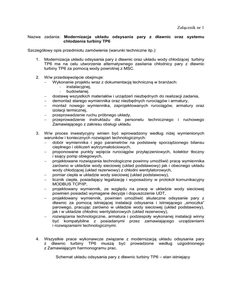 Załącznik nr 1 Nazwa zadania: Modernizacja układu odsysania pary z dławnic oraz systemu chłodzenia turbiny TP6 Szczegółowy opis przedmiotu zamówienia (warunki techniczne itp.): 1. Modernizacja układu odsysania pary z dławnic oraz układu wody chłodzącej turbiny TP6 ma na celu utworzenie alternatywnego zasilania chłodnicy pary z dławnic turbiny TP6 za pomocą wody powrotnej z MSC. 2. W/w przedsięwzięcie obejmuje: Wykonanie projektu wraz z dokumentacją techniczną w branżach: - instalacyjnej, - budowlanej. dostawę wszystkich materiałów i urządzeń niezbędnych do realizacji zadania, demontaż starego wymiennika oraz niezbędnych rurociągów i armatury, montaż nowego wymiennika, zaprojektowanych rurociągów, armatury oraz izolacji termicznej, przeprowadzenie ruchu próbnego układy, przeprowadzenie instruktażu dla personelu technicznego i ruchowego Zamawiającego z zakresu obsługi układu. 3. W/w proces inwestycyjny winien być wprowadzony według niżej wymienionych warunków i koniecznych rozwiązań technologicznych: dobór wymiennika i jego parametrów na podstawię sporządzonego bilansu cieplnego i obliczeń wytrzymałościowych, proponowane punkty wpięcia rurociągów przyłączeniowych, kolektor tłoczny i ssący pomp obiegowych, projektowane rozwiązania technologiczne powinny umożliwić pracę wymiennika zarówno w układzie wody sieciowej (układ podstawowy) jak i obecnego układu wody chłodzącej (układ rezerwowy) z chłodni wentylatorowych, pomiar ciepła w układzie wody sieciowej (układ podstawowy), licznik ciepła, posiadający legalizację i wyposażony w protokół komunikacyjny MODBUS TCP/IP, projektowany wymiennik, ze względu na pracę w układzie wody sieciowej powinien posiadać wymagane decyzje i dopuszczenie UDT, projektowany wymiennik, powinien umożliwić skuteczne odsysanie pary z dławnic za pomocą istniejącej instalacji odsysania i istniejącego „smoczka” parowego, pracując zarówno w układzie wody sieciowej (układ podstawowy), jak i w układzie chłodnic wentylatorowych (układ rezerwowy), rozwiązania technologiczne, armatura i podzespoły wykonanej instalacji winny być kompatybilne z posiadanymi przez zamawiającego urządzeniami i rozwiązaniami technologicznymi. 4. Wszystkie prace wykonawcze związane z modernizacją układu odsysania pary z dławnic turbiny TP6 muszą być prowadzone według uzgodnionego z Zamawiającym harmonogramu prac. Schemat układu odsysania pary z dławnic turbiny TP6 – stan istniejący Załącznik nr 1 5. Obecnie zainstalowany schładzacz Przemysłowych w Nysie o parametrach: typ: przepływ wody powierzchnia wymiany ciepła: płaszcz: - ciśnienie - temperatura rury: - ciśnienie - temperatura pary produkcji Zakładu Urządzeń 7126471-2 40 m3/h 7,2 m2 0,8ata 96°C 2ata 17°C 6. Parametry wody z chłodni wentylatorowych (układ rezerwowy): temperatura wody 20˚C, ciśnienie: 0,2 ÷ 0,4MPa 7. Parametry wody sieciowej (układ podstawowy): temperatura wody 40˚C ÷ 60˚C, ciśnienie: 0,5 ÷ 1,2MPa max - 1,5MPa. 8. Ciepło do odebrania z układu odsysania ok. 0,7 GJ/h ÷ 1,5 GJ/h Ilość ciepła wyliczona została na podstawie tabeli przepływu wody zaworu precyzyjnej regulacji i jest szacunkowa – brak możliwości pomiaru przepływu wody przez wymiennik z układu chłodzenia turbin. Poniżej przedstawiono zdjęcia poglądowe istniejącego wymiennika, instalacji i armatury Załącznik nr 1 s