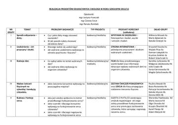 REALIZACJA PROJEKTÓW EDUKACYJNYCH Z BIOLOGII W ROKU SZKOLNYM 2012/13 Opiekunki: mgr Justyna Franczak mgr Żaneta Foryt mgr Renata Rembek NR TEMAT GRUPY I Sposób odżywiania – diety. PROBLEMY BADAWCZE II Uzależnienia – ich przyczyny i skutki. III Rodzaje diet. TYP PROJEKTU PRODUKT KOŃCOWY (zakładany) WYSTAWA W ZASZKLENIU – fotoreportaż z badań, wyniki i wnioski z badań. Czy i jakie diety mogą stosować nastolatki? W jak sposób należy stosować określone diety? Dlaczego ludzie się uzależniają? Jak wybrane uzależnienia wpływają na zdrowie psychiczne i fizyczne? badawczy/medialny Co sądzą ludzie na temat wybranych diet? Jak wybrane diety wpływają na organizm człowieka? badawczy/edukacyjny/ FILM dla klasy przedstawiający medialny wyniki badań oraz informacje dotyczące wpływu wybranych diet na organizm człowieka. badawczy/medialny STRONA INTERNETOWA – poświęcona przyczynom i skutkom wybranych uzależnień. IV Wpływ ćwiczeń fizycznych na sylwetkę i kondycję człowieka. Jakie ćwiczenia korzystnie wpływają na poszczególne mięśnie? badawczy/edukacyjny ZESTAW ĆWICZEŃ POKAZOWYCH oraz LEKCJA dla klasy propagująca codzienne ćwiczenia fizyczne. V Budowa i funkcje serca. Jaka jest wiedza społeczna na temat prawidłowego funkcjonowania serca? Jakie czynniki i dlaczego korzystnie wpływają na funkcjonowanie serca człowieka? Jakie czynniki i dlaczego negatywnie wpływają na funkcjonowanie serca badawczy/medialny GAZETA Z PŁYTĄ CD zawierająca artykuły wyjaśniające od czego zależy prawidłowe funkcjonowanie serca oraz promująca zachowania człowieka, które sprzyjają i zagrażają naszemu sercu. SKŁAD GRUPY Wiktoria Mrozek IIa Marta Bębenek IIa Natalia Doleżyk IIa Krzysztof Kaczka IIa Wojtek Pitas IIa Damian Łabędzki IIa Krystian Zieliński IIc Robert Szlachciak IIc Karolina Jurkowska IIb Małgosia Jakubowska IIb Julia Czapla IIb Sonia Kiersnowska IIb Magda Gołuchowska IIb Paulina Nowak IIb Basia Rostańska IIb Patrycja Szczerbowska IIb Natalia Wycisk IIb Dorota Milik IIb Weronika Pawłowska IId Marta Jaszcza IId Olga Choroba IId Kryspin Śliwiński IId Kamil Peteja IId Adam Matysik IId VI VII VIII Wpływ palenia papierosów na zdrowie. Wpływ codziennych ćwiczeń fizycznych na kondycję sportowca. Funkcjonowanie zmysłów i mózgu człowieka. człowieka? Jakie są przyczyny uzależniania się nikotyną wśród nastolatków? Jaką cenę ponosi człowiek w swoim życiu, kiedy w młodości uzależnia się od papierosów? Jak treningi wpływają na kondycję sportowców? Jakie znaczenie mają poszczególne ćwiczenia rozgrzewki dla osób trenujących piłkę nożną? W jaki sposób odbierane i przetwarzane są przez człowieka sygnały z otoczenia? Co jest powodem określonych reakcji na bodźce? badawczy/edukacyjny PRELEKCJA PROFILAKTYCZNA dla uczniów Szkoły Podstawowej nr 36. medialny/edukacyjny FILM EDUKACYJNY dla klas sportowych pokazujący ćwiczenia rozgrzewki z komentarzem zawodników i trenera. badawczy/edukacyjny LEKCJA MULTIMEDIALNA dla klasy pokazująca sposób reagowania określonych narządów zmysłów na dany bodziec.. Izabela Szewczyk IId Patrycja Wieczorek IId Michał Solecki IId Ania Korzekwa IIa Julia Drabek IIa Wojtek Grociak IIe Konrad Powała IIe Mateusz Wasik IIe Bartek Suszek IIe Artur Mkrtchyan IIe Kamil Lemik IIe Mariusz Kuchta IIe Damian Polaczek IIe Kuba Leda IIe Konrad Kowalczk IIe Mateusz Sapek IIe Filip Widurski IIe