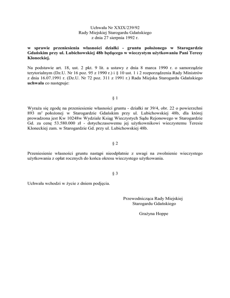 Uchwała Nr XXIX/239/92 Rady Miejskiej Starogardu Gdańskiego z dnia 27 sierpnia 1992 r. w sprawie przeniesienia własności działki - gruntu położonego w Starogardzie Gdańskim przy ul. Lubichowskiej 48b będącego w wieczystym użytkowaniu Pani Teresy Kloneckiej. Na podstawie art. 18, ust. 2 pkt. 9 lit. a ustawy z dnia 8 marca 1990 r. o samorządzie terytorialnym (Dz.U. Nr 16 poz. 95 z 1990 r.) i § 10 ust. 1 i 2 rozporządzenia Rady Ministrów z dnia 16.07.1991 r. (Dz.U. Nr 72 poz. 311 z 1991 r.) Rada Miejska Starogardu Gdańskiego uchwala co następuje: §1 Wyraża się zgodę na przeniesienie własności gruntu - działki nr 39/4, obr. 22 o powierzchni 893 m2 położonej w Starogardzie Gdańskim przy ul. Lubichowskiej 48b, dla której prowadzona jest Kw 10248w Wydziale Ksiąg Wieczystych Sądu Rejonowego w Starogardzie Gd. za cenę 53.580.000 zł - dotychczasowemu jej użytkownikowi wieczystemu Teresie Kloneckiej zam. w Starogardzie Gd. przy ul. Lubichowskiej 48b. §2 Przeniesienie własności gruntu nastąpi nieodpłatnie z uwagi na zwolnienie wieczystego użytkowania z opłat rocznych do końca okresu wieczystego użytkowania. §3 Uchwała wchodzi w życie z dniem podjęcia. Przewodnicząca Rady Miejskiej Starogardu Gdańskiego Grażyna Hoppe