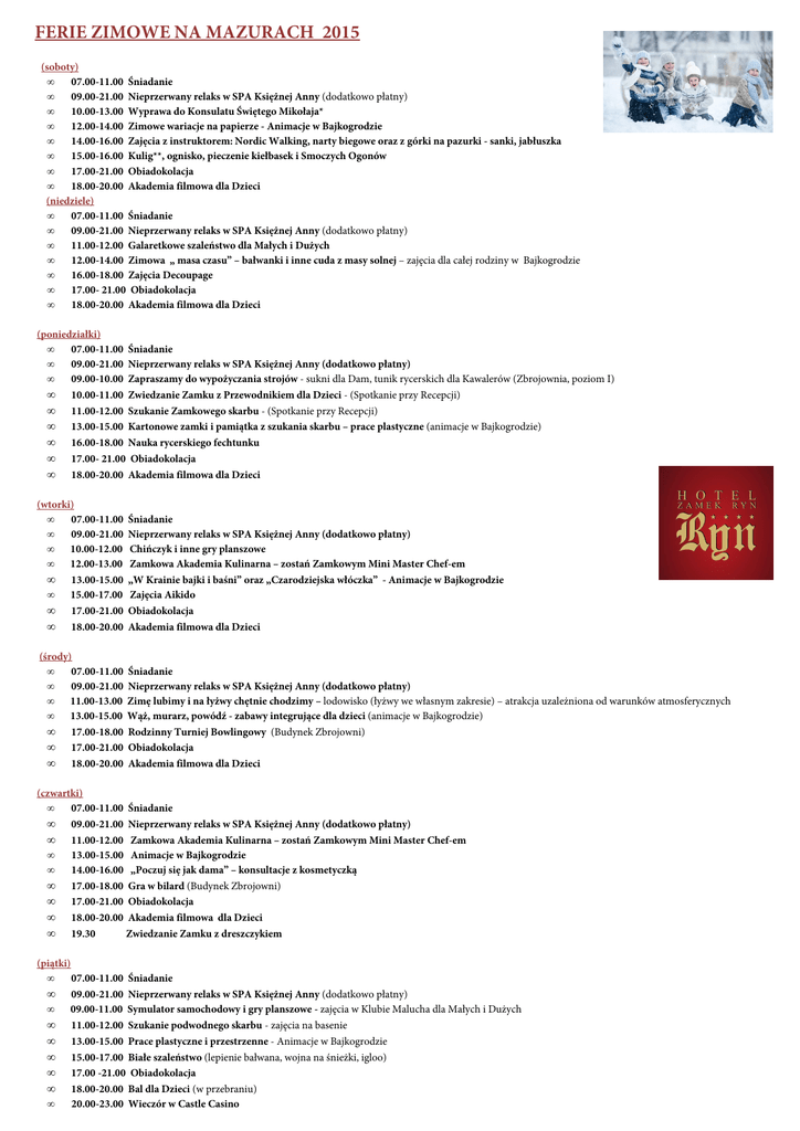 FERIE ZIMOWE NA MAZURACH 2015 (soboty) • 07.00-11.00 Śniadanie • 09.00-21.00 Nieprzerwany relaks w SPA Księżnej Anny (dodatkowo płatny) • 10.00-13.00 Wyprawa do Konsulatu Świętego Mikołaja* • 12.00-14.00 Zimowe wariacje na papierze - Animacje w Bajkogrodzie • 14.00-16.00 Zajęcia z instruktorem: Nordic Walking, narty biegowe oraz z górki na pazurki - sanki, jabłuszka • 15.00-16.00 Kulig**, ognisko, pieczenie kiełbasek i Smoczych Ogonów • 17.00-21.00 Obiadokolacja • 18.00-20.00 Akademia filmowa dla Dzieci (niedziele) • 07.00-11.00 Śniadanie • 09.00-21.00 Nieprzerwany relaks w SPA Księżnej Anny (dodatkowo płatny) • 11.00-12.00 Galaretkowe szaleństwo dla Małych i Dużych • 12.00-14.00 Zimowa „ masa czasu” – bałwanki i inne cuda z masy solnej – zajęcia dla całej rodziny w Bajkogrodzie • 16.00-18.00 Zajęcia Decoupage • 17.00- 21.00 Obiadokolacja • 18.00-20.00 Akademia filmowa dla Dzieci (poniedziałki) • 07.00-11.00 Śniadanie • 09.00-21.00 Nieprzerwany relaks w SPA Księżnej Anny (dodatkowo płatny) • 09.00-10.00 Zapraszamy do wypożyczania strojów - sukni dla Dam, tunik rycerskich dla Kawalerów (Zbrojownia, poziom I) • 10.00-11.00 Zwiedzanie Zamku z Przewodnikiem dla Dzieci - (Spotkanie przy Recepcji) • 11.00-12.00 Szukanie Zamkowego skarbu - (Spotkanie przy Recepcji) • 13.00-15.00 Kartonowe zamki i pamiątka z szukania skarbu – prace plastyczne (animacje w Bajkogrodzie) • 16.00-18.00 Nauka rycerskiego fechtunku • 17.00- 21.00 Obiadokolacja • 18.00-20.00 Akademia filmowa dla Dzieci (wtorki) • 07.00-11.00 • 09.00-21.00 • 10.00-12.00 • 12.00-13.00 • 13.00-15.00 • 15.00-17.00 • 17.00-21.00 • 18.00-20.00 Śniadanie Nieprzerwany relaks w SPA Księżnej Anny (dodatkowo płatny) Chińczyk i inne gry planszowe Zamkowa Akademia Kulinarna – zostań Zamkowym Mini Master Chef-em „W Krainie bajki i baśni” oraz „Czarodziejska włóczka” - Animacje w Bajkogrodzie Zajęcia Aikido Obiadokolacja Akademia filmowa dla Dzieci (środy) • 07.00-11.00 • 09.00-21.00 • 11.00-13.00 • 13.00-15.00 • 17.00-18.00 • 17.00-21.00 • 18.00-20.00 Śniadanie Nieprzerwany relaks w SPA Księżnej Anny (dodatkowo płatny) Zimę lubimy i na łyżwy chętnie chodzimy – lodowisko (łyżwy we własnym zakresie) – atrakcja uzależniona od warunków atmosferycznych Wąż, murarz, powódź - zabawy integrujące dla dzieci (animacje w Bajkogrodzie) Rodzinny Turniej Bowlingowy (Budynek Zbrojowni) Obiadokolacja Akademia filmowa dla Dzieci (czwartki) • 07.00-11.00 Śniadanie • 09.00-21.00 Nieprzerwany relaks w SPA Księżnej Anny (dodatkowo płatny) • 11.00-12.00 Zamkowa Akademia Kulinarna – zostań Zamkowym Mini Master Chef-em • 13.00-15.00 Animacje w Bajkogrodzie • 14.00-16.00 „Poczuj się jak dama” – konsultacje z kosmetyczką • 17.00-18.00 Gra w bilard (Budynek Zbrojowni) • 17.00-21.00 Obiadokolacja • 18.00-20.00 Akademia filmowa dla Dzieci • 19.30 Zwiedzanie Zamku z dreszczykiem (piątki) • 07.00-11.00 Śniadanie • 09.00-21.00 Nieprzerwany relaks w SPA Księżnej Anny (dodatkowo płatny) • 09.00-11.00 Symulator samochodowy i gry planszowe - zajęcia w Klubie Malucha dla Małych i Dużych • 11.00-12.00 Szukanie podwodnego skarbu - zajęcia na basenie • 13.00-15.00 Prace plastyczne i przestrzenne - Animacje w Bajkogrodzie • 15.00-17.00 Białe szaleństwo (lepienie bałwana, wojna na śnieżki, igloo) • 17.00 -21.00 Obiadokolacja • 18.00-20.00 Bal dla Dzieci (w przebraniu) • 20.00-23.00 Wieczór w Castle Casino * Atrakcja płatna dodatkowo dla chętnych - KONSULAT ŚWIĘTEGO MIKOŁAJA tel. 664-205-225, dojazd własny ** Dla chętnych w cenie 50 zł/Osoba (rezerwacja pod nr. 604 276 482 najpóźniej dzień przed kuligiem) Atrakcje dodatkowo płatne: (atrakcje uzależnione od warunków atmosferycznych) - Wynajem bojerów z instruktorem - Kulig - Snow – kite - Wyjazd na Górę Czterech Wiatrów (możliwość wynajmu instruktora) CODZIENNIE ZAPRASZAMY: 07.00 - 11.00 Śniadanie - Restauracja Refektarz (Poziom I) 21.00 - 02.00 Castle Night - Club Winiarnia (Poziom „0”) USŁUGI DODATKOWE BEZPŁATNE DLA GOŚCI HOTELU ZAMEK RYN**** * LODOWISKO – u podnóża Zamku na terenie Karczmy Rycerskiej (prosimy o zabranie własnych łyżew)atrakcja uzależniona od warunków atmosferycznych. * KLUB MALUCHA – działa przez całe ferie ; do dyspozycji zabawki, materiały papiernicze, farby, kredki, wycinanki, gry planszowe * Plac zabaw dla dzieci (u stóp Zamku, obok kortu tenisowego) * Korzystanie z Sali Fitness i stołu do tenisa w Zbrojowni (codziennie w godzinach 07.00 - 23.00) * Korzystanie z basenu, jacuzzi i saun (codziennie w godzinach 8.00-22.00) * Wypożyczalnia sprzętu wędkarskiego, kijów do Nordic Walking (codziennie w godzinach 8.00-22.00 - rezerwacja recepcja Basenu tel. 805) USŁUGI PŁATNE NARTY BIEGOWE (teren wokół Jeziora Ołów) SPA KSIĘŻNEJ ANNY – gabinety czynne: poniedziałek – czwartek w godzinach 9.00 - 20.00, piątek – niedziela w godzinach 09.00-21.00 (rezerwacja – tel. 862) ZBROJOWNIA: Kręgielnia, bilard czynne: poniedziałek-piątek od godziny 17.00 po wcześniejszej rezerwacji (recepcja – tel. 9 , restauracja– tel. 818) sobota-niedziela w godz. 15.00-23.00 (rezerwacja – tel. 803) * KORT TENISOWY - 20 zł za godzinę (zapisy prowadzi Recepcja Basenu tel. 805) * ROWERY – 5 zł za godzinę, 40 zł za dzień (zapisy prowadzi Recepcja Basenu tel. 805) INDYWIDUALNA OPIEKA DO DZIECI W CZASIE POBYTU zapisy przyjmuje Recepcja Basenu (tel. 805) ATRAKCJE W BLISKIEJ OKOLICY (PŁATNE DODATKOWO) KRYTE LODOWISKO tel. 503 080 302 w godzinach 7.00 - 15.00 oraz 507 044 808 GÓRA CZTERECH WIATRÓW – WYCIĄG NARCIARSKI tel. 89 741-29-24, 89 741-25-53, 506 141 528 oraz 604 816 246
