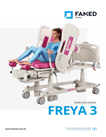 Łóżko porodowe Freya 3 www.famed.com.pl Produkt został wykonany z materiałów, o właściwościach antybakteryjnych. Łóżko porodowe Poręcz boczna Freya 3 Materacyk dla noworodka Uchwyt ręki Panel centralny Podkolannik Wyjmowany szczyt nóg Nowoczesne czterosegmentowe łóżko porodowe ze stałym segmentem siedzenia, wsparte na 3 kolumnach, sterowane elektrycznie. Łóżko wyposażone jest w funkcje zmiany wysokości leża, zmiany kąta nachylenia oparcia pleców i segmentu udowego, przechyły wzdłużne (Trendelenburga i anty-Trendelenburga) i funkcję natychmiastowego zwalniania oparcia pleców (CPR). Łóżko wyposażone jest w trzy systemy sterowania: centralny panel sterujący (supervisor), pilot przewodowy i panele sterujące w poręczach bocznych. Dla zwiększenia bezpieczeństwa pacjentki panele sterujące umieszczone w wewnętrznych stronach poręczy wyposażone są w funkcje nocnego podświetlania podłogi i przywoływania personelu medycznego. Z tego samego powodu funkcje pilota przewodowego wymagają zatwierdzenia przy pomocy specjalnego kluczyka. Panele sterujące w zewnętrznych stronach poręczy bocznych pozwalają na szybkie uzyskanie pozycji Trendelenburga i antyTrendelenburga. Centralny panel sterujący pozwala na uzyskanie pozycji Fowlera, pozycji zero, pozycji do badań i pozycji krzesła kardiologicznego. Panel sterujący Gniazdo wieszaka kroplówki lub uchwytu rąk Krążek odbojowy Dźwignia szybkiego zwalniania segmentu oparcia pleców (CPR) Haczyki na woreczki do płynów fizjologicznych Dźwignia uruchomienia centralnej blokady kół Listwa do mocowania dodatkowego wyposażenia Wyposażenie standardowe Materacyk dla noworodka 2 Zdejmowane wkłady tworzywowe i miska na płyny fizjologiczne Centralny panel sterujący (supervisor) Dźwignia szybkiego zwalniania segmentu oparcia pleców (CPR) Podnóżki Podkolanniki 3 Zalety łóżka Freya: • Szeroki zakres mozliwych ustawień pozycji • Trzy systemy sterowania (z czego jeden dla pacjentki) • Niski poziom leża, ułatwiający wstawanie • Bardzo dobre parametry techniczne Badanie rektoskopowe Pozycja horyzontalna Pozycja horyzontalna z materacykiem dla noworodka Pozycja półsiedząca Pozycja siedząca Pozycja siedząca Wybrane pozycje łóżka Freya: • Łóżko z łatwością da się przekształcić w fotel zapewniający rodzącej wygodną pozycję w czasie porodu • Pozycja krzesła kardiologicznego • Pozycja do badań • Pozycja Fowlera • Pozycja zerowa Badanie ginekologiczne 4 5 Sterowanie funkcjami elektrycznymi za pomocą: Poręcze boczne wyposażone w mechanizm umożliwiający ich składanie • Centralny panel sterujący (supervisor) • Przewodowy pilot ręczny z blokadą (kluczyk) • Panele sterujące w poręczach od strony zewnętrznej z funkcją pozycji Trendelenburga i anty-Trendelenburga • Panele sterujące w poręczach od strony wewnętrznej z funkcją nocnego podświetlania podłogi i przywoływania personelu medycznego • Sterownik nożny (opcjonalnie) Pozycja anty-Trendelenburga Parametry użytkowe: • Mechanizmy łóżka umożliwiające zmianę wysokości leża, zmianę kątowego położenia oparcia pleców i podudzia, przechył Trendelenburga i antyTrendelenburga oraz przetaczanie. • Możliwość zmiany kąta położenia oparcia pleców za pomocą dźwigni do CPR. • Zmiana wysokości leża, przechyły wzdłużne (Trendelenburg i antyTrendelenburg), zmiana kąta oparcia pleców oraz oparcia nóg (części udowej) wykonywane przy użyciu siłowników elektrycznych. Pozycja Trendelenburga Sterowanie Dostępne szczyty RAL 5002 RAL 5024 RAL 6019 RAL 6027 RAL 1015 RAL 1018 RAL 4010 Dostępne kolory wkładek do szczytów Centralny panel sterujący (supervisor) 6 Centralny panel sterujący i pilot przewodowy Panele sterujące w poręczach bocznych Szczyty tworzywowe w kolorze RAL 9002 z wkładkami 7 Dane techniczne Całkowita długość w pozycji fotelowej 1780 mm ± 20 mm Szerokość maksymalna (z poręczami bocznymi) 965 mm ± 5 mm Minimalna wysokość ramy leża 580 ± 10 mm Maksymalna wysokość ramy leża 980 ± 10 mm Kąt uniesienia siedziska 30° ± 5° Kąt uniesienia oparcia pleców 70° ± 5° Pozycja Trendelenburga 20° ± 2° Pozycja anty-Trendelenburga 20° ± 2° Autoregresja oparcia pleców 120 mm Masa łóżka około 160 kg Dopuszczalne obciążenie 250 kg Dopuszczalne obciążenie segmentu wysuwnego 170 kg Zasilanie 230 V~ 50/60 Hz Pobór mocy max 250 VA Klasa ochrony II Typ części aplikacyjnej B Stopień ochrony co najmniej IP-X4 Okres używania 10 lat Dział Handlowy: tel.: +48 33 866 63 08 tel.: +48 33 866 63 10 tel.: +48 33 866 63 12 tel.: +48 33 866 63 17 fax: +48 33 861 30 79 [email protected] www.famed.com.pl RODUCTIO RP N NE ZY J ST SZA P ODUKC R C Edycja 07/2015/01. Zastrzega się możliwość modyfikacji w wyniku postępu technicznego. Centrala: tel.: +48 33 866 62 00 fax: +48 33 475 58 90 EWORK AM FR Produkt spełnia wymogi Europejskiej Dyrektywy MDD 93/42/EEC dotyczącej wyrobów medycznych oraz Ustawy o wyrobach medycznych Famed Żywiec Sp. z o.o. ul. Fabryczna 1 34-300 Żywiec, Polska A 2165 mm ± 20 mm UNEP IE CLE A Całkowita długość