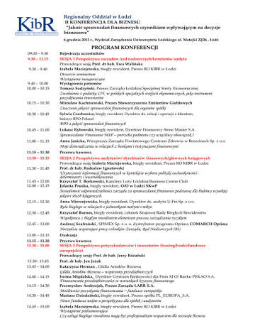 Regionalny Oddział w Łodzi II KONFERENCJA DLA BIZNESU “Jakość sprawozdań finansowych czynnikiem wpływającym na decyzje biznesowe” 6 grudnia 2013 r., Wydział Zarządzania Uniwersytetu Łódzkiego ul. Matejki 22/26 , Łódź PROGRAM KONFERENCJI 09.00 – 9.30 9.30 – 11.15 9.30 – 9.40 Rejestracja uczestników SESJA 1 Perspektywa zarządów /rad nadzorczych/komitetów audytu Prowadząca sesję Prof. dr hab. Ewa Walińska Izabela Maciejewska, biegły rewident, Prezes RO KIBR w Łodzi Otwarcie seminarium Wystąpienie inauguracyjne 9.40 – 10.00 10.00 – 10.15 Wystąpienia patronów Tomasz Sadzyński, Prezes Zarządu Łódzkiej Specjalnej Strefy Ekonomicznej Temat w trakcie Zwolnienie z podatku ustalania CIT, w polskich specjalnych strefach ekonomicznych, jako instrument pozyskiwania inwestorów 10.15 – 10.30 Mirosław Kachniewski, Prezes Stowarzyszenia Emitentów Giełdowych Znaczenie jakości sprawozdań finansowych dla organów spółki 10.30 – 10.45 Sylwia Czechowicz, biegły rewident, Dyrektor ds. relacji i operacji z klientem, Infosys BPO Poland BPO a jakość sprawozdań finansowych 10.45 – 11.00 Łukasz Rybowski, biegły rewident, Dyrektor Finansowy Stone Master S.A. Sprawozdanie Finansowe MSP – potrzeba podmiotu czy uciążliwy obowiązek ? 11.00 – 11.15 Anna Janicka, Wiceprezes Zarządu Powiatowego Centrum Zdrowia w Brzezinach Sp. z o.o. Moje doświadczenia w relacjach z bankami i instytucjami finansowymi 11.15 – 11.30 Przerwa kawowa 11.30 – 13.15 SESJA 2 Perspektywa audytorów/ dyrektorów finasowych/głównych księgowych Prowadząca sesję Izabela Maciejewska, biegły rewident, Prezes RO KIBR w Łodzi Prof. dr hab. Radosław Ignatowski 11.30 – 11.45 Użyteczność informacji finansowych w kontekście wyboru polityki rachunkowości determinanty i uwarunkowania. 11.45 – 12.00 12.00 – 12.15 Krzysztof T. Borkowski, Kanclerz Loży Łódzkiej Business Centre Club Jolanta Pruska, biegły rewident, O/O w Łodzi SKwP Świadomość odpowiedzialności zarządu za sprawozdanie finansowe podstawą dla budowy wysokiej jakości służb księgowych. 12.15 – 12.30 Anna Mierzejewska, biegły rewident, Dyrektor ds. audytu U-Fin Sp. z o.o. Rola biegłego w relacjach z jednostkami małymi i mikro 12.30 – 12.45 Krzysztof Burnos, biegły rewident, członek Krajowej Rady Biegłych Rewidentów Współpraca z biegłym rewidentem elementem procesu zarządzania ryzykiem 12.45 – 13.00 Andrzej Szafrański , SPIMEX Sp. z o. o. dystrybutor programu Optima COMARCH Optima Narzędzia wspierające pracę członków Zarządu, Rad Nadzorczych (BI) 13.00 – 13.15 Dyskusja 13.15 – 13.30 13.30 – 15.00 Przerwa kawowa SESJA 3 Perspektywa pożyczkodawców i inwestorów (leasing/banki/fundusze europejskie) Prowadzący sesję Prof. dr hab. Jerzy Różański Prof. dr hab. Jan Jeżak Katarzyna Herman , Gildia Aniołów Biznesu 13.30– 13.45 13.45 – 14.00 Gildia Aniołów Biznesu – wspieramy przedsiębiorczych 14.00 – 14.15 Iwona Migdalska, Dyrektor Centrum Bankowości dla Firm XI O/ Banku PEKAO S.A. Finansowanie przedsiębiorczości w warunkach kryzysu finansowego 14.15 – 14.30 Przemysław Andrzejak, Prezes Zarządu ŁARR S.A. Możliwości pozyskania finansowania – fundusze europejskie 14.30 – 14.45 Mariusz Dziedziński, biegły rewident, Prezes spółki PL_EUROPA_S.A. Nowe fundusze unijne a perspektywa dla spółek i audytorów 14.45 – 15.00 Izabela Maciejewska, biegły rewident, Prezes RO KIBR w Łodzi Wystąpienie podsumowujące Czy usługi biegłego rewidenta mogą być profesjonalnym wsparciem dla rozwoju biznesu