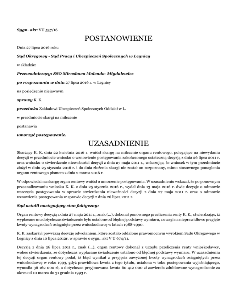 Sygn. akt: VU 537/16 POSTANOWIENIE Dnia 27 lipca 2016 roku Sąd Okręgowy - Sąd Pracy i Ubezpieczeń Społecznych w Legnicy w składzie: Przewodniczący: SSO Mirosława Molenda- Migdalewicz po rozpoznaniu w dniu 27 lipca 2016 r. w Legnicy na posiedzeniu niejawnym sprawy K. K. przeciwko Zakładowi Ubezpieczeń Społecznych Oddział w L. w przedmiocie skargi na milczenie postanawia umorzyć postępowanie. UZASADNIENIE Skarżący K. K. dnia 22 kwietnia 2016 r. wniósł skargę na milczenie organu rentowego, polegające na niewydaniu decyzji w przedmiocie wniosku o wznowienie postępowania zakończonego ostateczną decyzją z dnia 26 lipca 2011 r. oraz wniosku o stwierdzenie nieważności decyzji z dnia 27 maja 2011 r., wskazując, że wniosek w tym przedmiocie złożył w dniu 25 stycznia 2016 r. i do dnia złożenia skargi nie został on rozpoznany, mimo stosownego ponaglenia organu rentowego pismem z dnia 2 marca 2016 r. W odpowiedzi na skargę organ rentowy wniósł o umorzenie postępowania. W uzasadnieniu wskazał, że po ponownym przeanalizowaniu wniosku K. K. z dnia 25 stycznia 2016 r., wydał dnia 13 maja 2016 r. dwie decyzje o odmowie wszczęcia postępowania w sprawie stwierdzenia nieważności decyzji z dnia 27 maja 2011 r. oraz o odmowie wznowienia postępowania w sprawie decyzji z dnia 26 lipca 2011 r. Sąd ustalił następujący stan faktyczny: Organ rentowy decyzją z dnia 27 maja 2011 r., znak (...), dokonał ponownego przeliczenia renty K. K., stwierdzając, iż wypłacane mu dotychczas świadczenie było ustalone od błędnej podstawy wymiaru, z uwagi na nieprawidłowo przyjęte kwoty wynagrodzeń osiągnięte przez wnioskodawcę w latach 1988-1990. K. K. zaskarżył powyższą decyzję odwołaniem, które zostało oddalone prawomocnym wyrokiem Sadu Okręgowego w Legnicy z dnia 10 lipca 2012r. w sprawie o sygn.. akt V U 674/11. Decyzją z dnia 26 lipca 2011 r., znak (...), organ rentowy dokonał z urzędu przeliczenia renty wnioskodawcy, wobec stwierdzenia, ze dotychczas wypłacane świadczenie ustalono od błędnej podstawy wymiaru. W uzasadnieniu tej decyzji organ rentowy podał, iż błąd wynikał z przyjęcia zawyżonej kwoty wynagrodzeń osiągniętych przez wnioskodawcę w roku 1993, gdyż prawidłowa kwota z tego tytułu, ustalona w toku postepowania wyjaśniającego, wynosiła 36 162 000 zł, a dotychczas przyjmowana kwota 60 412 000 zł zawierała zdublowane wynagrodzenie za okres od 10 marca do 31 grudnia 1993 r. Decyzja ta nie została zaskarżona przez wnioskodawcę i stała się ostateczna. Dnia 25 stycznia 2016 r. K. K. złożył do organu rentowego wniosek o wznowienie postępowań przez Zakładem Ubezpieczeń Społecznych, zakończonych ostatecznymi decyzjami z dnia 27 maja 2011 r., znak (...) oraz z dnia 26 lipca 2011 r., znak (...) oraz ich uchylenie i umorzenie postępowania wskutek wznowienia postępowania. Wniosek ten zawierał też żądania ewentualne - w razie stwierdzenia braku podstaw do wszczęcia postępowania w sprawie wznowienia postepowań zakończonych wydaniem decyzji z dnia 27 maja i 26 lipca 2011 r. - o stwierdzenie nieważności obu w.w. decyzji. Rozpoznając powyższy wniosek, organ rentowy dnia 10 lutego 2016 r. wydał dwie decyzję. Pierwszą z nich, znak (...), organ rentowy zwrócił wniosek o wznowienie postępowania dotyczący decyzji z dnia 27 maja 2011 r. W uzasadnieniu organ rentowy wskazał, że z uwagi na zaskarżenie tej decyzji odwołaniem i prawomocnym zakończeniem postępowania wyrokiem Sądu Okręgowego w Legnicy, ZUS Oddział w L. nie jest organem właściwym do rozpatrzenia przedmiotowego wniosku. Drugą decyzją, znak (...), organ rentowy odmówił wszczęcia postepowania w sprawie nieważności decyzji z dnia 26 lipca 2011 r. W uzasadnieniu, powołując się na treść art. 83a ust. 2 oraz ust. 4 ustawy z dnia 13 października 1998 r. o systemie ubezpieczeń społecznych, organ rentowy wskazał na brak podstaw prawnych do wszczęcia przedmiotowego postępowania na wniosek ubezpieczonego. Dnia 2 marca 2016 r. wnioskodawca wystosował do organu rentowego pismo zatytułowane „wezwanie do usunięcia naruszenia prawa”, w którym podniósł, że decyzje wydane dnia 10 lutego 2016 r. nie rozstrzygają o wszystkich jego żądaniach zgłoszonych we wniosku z dnia 25 stycznia 2016 r., gdyż dotyczą jedynie wznowienia postępowania zakończonego wydaniem decyzji z dnia 27 maja 2011 r. oraz wniosku ewentualnego dotyczącego decyzji z dnia 26 lipca 2011 r. W odpowiedzi na powyższe pismo, organ rentowy poinformował wnioskodawcę, iż wniosek z dnia 25 stycznia 2016 r. został załatwiony wydaniem dwóch decyzji z dnia 10 lutego 2016 r., od których przysługuje odwołanie do Sądu Okręgowego w Legnicy. Dnia 22 kwietnia 2016 r. K. K. wniósł skargę na milczenie organu rentowego, polegające na niewydaniu decyzji w przedmiocie wniosku o wznowienie postępowania zakończonego ostateczną decyzją z dnia 26 lipca 2011 r. oraz wniosku o stwierdzenie nieważności decyzji z dnia 27 maja 2011 r., wskazując, że wniosek w tym przedmiocie złożył w dniu 25 stycznia 2016 r. i do dnia złożenia skargi nie został on rozpoznany, mimo stosownego ponaglenia organu rentowego pismem z dnia 2 marca 2016 r. W reakcji na powyższą skargę organ rentowy dnia 13 maja 2016 r. wydał decyzję odmawiającą wznowienia postępowania w sprawie decyzji z dnia 26 lipca 2011 r., z powodu złożenia skargi o wznowienie postępowania po terminie określonym w art. 145a § 2 k.p.a. Dnia 13 maja 2016 r. organ rentowy wydał nadto decyzję o odmowie wszczęcia postępowania w sprawie stwierdzenia nieważności decyzji z dnia 27 maja 2011 r. Powołując się na treść art. 83a ust. 2 oraz ust. 4 ustawy z dnia 13 października 1998 r. o systemie ubezpieczeń społecznych, organ rentowy wskazał na brak podstaw prawnych do wszczęcia przedmiotowego postępowania na wniosek ubezpieczonego. Dowód: - akta ubezpieczeniowe ZUS, tom II – decyzja z dn.