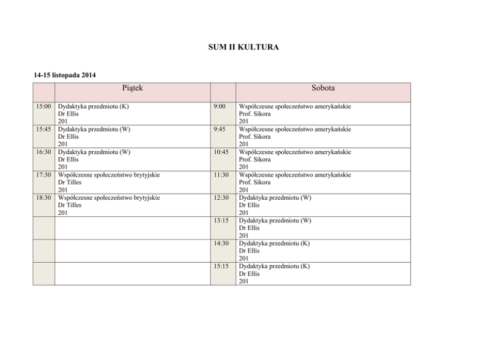 SUM II KULTURA 14-15 listopada 2014 Piątek 15:00 15:45 16:30 17:30 18:30 Dydaktyka przedmiotu (K) Dr Ellis 201 Dydaktyka przedmiotu (W) Dr Ellis 201 Dydaktyka przedmiotu (W) Dr Ellis 201 Współczesne społeczeństwo brytyjskie Dr Tilles 201 Współczesne społeczeństwo brytyjskie Dr Tilles 201 Sobota 9:00 9:45 10:45 11:30 12:30 13:15 14:30 15:15 Współczesne społeczeństwo amerykańskie Prof. Sikora 201 Współczesne społeczeństwo amerykańskie Prof. Sikora 201 Współczesne społeczeństwo amerykańskie Prof. Sikora 201 Współczesne społeczeństwo amerykańskie Prof. Sikora 201 Dydaktyka przedmiotu (W) Dr Ellis 201 Dydaktyka przedmiotu (W) Dr Ellis 201 Dydaktyka przedmiotu (K) Dr Ellis 201 Dydaktyka przedmiotu (K) Dr Ellis 201 28-29 listopada 2014 Piątek 15:00 15:45 16:45 17:30 18:30 19:15 Seminarium Kultura II Prof. Misztal / Prof. Sikora 103 / 4 Seminarium Kultura II Prof. Misztal / Prof. Sikora 103 / 4 Współczesne społeczeństwo brytyjskie Dr Tilles 103 Współczesne społeczeństwo brytyjskie Dr Tilles 103 Dydaktyka przedmiotu (W) Dr Ellis 103 Dydaktyka przedmiotu (W) Dr Ellis 103 Sobota 9:00 9:45 10:45 11:30 12:30 13:15 ..... 14:30 ..... 15:15 Dydaktyka przedmiotu (W) Dr Ellis 103 Dydaktyka przedmiotu (W) Dr Ellis 103 Dydaktyka przedmiotu (K) Dr Ellis 103 Dydaktyka przedmiotu (K) Dr Ellis 103 Współczesne społeczeństwo amerykańskie Prof. Sikora 103 Współczesne społeczeństwo amerykańskie Prof. Sikora 103 Wykład monograficzny Dr Hamera 103 Wykład monograficzny Dr Hamera 103