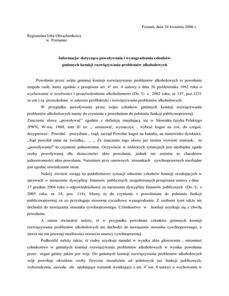 Poznań, dnia 24 kwietnia 2006 r. Regionalna Izba Obrachunkowa w Poznaniu Informacja: dotycząca powoływania i wynagradzania członków gminnych komisji rozwiązywania problemów alkoholowych Powołanie przez wójta gminnej komisji rozwiązywania problemów alkoholowych to powołanie zespołu osób, które zgodnie z przepisem art. 4¹ ust. 4 ustawy z dnia 26 października 1982 roku o wychowaniu w trzeźwości i przeciwdziałaniu alkoholizmowi (Dz. U. z 2002 roku, nr 147, poz.1231 ze zm.) są przeszkolone w zakresie profilaktyki i rozwiązywania problemów alkoholowych. W przypadku powoływania przez wójta członków gminnych komisji rozwiązywania problemów alkoholowych mamy do czynienia z powołaniem do pełnienia funkcji publicznoprawnej. Znaczenie słowa ,,powoływać” zgodnie z definicją znajdującą się w Słowniku Języka Polskiego /PWN, W-wa, 1980, tom II/ to: ,, ustanowić, wyznaczyć , wybrać kogoś na coś, do czegoś, desygnować: Powołać prezydium , rząd, zarząd Powołać kogoś na katedrę, na stanowisko dyrektora. ,,Sąd powołał mnie na świadka,, ... „ Ze znaczenie tego słowa już można wywieść wniosek, że ,,powoływanie” to czynność jednostronna. Oczywiście w niektórych sytuacjach jest niezbędna zgoda osoby powoływanej dla skuteczności aktu powołania, jednak nie zmienia to charakteru jednostronności aktu powołania. Natomiast przy umownych stosunkach cywilnoprawnych niezbędne jest zgodne oświadczenie stron. Należy zwrócić uwagę na podobieństwo sytuacji odnośnie członków komisji orzekających w sprawach o naruszenie dyscypliny finansów publicznych uregulowanych przepisami ustawy z dnia 17 grudnia 2004 roku o odpowiedzialności za naruszenie dyscypliny finansów publicznych (Dz. U. z 2005 roku, nr 14, poz. 114). Mamy tu do czynienia z powołaniem do pełnienia funkcji publicznoprawnej za co przysługuje stosowne ryczałtowe wynagrodzenie. Z osobami tymi także nie dochodzi do nawiązania stosunku cywilnoprawnego. Członkostwo w komisji uzyskuje się z chwilą powołania. A zatem stwierdzić należy, iż w przypadku powołania członków gminnych komisji rozwiązywania problemów alkoholowych nie dochodzi do nawiązania stosunku cywilnoprawnego, a nawet nie ma prawnej możliwości zawarcia umowy cywilnoprawnej. Podkreślić należy także, iż radny uzyskuje mandat w wyniku aktu głosowania , natomiast członkostwo w gminnych komisji rozwiązywania problemów alkoholowych w wyniku powołania przez organ gminy jakim jest wójt. Do gminnych komisji rozwiązywania problemów alkoholowych wójt powołuje określone osoby fizyczne niezależnie od pełnionych już funkcji publicznych, wykształcenia, zawodu ale spełniające warunek wynikający z art. 41 ust. 4 ustawy o wychowaniu w trzeźwości i przeciwdziałaniu alkoholizmowi. W obowiązującym stanie prawnym – radny - na terenie gminy, w której uzyskał mandat może być członkiem gminnej komisji rozwiązywania problemów alkoholowych, a w świetle powyższych ustaleń może pobierać stosowne wynagrodzenie, określone przez radę gminy w gminnym programie rozwiązywania problemów alkoholowych. Gdyby ustawodawca chciał z tego grona wykluczyć radnych to zapewne zawarłby takie postanowienie wprost. Zgodnie zaś z przepisem art. 41 ust. 5 w/w ustawy zasady wynagradzania członków gminnych komisji rozwiązywania problemów alkoholowych określa rada w gminnych programach rozwiązywania problemów alkoholowych. Od zasady tej wyrażonej przez ustawodawcę w sposób wyraźny nie ma wyjątku i stosowne wynagrodzenie może być wypłacane tylko za te czynności członków gminnych komisji rozwiązywania problemów alkoholowych, które określone są w programie i wysokościach tamże określonych. Prezes Regionalnej Izby Obrachunkowej w Poznaniu (-) Mieczysław Klupczyński