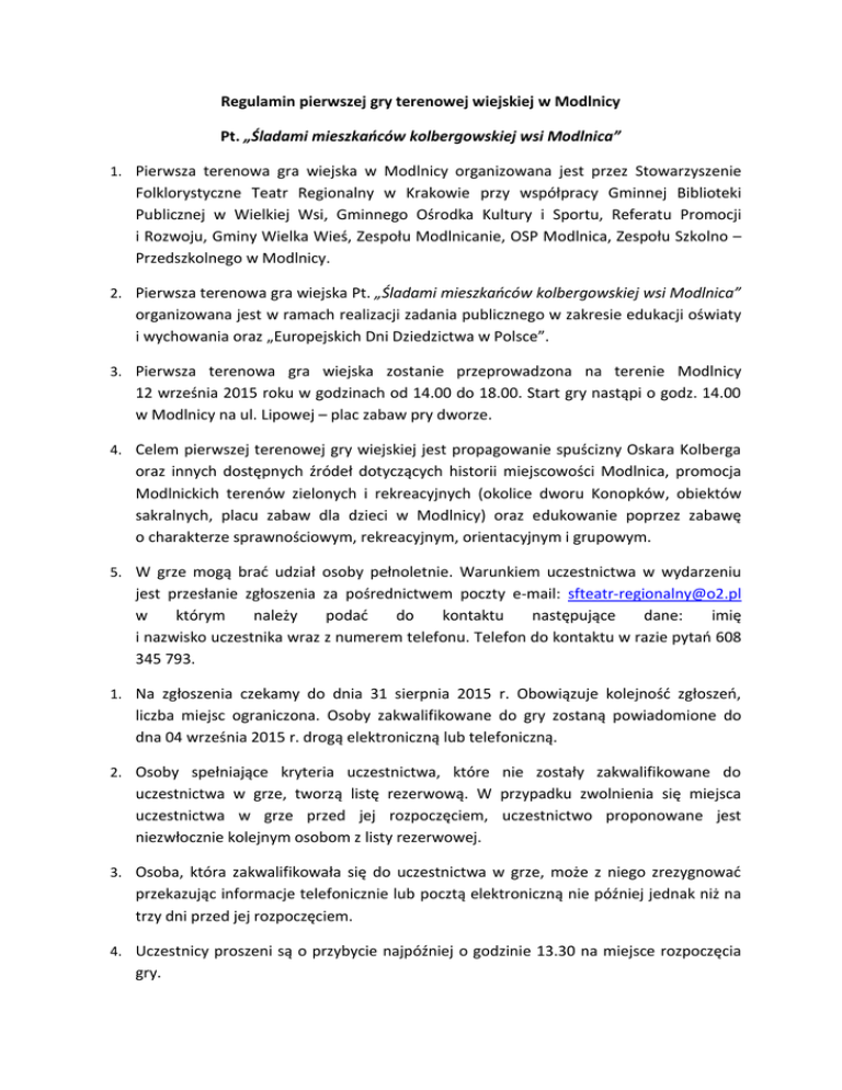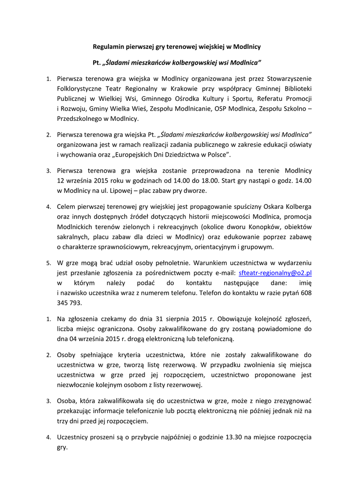 Regulamin pierwszej gry terenowej wiejskiej w Modlnicy Pt. „Śladami mieszkańców kolbergowskiej wsi Modlnica” 1. Pierwsza terenowa gra wiejska w Modlnicy organizowana jest przez Stowarzyszenie Folklorystyczne Teatr Regionalny w Krakowie przy współpracy Gminnej Biblioteki Publicznej w Wielkiej Wsi, Gminnego Ośrodka Kultury i Sportu, Referatu Promocji i Rozwoju, Gminy Wielka Wieś, Zespołu Modlnicanie, OSP Modlnica, Zespołu Szkolno – Przedszkolnego w Modlnicy. 2. Pierwsza terenowa gra wiejska Pt. „Śladami mieszkańców kolbergowskiej wsi Modlnica” organizowana jest w ramach realizacji zadania publicznego w zakresie edukacji oświaty i wychowania oraz „Europejskich Dni Dziedzictwa w Polsce”. 3. Pierwsza terenowa gra wiejska zostanie przeprowadzona na terenie Modlnicy 12 września 2015 roku w godzinach od 14.00 do 18.00. Start gry nastąpi o godz. 14.00 w Modlnicy na ul. Lipowej – plac zabaw pry dworze. 4. Celem pierwszej terenowej gry wiejskiej jest propagowanie spuścizny Oskara Kolberga oraz innych dostępnych źródeł dotyczących historii miejscowości Modlnica, promocja Modlnickich terenów zielonych i rekreacyjnych (okolice dworu Konopków, obiektów sakralnych, placu zabaw dla dzieci w Modlnicy) oraz edukowanie poprzez zabawę o charakterze sprawnościowym, rekreacyjnym, orientacyjnym i grupowym. 5. W grze mogą brać udział osoby pełnoletnie. Warunkiem uczestnictwa w wydarzeniu jest przesłanie zgłoszenia za pośrednictwem poczty e-mail: [email protected] w którym należy podać do kontaktu następujące dane: imię i nazwisko uczestnika wraz z numerem telefonu. Telefon do kontaktu w razie pytań 608 345 793. 1. Na zgłoszenia czekamy do dnia 31 sierpnia 2015 r. Obowiązuje kolejność zgłoszeń, liczba miejsc ograniczona. Osoby zakwalifikowane do gry zostaną powiadomione do dna 04 września 2015 r. drogą elektroniczną lub telefoniczną. 2. Osoby spełniające kryteria uczestnictwa, które nie zostały zakwalifikowane do uczestnictwa w grze, tworzą listę rezerwową. W przypadku zwolnienia się miejsca uczestnictwa w grze przed jej rozpoczęciem, uczestnictwo proponowane jest niezwłocznie kolejnym osobom z listy rezerwowej. 3. Osoba, która zakwalifikowała się do uczestnictwa w grze, może z niego zrezygnować przekazując informacje telefonicznie lub pocztą elektroniczną nie później jednak niż na trzy dni przed jej rozpoczęciem. 4. Uczestnicy proszeni są o przybycie najpóźniej o godzinie 13.30 na miejsce rozpoczęcia gry. 5. Uczestników gry wiejskiej obowiązuje strój nieformalny, najlepiej sportowy i wygodny. 6. Na starcie pierwszej gry wiejskiej, zaraz po podpisaniu listy obecności, każdy zespół otrzyma mapę, materiały niezbędne do uczestnictwa w grze oraz elementy identyfikujące zespół. 7. Zespoły będą wykonywać zadania przygotowane przez organizatorów na poszczególnych etapach gry. Uczestnicy będą otrzymywać wskazówki od osób nadzorujących grę na poszczególnych stacjach oraz zdobywać punktację. 8. Pierwsza Gra wiejska w Modlnicy nie zakłada podziału na wygranych i przegranych. Każdy uczestnik otrzyma upominek nierozerwalnie związany z folklorem i tradycją podkrakowskiej gminy. 9. Wręczenie nagród uczestnictwa w pierwszej terenowej gry wiejskiej nastąpi na placu zabaw w Modlnicy w dniu 12 września 2015 r. po ukończeniu zadań przez wszystkie zespoły. 10. Organizatorzy zastrzegają sobie prawo do odwołania gry lub wprowadzenia zmian w programie, regulaminie lub w organizacji (w tym terminu i miejsca jego przeprowadzenia). Organizator jest zobowiązany do niezwłocznego poinformowania uczestników o odwołaniu lub zmianach telefonicznie lub pocztą elektroniczną wraz z podaniem przyczyny. 11. Zgłoszenie się do pierwszej terenowej gry wiejskiej jest równoznaczne z wyrażeniem zgody przez uczestników na publikację wizerunku utrwalonego na fotografiach, filmach do celów promocyjnych oraz sprawozdawczych wraz z podaniem imienia i nazwiska jeśli zaistnieje taka potrzeba. 12. Organizatorzy dochowają wszelkich starań, by zapewnione zostało bezpieczeństwo uczestników gry. Nadzór sprawować będzie grupa ratownicza OSP Modlnica. Jednocześnie osoby zgłaszające swoje uczestnictwo w pierwszej grze terenowej wiejskiej w Modlnicy zobowiązują się do przestrzegania zasad bezpieczeństwa i biorą odpowiedzialność za swoje bezpieczeństwo w toku przebiegu gry. Organizator nie ponosi odpowiedzialności za szkody poniesione przez uczestników lub osoby trzecie spowodowane działaniami uczestników w czasie trwania gry. 13. Gra wiejska w Modlnicy pt „Śladami mieszkańców kolbergowskiej wsi Modlnica” realizowana jest w ramach Europejskich Dni Dziedzictwa obchodzonych po raz 23 w Polsce. W tym roku pod hasłem „ Utracone dziedzictwo”. 14. Na zakończenie organizatory przewidują dla uczestników poczęstunek i dobra zabawę.