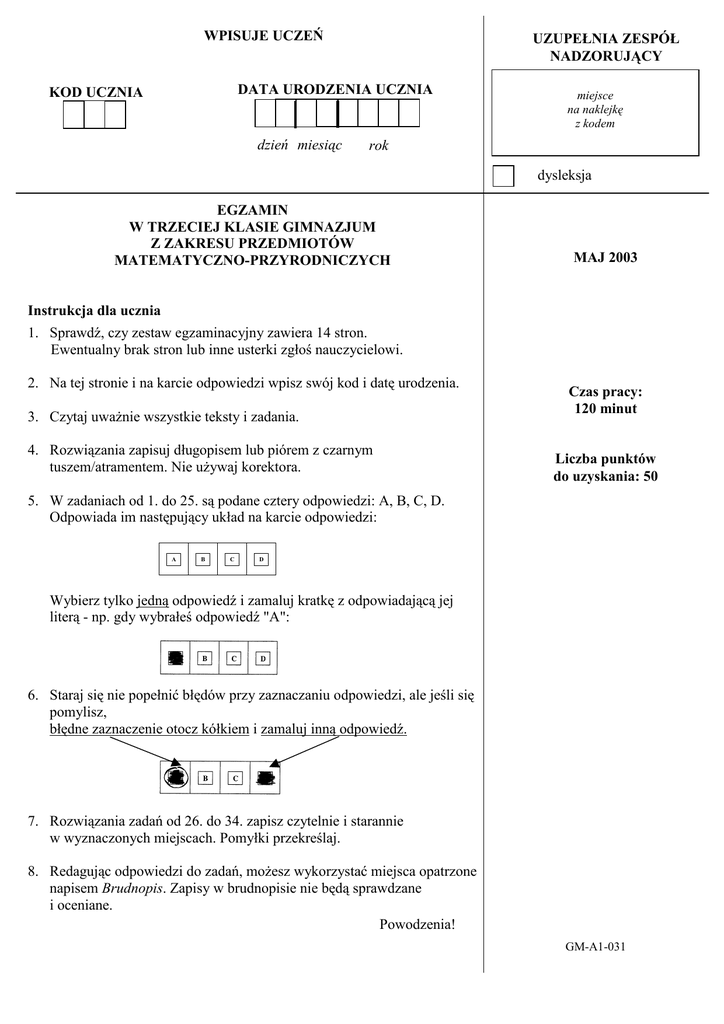 WPISUJE UCZE UZUPEŁNIA ZESPÓŁ NADZORUJ CY DATA URODZENIA UCZNIA KOD UCZNIA dzie miesi c miejsce na naklejk z kodem rok dysleksja EGZAMIN W TRZECIEJ KLASIE GIMNAZJUM Z ZAKRESU PRZEDMIOTÓW MATEMATYCZNO-PRZYRODNICZYCH MAJ 2003 Instrukcja dla ucznia 1. Sprawd , czy zestaw egzaminacyjny zawiera 14 stron. Ewentualny brak stron lub inne usterki zgło nauczycielowi. 2. Na tej stronie i na karcie odpowiedzi wpisz swój kod i dat urodzenia. 3. Czytaj uwa nie wszystkie teksty i zadania. 4. Rozwi zania zapisuj długopisem lub piórem z czarnym tuszem/atramentem. Nie u ywaj korektora. Czas pracy: 120 minut Liczba punktów do uzyskania: 50 5. W zadaniach od 1. do 25. s podane cztery odpowiedzi: A, B, C, D. Odpowiada im nast puj cy układ na karcie odpowiedzi: A B C D Wybierz tylko jedn odpowied i zamaluj kratk z odpowiadaj c jej liter - np. gdy wybrałe odpowied "A": 6. Staraj si nie popełni bł dów przy zaznaczaniu odpowiedzi, ale je li si pomylisz, bł dne zaznaczenie otocz kółkiem i zamaluj inn odpowied . 7. Rozwi zania zada od 26. do 34. zapisz czytelnie i starannie w wyznaczonych miejscach. Pomyłki przekre laj. 8. Redaguj c odpowiedzi do zada , mo esz wykorzysta miejsca opatrzone napisem Brudnopis. Zapisy w brudnopisie nie b d sprawdzane i oceniane. Powodzenia! GM-A1-031 Informacja do zada 1. i 2. Diagram kołowy przedstawia wyniki wyborów do samorz du szkolnego. Adam ?% Emil 25% Ela 10% Jacek 7,5% Agata 37,5% Zadanie 1. (0 – 1) Ile procent uczniów głosowało na Adama? A. B. C. D. 25 20 10 80 Zadanie 2. (0 – 1) Jaka cz uczniów głosowała na Agat ? 1 ogółu. 4 1 , ale wi cej ni B. Mniej ni 3 1 C. Wi cej ni , ale mniej ni 3 2 ogółu. D. Wi cej ni 5 A. Mniej ni 1 ogółu. 4 2 ogółu. 5 Zadanie 3. (0 – 1) 1 mol to taka ilo materii, która zawiera w przybli eniu 6·1023 (odpowiednio) atomów, cz steczek lub jonów. Ile cz steczek wody zawartych jest w 0,25 mola wody? A. B. C. D. 1,5·1023 0,5·1022 1023 0,25·1023 Strona 2 z 14 Informacja do zada 4. i 5. Fosforanowi (V) wapnia przypisuje si wzór strukturalny: Ca O O Ca P O P O O O O Ca O Zadanie 4. (0 – 1) Warto ciowo poszczególnych pierwiastków w tym zwi zku jest równa: A. B. C. D. Ca – VI, P – X, O – XVI Ca – III, P – II, O – VIII Ca – II, P – III, O – II Ca – II, P – V, O – II Zadanie 5. (0 – 1) Wzór sumaryczny tego zwi zku ma posta A. B. C. D. Ca3(PO4)2 Ca3(PO5)2 2 Ca3(PO4) 3 Ca(PO4)2 Zadanie 6. (0 – 1) Na rysunku przedstawiono wybrane informacje z układu okresowego pierwiastków. (Masy atomowe podane s w zaokr gleniu do jedno ci). Mg 12 magnez 24 Korzystaj c z nich, oblicz mas sumarycznym Mg3(AsO4)2. A. B. C. D. As 33 arsen 75 cz steczkow 164 211 350 130 Strona 3 z 14 O 8 tlen 16 zwi zku chemicznego o wzorze Informacja do zada : 7 – 9. W chwili, gdy zapaliły si zielone wiatła, samochód F ruszył ze skrzy owania i został w tym momencie wyprzedzony przez samochód S. Na wykresie przedstawiono zale no szybko ci tych samochodów od czasu, jaki upłyn ł od zapalenia si zielonych wiateł. m s v 35 30 25 20 15 10 5 0 S t (s) 0 Zadanie 7. (0 – 1) W szóstej sekundzie A. B. C. D. F 2 4 6 8 10 12 oba samochody znajdowały si w tej samej odległo ci od skrzy owania. samochód S wyprzedził samochód F. oba samochody miały takie samo przy pieszenie. oba samochody osi gn ły t sam szybko . Zadanie 8. (0 – 1) Warto przy pieszenia samochodu F była równa A. 6 m s2 B. 2,5 m s2 C. 0,4 m s2 m s2 D. 0 Zadanie 9. (0 – 1) Warto przy pieszenia samochodu S była równa A. 0 m s2 B. 4 m s2 C. 6 Zadanie 10. (0 – 1) Na wykresie przedstawiono zale no odbiorników pr du. m s2 D. 15 m s2 nat enia I od napi cia U dla czterech I (A) 1 6 2 3 5 4 4 3 2 1 U (V) 0 0 20 40 60 Który odbiornik ma najwi kszy opór? A. 1 B. 2 C. 3 Strona 4 z 14 D. 4 80 Informacje do zada 11. i 12. Tabela Masa ciała ptaka 10 g 100 g 1 kg 10 kg 100 kg Masa jaja w procentach masy ciała dorosłego ptaka 20% 10% 4% 2% 1% Czas inkubacji (dni) 10 16 21 39 68 Zadanie 11. (0 – 1) Je li stru ma mas 100 kg a kura mas 1 kg, to zgodnie z tabel ró nica mas ich jaj wyra ona w gramach jest równa A. 3 B. 96 C. 99 D. 960 Zadanie 12. (0 – 1) Które zdanie o zale no ci czasu inkubacji od masy ciała ptaka jest prawdziwe? A. B. C. D. Czas inkubacji jest wprost proporcjonalny do masy ciała ptaka. Czas inkubacji ro nie wraz ze wzrostem masy ciała ptaka. Czas inkubacji jest odwrotnie proporcjonalny do masy ciała ptaka. Czas inkubacji maleje wraz ze wzrostem masy ciała ptaka. Zadanie 13. (0 – 1) Jajo strusia jest około 3 razy dłu sze od jaja kury. Je li zało y , e ółtka tych jaj maj kształt kul podobnych w skali 3 : 1, to ółtko w strusim jaju ma obj to wi ksz ni ółtko w jaju kurzym A. B. C. D. 27 razy. 9 razy. 6 razy. 3 razy. Strona 5 z 14 Informacje do zada 14. i 15. Owoce zbó nazywamy ziarniakami. Na rysunkach przedstawiono przekroje podłu ne przez jajo kury i ziarniak kukurydzy. Zadanie 14. (0 – 1) Który z rysunków: I, II, III czy IV przedstawia przekrój poprzeczny przez jajo kury wykonany w miejscu zaznaczonym lini P? A. I B. II C. III D. IV Zadanie 15. (0 – 1) Która cz ziarniaka pełni podobn funkcj jak ółtko jaja? A. Łupina. B. Owocnia. C. Bielmo. D. Zarodek. Zadanie 16. (0 – 1) Zarodek kukurydzy znajduj cy si w ziarniaku A. B. C. D. od od od od ywia si ywia si ywia si ywia si autotroficznie, oddycha beztlenowo. kosztem bielma, oddycha tlenowo. kosztem łupiny owocowo-nasiennej, oddycha tlenowo. kosztem bielma, oddycha beztlenowo. Strona 6 z 14 Zadanie 17. (0 – 1) Na rysunkach przedstawiono schematy czterech do wiadcze . roztwór wodny cukru I II III IV Wybierz to do wiadczenie, z którego obserwacje pozwalaj o obecno ci w glanu wapnia w skorupce jajka. A. I B. II C. III wyci gn wniosek D. IV Zadanie 18. (0 – 1) W tabeli przedstawiono procentowy skład powietrza wdychanego i wydychanego. Składniki powietrza Azot Tlen Dwutlenek w gla Zawarto w powietrzu wdychanym 78,4% 20,8% 0,04% Zawarto w powietrzu wy