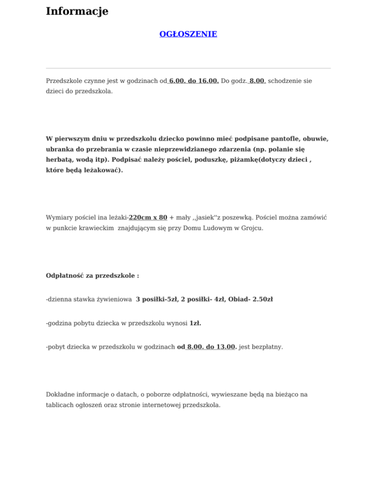 Informacje OGŁOSZENIE Przedszkole czynne jest w godzinach od 6.00. do 16.00. Do godz. 8.00. schodzenie sie dzieci do przedszkola. W pierwszym dniu w przedszkolu dziecko powinno mieć podpisane pantofle, obuwie, ubranka do przebrania w czasie nieprzewidzianego zdarzenia (np. polanie się herbatą, wodą itp). Podpisać należy pościel, poduszkę, piżamkę(dotyczy dzieci , które będą leżakować). Wymiary pościel ina leżaki-220cm x 80 + mały ,,jasiek''z poszewką. Pościel można zamówić w punkcie krawieckim znajdującym się przy Domu Ludowym w Grojcu. Odpłatność za przedszkole : -dzienna stawka żywieniowa 3 posiłki-5zł, 2 posiłki- 4zł, Obiad- 2.50zł -godzina pobytu dziecka w przedszkolu wynosi 1zł. -pobyt dziecka w przedszkolu w godzinach od 8.00. do 13.00. jest bezpłatny. Dokładne informacje o datach, o poborze odpłatności, wywieszane będą na bieżąco na tablicach ogłoszeń oraz stronie internetowej przedszkola.