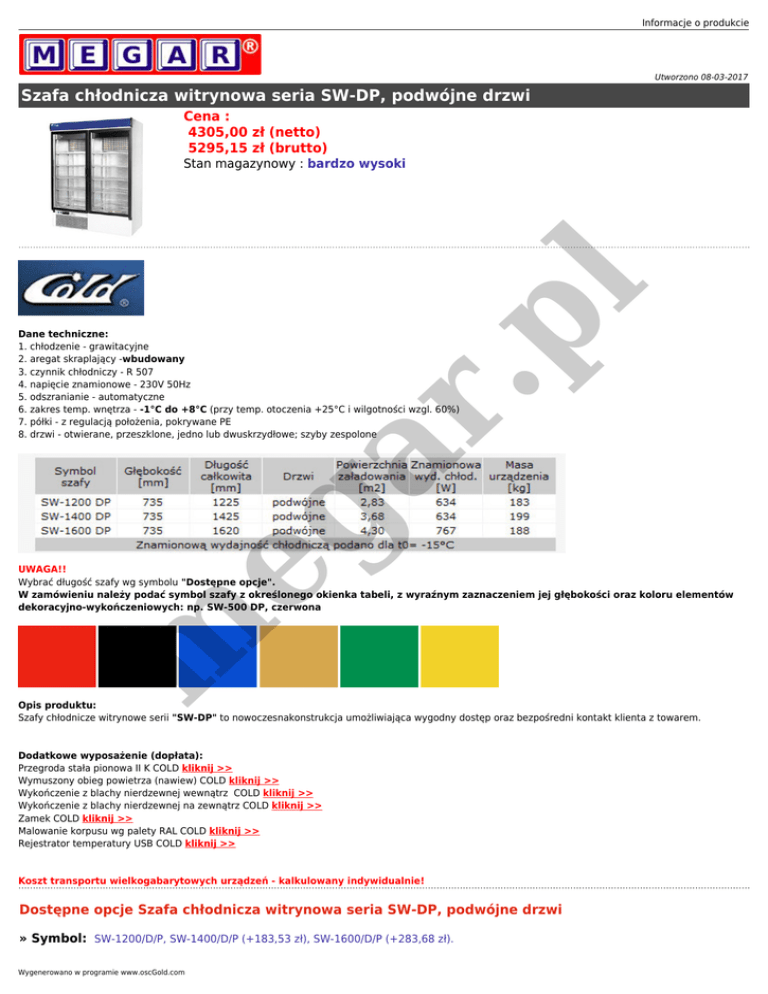 Informacje o produkcie Utworzono 08-03-2017 Szafa chłodnicza witrynowa seria SW-DP, podwójne drzwi Cena : 4305,00 zł (netto) 5295,15 zł (brutto) .p l Stan magazynowy : bardzo wysoki eg ar Dane techniczne: 1. chłodzenie - grawitacyjne 2. aregat skraplający -wbudowany 3. czynnik chłodniczy - R 507 4. napięcie znamionowe - 230V 50Hz 5. odszranianie - automatyczne 6. zakres temp. wnętrza - -1°C do +8°C (przy temp. otoczenia +25°C i wilgotności wzgl. 60%) 7. półki - z regulacją położenia, pokrywane PE 8. drzwi - otwierane, przeszklone, jedno lub dwuskrzydłowe; szyby zespolone m UWAGA!! Wybrać długość szafy wg symbolu "Dostępne opcje". W zamówieniu należy podać symbol szafy z określonego okienka tabeli, z wyraźnym zaznaczeniem jej głębokości oraz koloru elementów dekoracyjno-wykończeniowych: np. SW-500 DP, czerwona Opis produktu: Szafy chłodnicze witrynowe serii "SW-DP" to nowoczesnakonstrukcja umożliwiająca wygodny dostęp oraz bezpośredni kontakt klienta z towarem. Dodatkowe wyposażenie (dopłata): Przegroda stała pionowa II K COLD kliknij >> Wymuszony obieg powietrza (nawiew) COLD kliknij >> Wykończenie z blachy nierdzewnej wewnątrz COLD kliknij >> Wykończenie z blachy nierdzewnej na zewnątrz COLD kliknij >> Zamek COLD kliknij >> Malowanie korpusu wg palety RAL COLD kliknij >> Rejestrator temperatury USB COLD kliknij >> Koszt transportu wielkogabarytowych urządzeń - kalkulowany indywidualnie! Dostępne opcje Szafa chłodnicza witrynowa seria SW-DP, podwójne drzwi » Symbol: SW-1200/D/P, SW-1400/D/P (+183,53 zł), SW-1600/D/P (+283,68 zł). Wygenerowano w programie www.oscGold.com