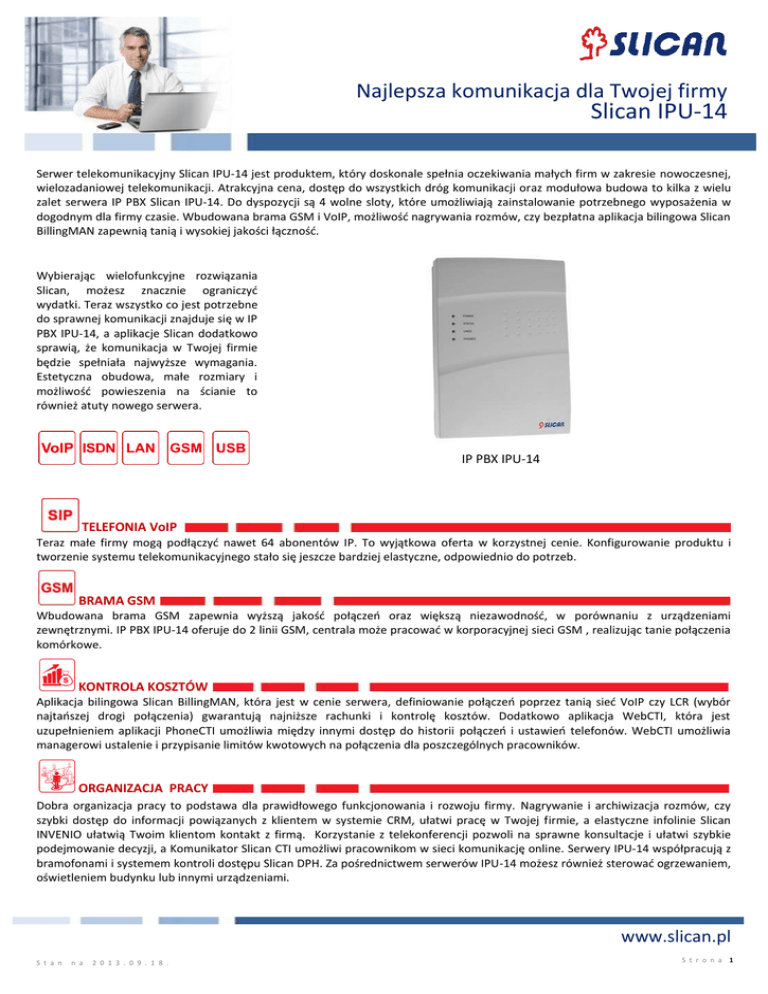 Najlepsza komunikacja dla Twojej firmy Slican IPU-14 Serwer telekomunikacyjny Slican IPU-14 jest produktem, który doskonale spełnia oczekiwania małych firm w zakresie nowoczesnej, wielozadaniowej telekomunikacji. Atrakcyjna cena, dostęp do wszystkich dróg komunikacji oraz modułowa budowa to kilka z wielu zalet serwera IP PBX Slican IPU-14. Do dyspozycji są 4 wolne sloty, które umożliwiają zainstalowanie potrzebnego wyposażenia w dogodnym dla firmy czasie. Wbudowana brama GSM i VoIP, możliwośd nagrywania rozmów, czy bezpłatna aplikacja bilingowa Slican BillingMAN zapewnią tanią i wysokiej jakości łącznośd. Wybierając wielofunkcyjne rozwiązania Slican, możesz znacznie ograniczyd wydatki. Teraz wszystko co jest potrzebne do sprawnej komunikacji znajduje się w IP PBX IPU-14, a aplikacje Slican dodatkowo sprawią, że komunikacja w Twojej firmie będzie spełniała najwyższe wymagania. Estetyczna obudowa, małe rozmiary i możliwośd powieszenia na ścianie to również atuty nowego serwera. IP PBX IPU-14 TELEFONIA VoIP Teraz małe firmy mogą podłączyd nawet 64 abonentów IP. To wyjątkowa oferta w korzystnej cenie. Konfigurowanie produktu i tworzenie systemu telekomunikacyjnego stało się jeszcze bardziej elastyczne, odpowiednio do potrzeb. BRAMA GSM Wbudowana brama GSM zapewnia wyższą jakośd połączeo oraz większą niezawodnośd, w porównaniu z urządzeniami zewnętrznymi. IP PBX IPU-14 oferuje do 2 linii GSM, centrala może pracowad w korporacyjnej sieci GSM , realizując tanie połączenia komórkowe. KONTROLA KOSZTÓW Aplikacja bilingowa Slican BillingMAN, która jest w cenie serwera, definiowanie połączeo poprzez tanią sied VoIP czy LCR (wybór najtaoszej drogi połączenia) gwarantują najniższe rachunki i kontrolę kosztów. Dodatkowo aplikacja WebCTI, która jest uzupełnieniem aplikacji PhoneCTI umożliwia między innymi dostęp do historii połączeo i ustawieo telefonów. WebCTI umożliwia managerowi ustalenie i przypisanie limitów kwotowych na połączenia dla poszczególnych pracowników. ORGANIZACJA PRACY Dobra organizacja pracy to podstawa dla prawidłowego funkcjonowania i rozwoju firmy. Nagrywanie i archiwizacja rozmów, czy szybki dostęp do informacji powiązanych z klientem w systemie CRM, ułatwi pracę w Twojej firmie, a elastyczne infolinie Slican INVENIO ułatwią Twoim klientom kontakt z firmą. Korzystanie z telekonferencji pozwoli na sprawne konsultacje i ułatwi szybkie podejmowanie decyzji, a Komunikator Slican CTI umożliwi pracownikom w sieci komunikację online. Serwery IPU-14 współpracują z bramofonami i systemem kontroli dostępu Slican DPH. Za pośrednictwem serwerów IPU-14 możesz również sterowad ogrzewaniem, oświetleniem budynku lub innymi urządzeniami. www.slican.pl S t a n n a 2 0 1 3 . 0 9 . 1 8 . S t r o n a 1 Najlepsza komunikacja dla Twojej firmy Slican IPU-14 Maksymalna pojemnośd IPU-14.101 IPU-14.102 Porty wewnętrzne AB (FXS) 14 14 Linie miejskie POTS (FXO) 4 4 ISDN BRA (tylko linie zewn.) 4 4 Kanały IP 8 16 Translacje IP (SIP) 16 16 Abonenci IP (SIP) 24 64 Linie GSM 2 2 Porty systemowe CTS Up0 + IP 28 68 Kanały nagrywania rozmów 8 8 Karty pamięci micro SD 1 1 1/1 1/1 Porty SN / RL telefony systemowe Slican Up0 + IP CTS-102, CTS-202, CTS-203, CTS-330 telefony Slican SIP VPS-2000P, VPS-310P telefony analogowe Slican XL-2023ID oraz XL-209 Urządzenia współpracujące alarmowy telefon beztarczowy Slican HLP-22 konsole Slican CTS-232 oraz CTS-338 bramofon Slican DPH Multi Switch Box (MSB-1102) oraz Multi Audio Box (MAB-1101) Slican Komunikator CTI – PhoneCTI, MobileCTI, WebCTI Aplikacje wspomagające pracę IPU-14 Slican BillingMAN / BillingMAN.plus Slican RecordMAN.server / RecordMAN.client Slican ConfigMAN.admin / ConfigMAN.user Parametry VoIP Protokoły Obsługiwane protokoły Tryb pracy Protokoły komunikacji głosowej Protokoły komunikacji z serwerem Port Ethernet 10 / 100 Zasilanie eSSL, SIP 2.0 kodek G.711a eSSL, SIP 2.0 kodek G.711a, G.729 klient lub / i serwer VoIP POTS / ISDN-EDSS1 / QSIG / SIP 2.0 / GSM900 / 1800 / 1900 / Up0 CTIP / HOTELP / TAPI / EbdRECP / HTTP / XML 1 ~230 V + 10%, 50Hz Wymiary (mm) szerokośd x wysokośd x głębokośd 210 x 301 x 55 Przedstawiony materiał jest materiałem informacyjno-poglądowym. W celu prawidłowego skonfigurowania serwera zalecamy kontakt i konsultacje z Dystrybutorem lub Autoryzowanym Partnerem Slican. www.slican.pl S t a n n a 2 0 1 3 . 0 9 . 1 8 . S t r o n a 2