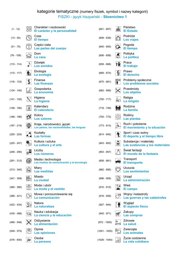 kategorie tematyczne (numery fiszek, symbol i nazwy kategorii) FISZKI - język hiszpański - Słownictwo 1 (1 - 12) Charakter i osobowość El carácter y la personalidad (601 - 607) Państwo El Estado (13 - 50) Czas El tiempo (608 - 639) Podróże Los viajes (51 - 75) Części ciała Las partes del cuerpo (640 - 655) Pogoda El tiempo (76 - 109) Dom La casa (656 - 658) Polityka La política (110 - 114) Dźwięki Los sonidos (659 - 668) Praca El trabajo (115 - 117) Ekologia La ecología (669 - 674) Prawo El derecho (118 - 133) Finanse Las finanzas (675 - 681) Problemy społeczne Los problemas sociales (134 - 140) Gospodarka La economía (682 - 699) Przedmioty Los objetos (141 - 155) Higiena La higiene (700 - 717) Religia La religión (156 - 185) Kalendarz El calendario (718 - 749) Rodzina La familia (186 - 196) Kolory Los colores (750 - 772) Rośliny Las plantas (773 - 813) Ruch i położenie El movimiento y la situación (197 - 219) Kraje, narodowości, języki Los países, las nacionalidades, las lenguas (220 - 224) Kształty Las formas (814 - 842) Sport i czas wolny El deporte y el tiempo libre (225 - 247) Kultura i sztuka La cultura y el arte (843 - 852) Substancje i materiały Las sustancias y los materiales (248 - 290) Liczby Los números (853 - 857) Świat fantazji El mundo de la fantasía (858 - 881) Transport El transporte (291 - 312) Media i technologia Los medios de comunicación y la tecnología (313 - 340) Miary Las medidas (882 - 895) Uczucia Los sentimientos (341 - 359) Miasto La ciudad (896 - 909) Urząd La administración (360 - 385) Moda i ubiór La moda y el vestido (910 - 915) Wieś El campo (386 - 421) Mowa i porozumiewanie się La comunicación (916 - 926) Wojny i katastrofy Las guerras y las catástrofes (422 - 434) Natura La naturaleza (927 - 944) Wygląd El aspecto físico (435 - 488) Nauka i edukacja La ciencia y la educación (945 - 971) Zakupy Las compras (489 - 548) Odżywianie La alimentación (972 - 1000) Zdrowie La salud (549 - 575) Opinie Las opiniones (1001 - 1025) Zwierzęta Los animales (576 - 600) Osoba La persona (1026 - 1040) Życie codzienne La vida cotidiana