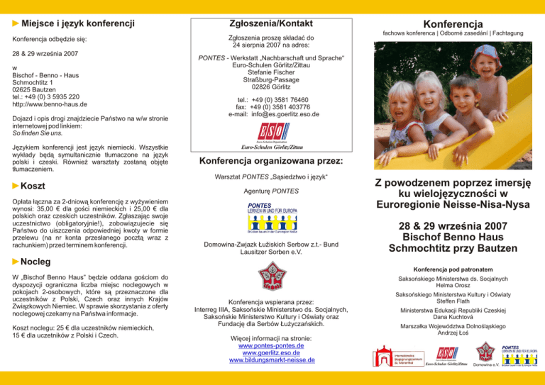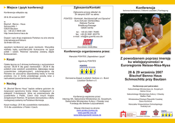 Miejsce i język konferencji Konferencja odbędzie się: 28 & 29 września 2007 w Bischof - Benno - Haus Schmochtitz 1 02625 Bautzen tel.: +49 (0) 3 5935 220 http://www.benno-haus.de Dojazd i opis drogi znajdziecie Państwo na w/w stronie internetowej pod linkiem: So finden Sie uns. Zgłoszenia/Kontakt Zgłoszenia proszę składać do 24 sierpnia 2007 na adres: Konferencja fachowa konferenca | Odborné zasedání | Fachtagung PONTES - Werkstatt „Nachbarschaft und Sprache“ Euro-Schulen Görlitz/Zittau Stefanie Fischer Straßburg-Passage 02826 Görlitz tel.: +49 (0) 3581 76460 fax: +49 (0) 3581 403776 e-mail: [email protected] Euro-Schulen-Organisation Językiem konferencji jest język niemiecki. Wszystkie wykłady będą symultanicznie tłumaczone na język polski i czeski. Również warsztaty zostaną objęte tłumaczeniem. Euro-Schulen Görlitz/Zittau Konferencja organizowana przez: Warsztat PONTES „Sąsiedztwo i język“ Koszt Opłata łączna za 2-dniową konferencję z wyżywieniem wynosi: 35,00 € dla gości niemieckich i 25,00 € dla polskich oraz czeskich uczestników. Zgłaszając swoje uczestnictwo (obligatoryjnie!), zobowiązujecie się Państwo do uiszczenia odpowiedniej kwoty w formie przelewu (na nr konta przesłanego pocztą wraz z rachunkiem) przed terminem konferencji. Agenturę PONTES Domowina-Zwjazk Łužiskich Serbow z.t.- Bund Lausitzer Sorben e.V. Z powodzenem poprzez imersję ku wielojęzyczności w Euroregionie Neisse-Nisa-Nysa 28 & 29 września 2007 Bischof Benno Haus Schmochtitz przy Bautzen Nocleg Konferencja pod patronatem W „Bischof Benno Haus” będzie oddana gościom do dyspozycji ograniczna liczba miejsc noclegowych w pokojach 2-osobowych, które są przeznaczone dla uczestników z Polski, Czech oraz innych Krajów Związkowych Niemiec. W sprawie skorzystania z oferty noclegowej czekamy na Państwa informacje. Koszt noclegu: 25 € dla uczestników niemieckich, 15 € dla uczetników z Polski i Czech. Saksońskiego Ministerstwa ds. Socjalnych Helma Orosz Konferencja wspierana przez: Interreg IIIA, Saksońskie Ministerstwo ds. Socjalnych, Saksońskie Ministerstwo Kultury i Oświaty oraz Fundację dla Serbów Łużyczańskich. Więcej informacji na stronie: www.pontes-pontes.de www.goerlitz.eso.de www.bildungsmarkt-neisse.de Saksońskiego Ministerstwa Kultury i Oświaty Steffen Flath Ministerstwa Edukacji Republiki Czeskiej Dana Kuchtová Marszałka Województwa Dolnośląskiego Andrzej Łoś Euro-Schulen-Organisation Euro-Schulen Görlitz/Zittau Domowina e.V. Kontekst merytoryczny Nauka języków obcych odgrywa w dzisiejszych czasach coraz większą rolę - czy to w szkole czy podczas szkolenia zawodowego, czy też w karierze zawodowej. Bliskość geograficzna Polski, Czech i Niemiec, a także serbsko-łużyczańskiego obszaru językowego stwarza idealne warunki w Euroregionie Neiße-Nisa-Nysa do nauki drugiego języka już od przedszkola, w szkole podstawowej, jak i w czynnościach dnia codziennego, wykraczających poza edukację szkolną. Wybrane przedszkola, szkoły podstawowe oraz stowarzyszenia obrały sobie za cel, włączyć język czeski, polski, niemiecki i serbskołużyczański w zakres programu nauczania. Jednakże metody przekazywania umiejętności posługiwania się językiem obcym różnią się od siebie i nie zawsze prowadzą do bezpośredniego sukcesu. Nawiązując do konferencji „Ponadgraniczna współpraca w przedszkolu i szkole podstawowej” 2005 oraz dwujęzyczność w placówkach przedszkolnych i klasach nauczania początkowego – dlaczego wspierać?” 2006, chcielibyśmy w dalszym ciągu kroczyć z Państwem drogą zmierzającą ku wielojęzyczności i za pośrednictwem tegorocznej konferencji przybliżyć Państwu metody i cele przekazywania wielojęzyczności już we wczesnym okresie dzieciństwa w trójkącie trzech krajów Euroregionu Neisse-Nisa-Nysa. Ta konferencja jest skierowana przede wszystkim do pedagogów, rodziców i podmiotów placówek przedszkolnych oraz szkół podstawowych, a także „multiplikatorów”, jak i przedstawicieli z kręgu polityki oraz administracji. Cieszymy się na Państwa przybycie. Dr. Regina Gellrich Dr. Elisabeth Elle Sieć kształcenia PONTES Domowina, stowarzyszenie zarejestrowanie Przebieg programu 28.09.2007 Prowadzenie: Brigitte Wende, Saksońskie Ministerstwo do Spraw Socjalnych godz. 9.00 Powitanie godz. 13:30 Uroczyste otwarcie/Powitanie Powitanie przez organizatorów 9:05 – 9:50 Uhr Wykład Wielojęzyczność a sukces szkolny prof. Gesa Siebert-Ott, Uniwersytet Siegen Dana Kuchtová, Minister Edukacji Narodowej Republiki Czeskiej godz. 9:50 – 10:20 Przerwa na kawę godz. 10:20 – 11:50 Warsztaty Andrzej Łoś, Marszałek Województwa Dolnośląskiego Arnfried Schlosser, Saksońskie Ministerstwo do Spraw Socjalnych Dr. Ulrich Reusch, Saksońskie Ministerstwo Kultury i Oświaty godz. 14:15 – 15:30 Wykład Z powodzeniem poprzez imersję ku wielojęzyczności Christine Le Pape Racine, Paperace Zürich godz. 15:45 – 16:45 Sprawozdania Relacje między mową, językiem a umysłem dziecka podczas zajęć językowych metodą imersji prof. Karel Kamiš, Uniwersytet Ústí nad Labem Bilingwalne nauczanie językowe w WITAJprzedszkolach Dolnych i Górnych Łużyc – tezy dr Jana Schulz, Uniwersytet Leipzig Wczesne kształcenie językowe w Polsce ze szczególnym uwzględnieniem polsko-niemieckiego obszaru granicznego dr Anetta Soroka-Fedorczuk,Uniwersytet Zielonogórski Dr. Birgit Dippe Warsztat PONTES „Sąsiedztwo i język“ Euro-Szkoła Görlitz/Zittau Warsztat 1: Dzieci i pedagodzy z różnych krajów spotykają się oraz odważają się na wspólny skok w języki obce i kultury: propozycje do pracy z dziećmi podczas wymiany, z zastosowaniem gier, zabaw, piosenek i tańców Alma Tallé, francusko-niemieckie przedszkole Pumuckl Nancy Warsztat 2: Dydaktyka dwujęzycznego wychowania w szkole Wymagania co do wykształcenia i doskonalenia zawodowego pedagogów dr Jana Sch