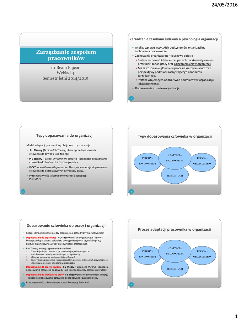 24/05/2016 Zarzadzanie zasobami ludzkimi a psychologia organizacji Analiza wpływu wszystkich podsystemów organizacji na Zarządzanie zespołem pracowników zachowania pracownicze Zachowania organizacyjne – kluczowe pojęcie System zachowań i działań związanych z wykorzystywaniem przez ludzi zadań pracy oraz osiąganiem celów organizacji dr Beata Bajcar Wykład 4 Semestr letni 2014/2015 Ma zastosowanie głównie w procesie kierowania ludźmi z perspektywy podmiotu zarządzającego i podmiotu zarządzanego. System wzajemnych oddziaływań podmiotów w organizacji i ich konsekwencji. Dopasowanie człowiek-organizacja 2 Typy dopasowania do organizacji Typy dopasowania człowieka w organizacji Model adaptacji pracowniczej obejmuje trzy koncepcje: P-J Theory (Person-Job Theory) - koncepcja dopasowania człowieka do zawodu jako takiego, P-E Theory (Person-Environment Theory) – koncepcja dopasowania człowieka do środowiska fizycznego pracy P-O Theory (Person-Organization Theory) - koncepcja dopasowania człowieka do organizacyjnych czynników pracy. Przeciwstawność a komplementarność koncepcji P-J vs P-O 3 4 Dopasowanie człowieka do pracy i organizacji Proces adaptacji pracownika w organizacji Rodzaj kompatybilności miedzy organizacją a zatrudnianym pracownikiem Dopasowanie do organizacji P-O Theory (Person-Organization Theory) - koncepcja dopasowania człowieka do organizacyjnych czynników pracy (kultury organizacyjnej, grupy pracowniczej i przełożonych) P-O Theory wymaga spełnienia warunków: 1. Zaspokojenie potrzeb stron, przynajmniej w jednym aspekcie 2. Podobieństwo miedzy zatrudnionym a organizacją 3. Obydwa warunki są spełnione (Kristof-Brown) 4. Identyfikacja pracownika z organizacją (tzn. poczucie jedności lub przynależności do grupy społecznej, jaką stanowi organizacja. Dopasowanie do pracy i zawodu - P-J Theory (Person-Job Theory) - koncepcja dopasowania człowieka do zawodu jako takiego (procesy selekcji i rekrutacji) Dopasowanie do środowiska pracy, P-E Theory (Person-Environment Theory) – koncepcja dopasowania człowieka do środowiska fizycznego pracy Przeciwstawność a komplementarność koncepcji P-J vs P-O 5 6 1 24/05/2016 Dopasowanie do organizacji a proces adaptacji pracownika w organizacji Dopasowanie wg P- O Theory dopasowanie P-O ma charakter systemowy, gdyż nie wynika jedynie z cech osoby ani cech otoczenia pracy, ale z istniejącej między nimi transakcji. Tak rozumiane dopasowanie P-O można opisywać na cztery różne sposoby: (1) jako stopień zgodności pomiędzy wartościami jednostki a wartościami organizacji; (2) jako przystawanie celów kadry kierowniczej i pozostałych pracowników organizacji; (3) jako zgodność między potrzebami i preferencjami pracownika a wzmocnieniami dostępnymi w otoczeniu pracy; (4) jako zgodność osobowości jednostki i kultury organizacji • Wg J. Szczepańskiego - proces adaptacji to świadoma i podświadoma modyfikacja społeczna nabytych cech, w taki sposób, aby były one zgodne z wzorami cech uznawanymi w danym środowisku za moralne i pożądane oraz żeby umożliwiały bezkonfliktowe współżycie. • Początkowo relację między pracownikiem a organizacją postrzegano jako proces jednostronny – adaptacja pracownicza, zawodowa bądź przystosowanie społeczne. • Adaptacja pracownicza jest natomiast procesem ciągłym, mającym miejsce przez cały czas zatrudnienia w danej organizacji. 7 8 Perspektywy analizy dopasowania komplementarnego Dopasowanie człowieka do pracy i organizacji Dopasowanie suplementarne - zgodność celów wartości i norm organizacji zatrudniającej z celami, wartościami i normami osoby zatrudnionej. Dopasowanie suplementarne występuje, gdy jednostka uzupełnia, wzbogaca lub posiada charakterystykę podobną do charakterystyki organizacji (np. kultura, klimat emocjonalny, wartości, cele, normy, itp.). Dopasowanie komplementarne — dostrojenie wymagań organizacji wobec zatrudnionego do jego możliwości sprostania tym wymaganiom oraz oczekiwań jednostki wobec organizacji i możliwości ich zaspokojenia (a) perspektywa potrzeby – zasoby (dopasowanie P-O występuje, gdy organizacja zaspokaja potrzeby, pragnienia i preferencje jednostki a jednostka inwestuje czas i energię w swoją karierę, w dużej części po to, aby zyskać to, czego potrzebuje); (b) perspektywa wymagania – zdolności (dopasowanie P-O występuje, gdy jednostka posiada zdolności niezbędne by sprostać wymaganiom organizacji). Dopasowanie komplementarne występuje, gdy charakterystyka jednostki Najprostszą forma dopasowania komplementarnego są wymagania tworzy całość z charakterystyką organizacji lub, gdy jednostka oferuje coś czego brakuje organizacji Dopasowanie tożsamościowe — definiowane jako poziom społecznej identyfikacji pracownika z organizacją zatrudniającą. 9 pracodawcy odnośnie do posiadanego doświadczenia, wykształcenia, znajomości języków obcych oraz oczekiwania kompetencyjne i finansowe stawiane przez pracownika. 10 Wielowymiarowa koncepcja dopasowania wg Amy Kristof 11 12 2 24/05/2016 Stopień dopasowania człowieka do organizacji Proces adaptacji pracownika w organizacji J. Baran wyróżnia dwa rodzaje adaptacji: • bierną (pracownik bezkrytycznie przystosowuje się do warunków pracy); Stopień dopasowania człowieka do organizacji zależy zarówno od właściwości pracownika, jak i od organizacji. Wśród cech indywidualnych pracownika sprzyjających dobremu dopasowaniu, obok kompetencji, wymienia się: • czynną (pracownik krytycznie i aktywnie ustosunkowuje się do warunków pracy akceptując tylko to, co dobre i odrzucając to, co złe – hamujące rozwój). otwartość na nowe doświadczenia, sumienność, Wymienia się także adaptację twórczą, polegającą m.in. na: inteligencję, 1. przekształcaniu istniejące stany rzeczy; cenione wartości, poczucie własnej skuteczności i kontroli 2. wnoszeniu do warunków pracy nowych el
