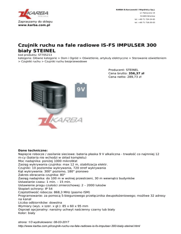 KARBA B.Karczewski i Wspólnicy Sp.J. ul. Fabryczna 14 53-609 Wrocław Zapraszamy do sklepu www.karba.com.pl tel. +48 71 724-24-65 tel. +48 71 718-20-03 Czujnik ruchu na fale radiowe IS-FS IMPULSER 300 biały STEINEL kod produktu: ST705213 kategoria: Główne kategorie > Dom i Ogród > Oświetlenie, artykuły elektryczne > Sterowanie oświetleniem > Czujniki ruchu > Czujniki ruchu bezprzewodowe Producent: STEINEL Cena brutto: 356,37 zł Cena netto: 289,73 zł Dane techniczne: Napięcie robocze / zasilanie sieciowe: bateria płaska 9 V alkaliczna - trwałość co najmniej 12 m-cy (bateria nie wchodzi w skład kompletu) Moc nadajnika: poniżej 1000 mikroWat Zasięg wykrywania czujnika: max 12 m, stabilizacja elektr. Czujniki: 10 poziomów wykrywania, 720 stref wykrywania Kąt wykrywania: 300° poziomo, 180° pionowo Zakres obracania czujnika: 80° Zasięg nadajnika: do 100 m w wolnej przestrzeni, 30 m wewnątrz budynków Ustawianie czasu: 1 min. – 15 min. Ustawienie progu czułości zmierzchowej: 2 – 2000 luksów Stopień ochrony: IP 54 Częstotliwość robocza: 868,3 MHz (pasmo ISM) Programowanie: za pomocą 5-biegunowego przełącznika dwupołożeniowego; możliwe 32 adresy na kanał Liczba odbiorników: dowolna Wymiary (wys. x szer. x gł.): 85 x 60 x 95 mm Osprzęt opcjonalny: narożny uchwyt naścienny czarny lub biały Kolor: biały strona: 1/3 wydrukowano: 08-03-2017 http://www.karba.com.pl/czujnik-ruchu-na-fale-radiowe-is-fs-impulser-300-bialy-steinel.html Opis: Bezprzewodowa wolność jest teraz jeszcze bezpieczniejsza i elastyczniejsza: nowa seria IMPULSER łączy najnowocześniejszą technikę czujników, inteligentne sterowanie mikroprocesorowe oraz bezpieczną transmisję radiową z częstotliwością 868,3 MHz w innowacyjne rozwiązanie dla ambitnych zadań nadzorowania powierzchni. Elementy systemu najnowszej technologii można dowolnie łączyć pojedynczo lub w grupy, co umożliwia doskonałe dostosowanie do indywidualnych potrzeb. Profesjonalna seria obejmuje czujniki, piloty, zewnętrzne reflektory halogenowe oraz moduły, za pomocą których można połączyć nowoczesny czujnik sensIQ oraz system lamp wewnętrznych z czujnikiem wysokiej częstotliwości RS PRO w automatyczny, bezprzewodowy system oświetleniowy. Sercem serii IMPULSER jest nowoczesna technika radiowa w paśmie częstotliwości 868,3 MHz. To pasmo częstotliwości ISM umożliwia bezzakłóceniową i bezprzewodową łączność między wszystkimi elementami systemu w maksymalnej odległości 100 m w otwartej przestrzeni. Możliwe jest też zamontowanie bardzo energooszczędnych nadajników. Za pomocą zasilanego baterią czujnika na podczerwień IS-FS 300 można bezprzewodowo kontrolować także odległe obszary. Wielka elastyczność serii IMPULSER została osiągnięta przez inteligentny system adresowania: każdy element może być ustawiony na jeden z 32 adresów. Oprócz tego pojedyncze elementy wykonawcze można łączyć w grupy. Polecenie włączenia od czujnika albo pilota jest przesyłane do wszystkich modułów radiowych w strefie zasięgu. Ale na to polecenie reagują tylko odbiorniki o tym samym adresie grupowym. Inteligentne sterowanie zapewnia, że światło zawsze włączane jest z sensem. Dlatego światła jakiejś grupy gasną dopiero wtedy, gdy ostatni timer aktywnych czujników skończy odliczać czas. Unikalne możliwości automatyzacji oświetlenia otwiera włączenie do serii IMPULSER innowacyjnego systemu lamp wewnętrznych RS PRO. W ten sposób po raz pierwszy umożliwiono płynne zintegrowanie oświetlenia wewnętrznego i zewnętrznego w bardzo efektywny system sterowania oświetleniem. - Szybki i łatwy montaż bez układania kabla, - Możliwości kompleksowego łączenia nadajników i odbiorników, - Dowolna konfiguracja nadajników i odbiorników, - Bezpieczna transmisja radiowa z częstotliwością 868,3 MHz, - Zasięg sygnału radiowego w otwartej przestrzeni do 100 m - możliwe ograniczenie przez różne przeszkody w polu widzenia (wewnątrz budynku idealne bezpieczne połączenie radiowe do 30 m), - Łatwe ustawianie możliwych 32 adresów przez 5-biegunowy przełącznik dwupołożeniowy, - Swobodne łączenie w sieć czujników, lamp zewnętrznych i wewnętrznych oraz innych elementów wykonawczych, - Odstraszanie nieproszonych gości przez automatyczne włączenie światła, - Kontrola w obiektach prywatnych, gospodarczych, przemysłowych i publicznych. - Komfort - Wygodne włączanie i wyłączanie lamp za pomocą pilota, który może być jednocześnie ustawiony na 4 różne stałe adresy IS-FS 300 - czujnik ruchu 300° na fale radiowe do montażu na ścianie i w narożnikach. W strefie o powierzchni ok. 300 m2 wykrywa każdy ruch i przesyła sygnał radiowy do każdego odbiornika firmy STEINEL. strona: 2/3 wydrukowano: 08-03-2017 http://www.karba.com.pl/czujnik-ruchu-na-fale-radiowe-is-fs-impulser-300-bialy-steinel.html strona: 3/3 wydrukowano: 08-03-2017 http://www.karba.com.pl/czujnik-ruchu-na-fale-radiowe-is-fs-impulser-300-bialy-steinel.html