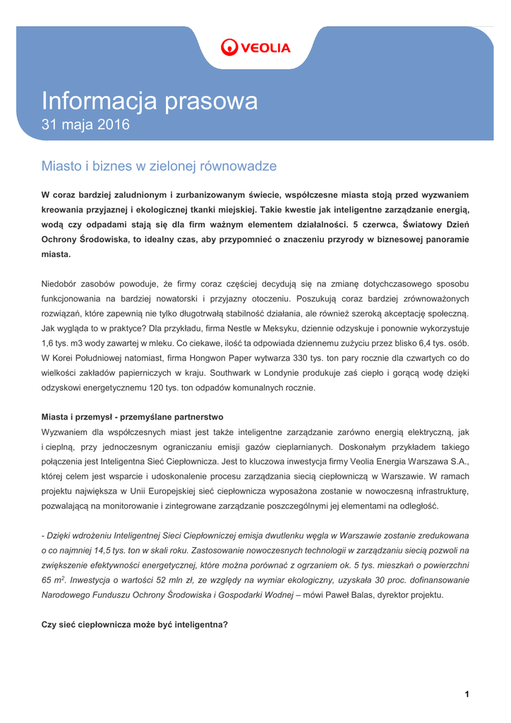 Informacja prasowa 31 maja 2016 Miasto i biznes w zielonej równowadze W coraz bardziej zaludnionym i zurbanizowanym świecie, współczesne miasta stoją przed wyzwaniem kreowania przyjaznej i ekologicznej tkanki miejskiej. Takie kwestie jak inteligentne zarządzanie energią, wodą czy odpadami stają się dla firm ważnym elementem działalności. 5 czerwca, Światowy Dzień Ochrony Środowiska, to idealny czas, aby przypomnieć o znaczeniu przyrody w biznesowej panoramie miasta. Niedobór zasobów powoduje, że firmy coraz częściej decydują się na zmianę dotychczasowego sposobu funkcjonowania na bardziej nowatorski i przyjazny otoczeniu. Poszukują coraz bardziej zrównoważonych rozwiązań, które zapewnią nie tylko długotrwałą stabilność działania, ale również szeroką akceptację społeczną. Jak wygląda to w praktyce? Dla przykładu, firma Nestle w Meksyku, dziennie odzyskuje i ponownie wykorzystuje 1,6 tys. m3 wody zawartej w mleku. Co ciekawe, ilość ta odpowiada dziennemu zużyciu przez blisko 6,4 tys. osób. W Korei Południowej natomiast, firma Hongwon Paper wytwarza 330 tys. ton pary rocznie dla czwartych co do wielkości zakładów papierniczych w kraju. Southwark w Londynie produkuje zaś ciepło i gorącą wodę dzięki odzyskowi energetycznemu 120 tys. ton odpadów komunalnych rocznie. Miasta i przemysł - przemyślane partnerstwo Wyzwaniem dla współczesnych miast jest także inteligentne zarządzanie zarówno energią elektryczną, jak i cieplną, przy jednoczesnym ograniczaniu emisji gazów cieplarnianych. Doskonałym przykładem takiego połączenia jest Inteligentna Sieć Ciepłownicza. Jest to kluczowa inwestycja firmy Veolia Energia Warszawa S.A., której celem jest wsparcie i udoskonalenie procesu zarządzania siecią ciepłowniczą w Warszawie. W ramach projektu największa w Unii Europejskiej sieć ciepłownicza wyposażona zostanie w nowoczesną infrastrukturę, pozwalającą na monitorowanie i zintegrowane zarządzanie poszczególnymi jej elementami na odległość. - Dzięki wdrożeniu Inteligentnej Sieci Ciepłowniczej emisja dwutlenku węgla w Warszawie zostanie zredukowana o co najmniej 14,5 tys. ton w skali roku. Zastosowanie nowoczesnych technologii w zarządzaniu siecią pozwoli na zwiększenie efektywności energetycznej, które można porównać z ogrzaniem ok. 5 tys. mieszkań o powierzchni 65 m2. Inwestycja o wartości 52 mln zł, ze względy na wymiar ekologiczny, uzyskała 30 proc. dofinansowanie Narodowego Funduszu Ochrony Środowiska i Gospodarki Wodnej – mówi Paweł Balas, dyrektor projektu. Czy sieć ciepłownicza może być inteligentna? 1 Informacja prasowa 31 maja 2016 Warszawska sieć ciepłownicza to największe tego typu rozwiązanie w Unii Europejskiej. Każdego dnia ponad 1700 kilometrów sieci dostarcza ciepło systemowe do budynków użyteczności publicznej, biur, zakładów przemysłowych, a przede wszystkim do mieszkań Warszawiaków. To rozwiązanie bezpieczne i korzystne ekonomicznie, które pokrywa 80 proc. potrzeb stolicy, ponad 19 tys. obiektów. W ramach wdrażanego projektu istniejąca sieć zostanie wyposażona w nowoczesną infrastrukturę, która umożliwi sterowanie poszczególnymi elementami z jednego centrum decyzyjnego. Rozwiązania z zakresu telemetrii i telesterowania pozwolą zdalnie, bezprzewodowo kontrolować pracę 3 przepompowni, 79 komór ciepłowniczych i 2500 węzłów cieplnych. Inteligencja systemu to jednak przede wszystkim wsparcie procesu decyzyjnego. Dzięki specjalnym algorytmom analizującym dane bieżące i historyczne, ISC wskazywać będzie dyspozytorom optymalny, czyli najbardziej efektywny scenariusz pracy sieci w zastanych warunkach. … Veolia Energia Warszawa S.A. zarządza największą w Unii Europejskiej siecią ciepłowniczą, dostarczającą ciepło systemowe do 80% budynków w Warszawie. Każdego dnia ponad 1100 pracowników Spółki czuwa nad bezpieczeństwem i pewnością dostaw ciepła, dbając o właściwe funkcjonowanie 1740 km stołecznej sieci ciepłowniczej i tysięcy węzłów cieplnych. Od października 2011 r. Spółka jest częścią międzynarodowej Grupy Veolia, europejskiego lidera w zakresie usług energetycznych. www.energiadlawarszawy.pl Grupa Veolia jest uznaną światową marką specjalizującą się w optymalnym zarządzaniu zasobami naturalnymi. Zatrudnia ponad 179 tys. pracowników* na całym świecie. Grupa tworzy i wdraża rozwiązania w zakresie gospodarki wodnej, gospodarki odpadami i energią. Rozwiązania te przyczyniają się do zrównoważonego rozwoju miast i przemysłu. Rozwijając trzy uzupełniające się działalności, Veolia zapewnia dostęp do zasobów, chroni je oraz odnawia. W 2014 roku Veolia zaopatrzyła w wodę pitną 96 miliony mieszkańców, a 60 miliony objęła usługą uzdatniania wody. Wyprodukowała 52 mln MWh energii i odzyskała 31 mln ton odpadów na drodze odzysku materiałowego i energetycznego. www.veolia.com. Kontakt Adam Rafalski, Veolia Energia Warszawa S.A. [email protected] tel.: (+48) 22 658 52 17, (+48) 508 336 419 Paulina Górska, Multi Communications [email protected] tel.: (+48) 608 894 677 2
