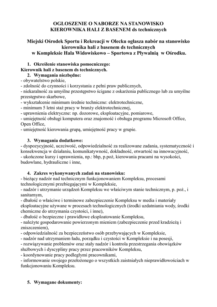 OGŁOSZENIE O NABORZE NA STANOWISKO KIEROWNIKA HALI Z BASENEM ds technicznych Miejski Ośrodek Sportu i Rekreacji w Olecku ogłasza nabór na stanowisko kierownika hali z basenem ds technicznych w Kompleksie Hala Widowiskowo – Sportowa z Pływalnią w Ośrodku. 1. Określenie stanowiska pomocniczego: Kierownik hali z basenem ds technicznych. 2. Wymagania niezbędne: - obywatelstwo polskie, - zdolność do czynności i korzystania z pełni praw publicznych, - niekaralność za umyślne przestępstwo ścigane z oskarżenia publicznego lub za umyślne przestępstwo skarbowe, - wykształcenie minimum średnie techniczne: elektrotechniczne, - minimum 5 letni staż pracy w branży elektrotechnicznej, - uprawnienia elektryczne: np. dozorowe, eksploatacyjne, pomiarowe, - umiejętność obsługi komputera oraz znajomość i obsługa programu Microsoft Office, Open Office, - umiejętność kierowania grupą, umiejętność pracy w grupie. 3. Wymagania dodatkowe: - dyspozycyjność, uczciwość, odpowiedzialność za realizowane zadania, systematyczność i konsekwencja w działaniu, komunikatywność, dokładność, otwartość na innowacyjność, - ukończone kursy i uprawnienia, np.: bhp, p.poż, kierowania pracami na wysokości, budowlane, hydrauliczne i inne, 4. Zakres wykonywanych zadań na stanowisku: - bieżący nadzór nad technicznym funkcjonowaniem Kompleksu, procesami technologicznymi przebiegającymi w Kompleksie, - nadzór i utrzymanie urządzeń Kompleksu we właściwym stanie technicznym, p. poż., i sanitarnym, - dbałość o właściwe i terminowe zabezpieczenie Kompleksu w media i materiały eksploatacyjne używane w procesach technologicznych (środki uzdatniania wody, środki chemiczne do utrzymania czystości, i inne), - dbałość o bezpieczne i prawidłowe eksploatowanie Kompleksu, - należyte gospodarowanie powierzonym mieniem (zabezpieczenie przed kradzieżą i zniszczeniem), - odpowiedzialność za bezpieczeństwo osób przebywających w Kompleksie, - nadzór nad utrzymaniem ładu, porządku i czystości w Kompleksie i na posesji, - rozwiązywanie problemów oraz stały nadzór i kontrola przestrzegania obowiązków służbowych i dyscypliny pracy przez pracowników Kompleksu, - koordynowanie pracy podległymi pracownikami, - informowanie swojego przełożonego o wszystkich zaistniałych nieprawidłowościach w funkcjonowaniu Kompleksu. 5. Wymagane dokumenty: - list motywacyjny, życiorys (CV), - oświadczenie kandydata o niekaralności za umyślne przestępstwo ścigane z oskarżenia publicznego lub za umyślne przestępstwo skarbowe, - oświadczenie o zdolności do czynności prawnych oraz korzystaniu z pełni praw publicznych, - kopie dokumentów poświadczających wykształcenie oraz kwalifikacje, - kopie świadectw pracy potwierdzających wymagany staż pracy lub zaświadczenie o aktualnym zatrudnieniu wymagany w pkt. 2, - kopie innych dodatkowych dokumentów o posiadanych kwalifikacjach i umiejętnościach, opinie, referencje. Za wiarygodność przedstawionych kopii dokumentów ponosi pełną odpowiedzialność osoba składająca dokumenty. Wymagane dokumenty należy przesyłać pocztą na adres: Miejski Ośrodek Sportu i Rekreacji, 19-400 Olecko, ul. Park 1 lub składać osobiście w sekretariacie – Olecko ul. Wojska Polskiego 5 (budynek PGK Olecko – II piętro) w terminie od 23 stycznia do 17 lutego 2012 r. do godz. 15.00., w zamkniętych kopertach z adnotacją: „Nabór na stanowisko kierownika hali z basenem ds technicznych w Kompleksie Hala Widowiskowo – Sportowa z Pływalnią w Ośrodku.” Dokumenty, które wpłyną do MOSiR po wyżej określonym terminie nie będą rozpatrywane. Informacja o wyniku naboru będzie umieszczona w Biuletynie Informacji Publicznej (BIP) na stronie internetowej MOSiR Olecko. .......................................................................................................................... Wymagane dokumenty: list motywacyjny, szczegółowe CV ( z uwzględnieniem dokładnego przebiegu kariery zawodowej), powinny być opatrzone klauzulą: „Wyrażam zgodę na przetwarzanie moich danych osobowych zawartych w ofercie pracy dla potrzeb niezbędnych do realizacji procesu rekrutacji zgodnie z Ustawą z dnia 29.08.1997r. o ochronie danych osobowych (Dz.U.z 2002r. Nr 101, poz.926 ze zm.) oraz Ustawą z dn. 21.11.2008r. o pracownikach samorządowych (Dz.U. Nr 223, poz.1458)”. Olecko, 23 stycznia 2012r. Informacja o naborze jest umieszczona w BIP na stronie internetowej MOSiR Olecko, na stronie internetowej Urzędu Miejskiego w Olecku, na tablicy ogłoszeń MOSiR Olecko (adres jak wyżej), w Głosie Olecka, w Tygodniku Oleckim.