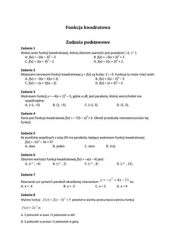 Funkcja kwadratowa Zadania podstawowe Zadanie 1 Wskaż wzór funkcji kwadratowej, której zbiorem wartości jest przedział 〈–2, +∞). A. f(x) = –2(x – 3)2 – 2 B. f(x) = –2(x + 3)2 + 2 D. f(x) = 2(x + 3)2 + 2. C. f(x) = 2(x – 3)2 – 2 Zadanie 2 Miejscami zerowymi funkcji kwadratowej y = f(x) są liczby: 2 i –3. Funkcja ta może mieć wzór: A. f(x) = –3(x – 3)(x + 2) B. f(x) = 2(x – 2)2 – 3 C. f(x) = –(x + 3)(x – 2) D. f(x) = (x + 3)2 – 2. Zadanie 3 Wykresem funkcji y = –4(x + 1)2 – 5, gdzie x∈R, jest parabola, której wierzchołek ma współrzędne: A. (–1, –5) B. (1, –5) C. (–1, 5) D. (1, 5). Zadanie 4 Dana jest funkcja kwadratowa f(x) = – 7(5 – x)2 + 3. Określ przedziały monotoniczności tej funkcji. Zadanie 5 Ile punktów wspólnych z osią OX ma parabola, będąca wykresem funkcji kwadratowej f(x) = –2x2 – 3x + 5? A. dwa B. jeden C. zero D. trzy Zadanie 6 Zbiorem wartości funkcji kwadratowej f(x) = –x(x – 4) jest: A. (–∞, –4〉 B. (–∞, 2〉 C. (–∞, 4〉 D. (–∞, 12〉. Zadanie 7 Równanie osi symetrii paraboli określonej równaniem y = − x + 4 x − 11 to: A. x = -4 B. x = -2 C. x = 2 D. x = 4 2 Zadanie 8 Wykres funkcji f ( x) = 2( x − 3) 2 + 5 powstał w wyniku przesunięcia wykresu funkcji f ( x) = 2 x 2 o: A. 3 jednostki w lewo i 5 jednostek w dół B. 3 jednostki w prawo i 5 jednostek w górę C. 3 jednostki w prawo i 5 jednostek w dół D. 3 jednostki w lewo i 5 jednostek w górę Zadanie 9 Naszkicuj wykres funkcji kwadratowej f(x) = 4x – x2, a następnie: a) podaj zbiór wartości funkcji f; b) wyznacz argumenty, dla których funkcja f przyjmuje wartości dodatnie; c) napisz równanie prostej będącej osią symetrii wykresu tej funkcji; d) przedstaw wzór funkcji f w postaci kanonicznej; e) przedstaw wzór funkcji f w postaci iloczynowej. Pozostałe zadania Zadanie 10 Wskaż równanie paraboli, której osią symetrii jest prosta o równaniu x = 2. A. y = x 2 − 8 x + 16 B. y = x 2 + 2 C. y = x 2 − 2 D. y = x 2 − 4 x + 4 Zadanie 11 Wskaż maksymalny przedział, w którym funkcja kwadratowa f(x) = –x2 + 4x – 3 jest rosnąca. A. (–∞, –1〉 B. 〈2, +∞) C. (–∞, 2〉 D. 〈–1, +∞) Zadanie 12 Napisz wzór funkcji kwadratowej, która spełnia jednocześnie następujące warunki: zbiorem wartości tej funkcji jest przedział 〈–2, +∞), do jej wykresu należy punkt P(4, 2), zaś osią symetrii wykresu jest prosta o równaniu x = 3. Zadanie 13 Oblicz największą i najmniejszą wartość funkcji kwadratowej y = –2x2 – 3x + 2 w przedziale domkniętym 〈–1, 2〉. Zadanie 14 Suma dwóch liczb rzeczywistych jest równa 18, a ich iloczyn wynosi 72. Wyznacz te liczby. Zadanie 15 Liczba 1 jest miejscem zerowym funkcji kwadratowej f(x) = –x + x2 + 2a – 1. Oblicz a. Dla wyznaczonej wartości a: a) przedstaw wzór funkcji f w postaci iloczynowej; b) naszkicuj wykres funkcji f; c) wyznacz argumenty, dla których funkcja f przyjmuje wartości nieujemne. Zadanie 16 Wykresem funkcji kwadratowej f jest parabola przecinająca oś OY w punkcie (0, 10), mająca oś symetrii o równaniu x = 2. Jednym z miejsc zerowych funkcji f jest liczba (–1). Wyznacz wzór funkcji kwadratowej f; podaj jego postać ogólną, iloczynową i kanoniczną. Rozwiąż nierówność f(x) > 0. Zadanie 17 Najmniejsza wartość funkcji kwadratowej f(x) = 2(x – 3)(x – 5) w przedziale 〈–6, 4〉 jest równa: A. –63 B. –1 C. –2 D. –128. Zadanie 18 Dane są funkcje liniowe f(x) = x – 1 oraz g(x) = –x + 2. Osią symetrii wykresu funkcji h opisanej za pomocą wzoru h(x) = f(x) ⋅g(x) jest prosta o równaniu: A. x = –1 B. x = 2 C. x = 1,5 D. x = –1,5. Zadanie 19 Miejscami zerowymi funkcji kwadratowej y = f(x) są liczby 2 i –4, a do wykresu tej funkcji należy punkt P(–2, –8). Zatem: A. f(x) = 2(x + 1)2 – 9 B. f(x) = 2(x – 2)2 + 8 C. f(x) = –(x – 2)2 – 8 D. f(x) = (x + 1)2 – 9.