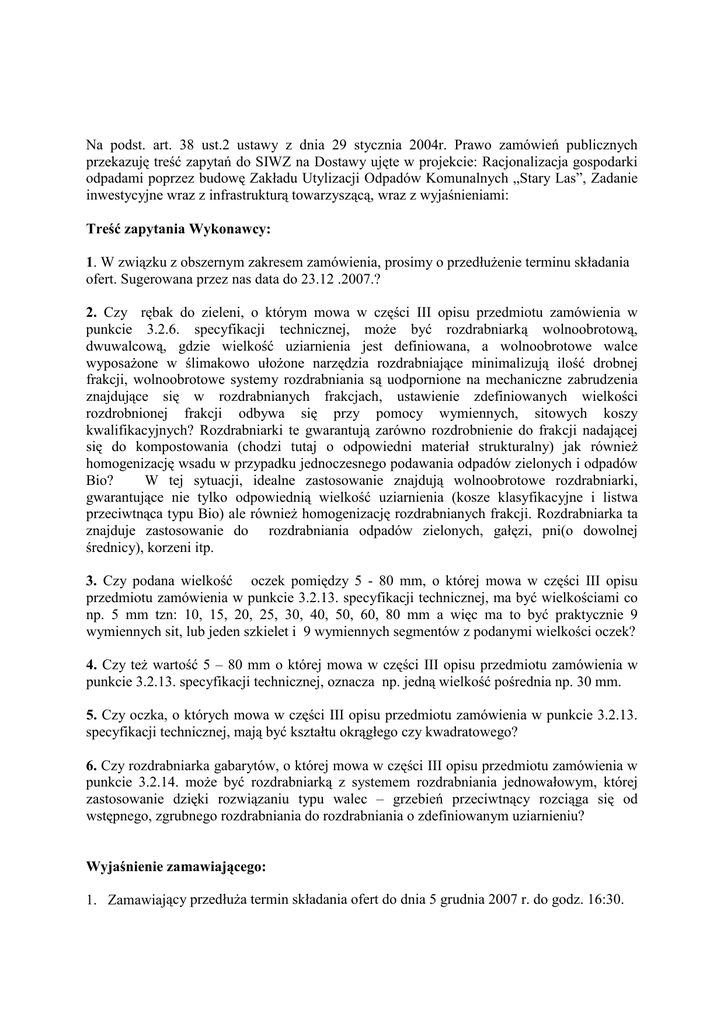 Na podst. art. 38 ust.2 ustawy z dnia 29 stycznia 2004r. Prawo zamówień publicznych przekazuję treść zapytań do SIWZ na Dostawy ujęte w projekcie: Racjonalizacja gospodarki odpadami poprzez budowę Zakładu Utylizacji Odpadów Komunalnych „Stary Las”, Zadanie inwestycyjne wraz z infrastrukturą towarzyszącą, wraz z wyjaśnieniami: Treść zapytania Wykonawcy: 1. W związku z obszernym zakresem zamówienia, prosimy o przedłuŜenie terminu składania ofert. Sugerowana przez nas data do 23.12 .2007.? 2. Czy rębak do zieleni, o którym mowa w części III opisu przedmiotu zamówienia w punkcie 3.2.6. specyfikacji technicznej, moŜe być rozdrabniarką wolnoobrotową, dwuwalcową, gdzie wielkość uziarnienia jest definiowana, a wolnoobrotowe walce wyposaŜone w ślimakowo ułoŜone narzędzia rozdrabniające minimalizują ilość drobnej frakcji, wolnoobrotowe systemy rozdrabniania są uodpornione na mechaniczne zabrudzenia znajdujące się w rozdrabnianych frakcjach, ustawienie zdefiniowanych wielkości rozdrobnionej frakcji odbywa się przy pomocy wymiennych, sitowych koszy kwalifikacyjnych? Rozdrabniarki te gwarantują zarówno rozdrobnienie do frakcji nadającej się do kompostowania (chodzi tutaj o odpowiedni materiał strukturalny) jak równieŜ homogenizację wsadu w przypadku jednoczesnego podawania odpadów zielonych i odpadów Bio? W tej sytuacji, idealne zastosowanie znajdują wolnoobrotowe rozdrabniarki, gwarantujące nie tylko odpowiednią wielkość uziarnienia (kosze klasyfikacyjne i listwa przeciwtnąca typu Bio) ale równieŜ homogenizację rozdrabnianych frakcji. Rozdrabniarka ta znajduje zastosowanie do rozdrabniania odpadów zielonych, gałęzi, pni(o dowolnej średnicy), korzeni itp. 3. Czy podana wielkość oczek pomiędzy 5 - 80 mm, o której mowa w części III opisu przedmiotu zamówienia w punkcie 3.2.13. specyfikacji technicznej, ma być wielkościami co np. 5 mm tzn: 10, 15, 20, 25, 30, 40, 50, 60, 80 mm a więc ma to być praktycznie 9 wymiennych sit, lub jeden szkielet i 9 wymiennych segmentów z podanymi wielkości oczek? 4. Czy teŜ wartość 5 – 80 mm o której mowa w części III opisu przedmiotu zamówienia w punkcie 3.2.13. specyfikacji technicznej, oznacza np. jedną wielkość pośrednia np. 30 mm. 5. Czy oczka, o których mowa w części III opisu przedmiotu zamówienia w punkcie 3.2.13. specyfikacji technicznej, mają być kształtu okrągłego czy kwadratowego? 6. Czy rozdrabniarka gabarytów, o której mowa w części III opisu przedmiotu zamówienia w punkcie 3.2.14. moŜe być rozdrabniarką z systemem rozdrabniania jednowałowym, której zastosowanie dzięki rozwiązaniu typu walec – grzebień przeciwtnący rozciąga się od wstępnego, zgrubnego rozdrabniania do rozdrabniania o zdefiniowanym uziarnieniu? Wyjaśnienie zamawiającego: 1. Zamawiający przedłuŜa termin składania ofert do dnia 5 grudnia 2007 r. do godz. 16:30. 2. Zamawiający dopuszcza rozdrabniarkę zieleni wolnoobrotową przy gwarancji efektu załoŜonego w projekcie. 3. Zamawiający oczekuje, Ŝe wymienny wkład sita przewoźnego będzie szkieletem z siedmioma wymiennymi sitami o wielkości oczek 15, 25, 35, 45, 55, 65, 75. 4. Odpowiedź zawarta jest w punkcie 3. 5. Zamawiający nie określa kształtu oczek przesiewających w bębnie sitowym. 6. Zamawiający dopuszcza rozdrabniarkę jednowałową przy gwarancji efektu załoŜonego w projekcie. Z upowaŜnienia Przewodniczącej Komisji Mariusz Karpała Sekretarz Komisji Przetargowej (-)