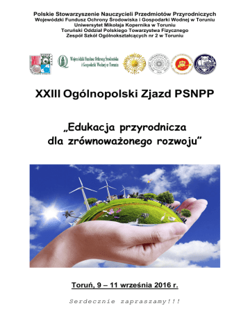 Polskie Stowarzyszenie Nauczycieli Przedmiotów Przyrodniczych Wojewódzki Fundusz Ochrony Środowiska i Gospodarki Wodnej w Toruniu Uniwersytet Mikołaja Kopernika w Toruniu Toruński Oddział Polskiego Towarzystwa Fizycznego Zespół Szkół Ogólnokształcących nr 2 w Toruniu XXIII Ogólnopolski Zjazd PSNPP „Edukacja przyrodnicza dla zrównoważonego rozwoju” Toruń, 9 – 11 września 2016 r. Serdecznie zapraszamy!!! „EDUKACJA PRZYRODNICZA DLA ZRÓWNOWAŻONEGO ROZWOJU” Godz. Piątek 9.09.2016 Godz. WFAiIS UMK Sobota 10.09.2016 Godz. ZSO nr 2 WFAiIS UMK Rejestracja 9.00-9.15 Zbiórka pod DS nr 6 uczestników 9.00-10.00 14.45-15.00 Otwarcie XXIII Zjazdu 9.15-9.40 Przejazd do ZSO nr 2 13.00-14.45 15.00-16.00 Wykład 1 9.40-10.00 16.00-17.00 Wykład 2 10.00-10.15 17.00-17.30 Przerwa kawowa 10.15-10.30 17.30-18.30 Wykład 3 10.30-11.30 Umieszczenie plakatów Powitanie w ZSO nr 2 Warsztaty I 18.30-19.15 Czas wolny 11.30-12.30 Warsztaty II 19.15-20.00 Kolacja 12.30-13.00 Obiad 20.00-20.30 Przemarsz na Stare Miasto i Bulwar 13.00-14.00 Walne Zebranie Członków PSNPP 20.30-21.00 Rejs po Wiśle 14.00-15.00 Warsztaty III 21.00-21.30 Powrót do DS nr 6 15.00-15.30 Przerwa kawowa 15.30-16.30 Warsztaty IV 16.30-17.30 Warsztaty V 17.30-18.00 Sesja plakatowa Przerwa kawowa Niedziela 11.09.2016 Wykład 4 10.00-11.00 Przerwa kawowa, podsumowanie sesji plakatowej 11.00-12.00 Wykład 5 12.00-12.15 Zakończenie XXIII Zjazdu 18.00-18.30 Przejazd do DS nr 6 W1. W2. W3. W4. W5. 18.30-20.00 Czas wolny 20.00-22.00 Uroczysta kolacja Dr Anna Batorczak, Centrum Badań nad Środowiskiem i Zrównoważonym Rozwojem UW, Jak uczyć o zrównoważonym rozwoju nauczycieli różnych przedmiotów? Prof. dr hab. Małgorzata Igalson, Zakład Półprzewodników, Wydział Fizyki Politechniki Warszawskiej, Ogniwa słoneczne: rozwój i perspektywy technologii fotowoltaicznych. Dr hab. Adriana Szmidt-Jaworska, Katedra Fizjologii Roślin i Biotechnologii UMK, GMO – za i przeciw. Prof. dr hab. Włodzimierz Tyburski, Instytut Filozofii UMK, Aksjologiczny wymiar zrównoważonego rozwoju. Prof. dr hab. Roman Buczkowski, dr Bartłomiej Igliński, Zakład Chemicznych Procesów Proekologicznych UMK, Odnawialne Źródła Energii – teraźniejszość i przyszłość. MIEJSCE XXIII ZJAZDU PSNPP Zjazd odbędzie się w Toruniu, w dniach 9-11 września 2016 r. (piątek, niedziela) na terenie Wydziału Fizyki, Astronomii i Informatyki Stosowanej UMK, ul. Grudziądzka 5 oraz Zespołu Szkół Ogólnokształcących nr 2 (sobota) 10 września br. ul. Kosynierów Kościuszkowskich 6. Koszty uczestnictwa 1. Opłata konferencyjna: do 31.07.2016 r. - Członkowie PSNPP: Inni uczestnicy: 200 zł 220 zł po 31.07.2016 r. - Członkowie PSNPP: Inni uczestnicy: 220 zł 240 zł Formularz zgłoszeniowy - strona PSNPP: http://psnpp.org.pl Opłata Konferencyjna obejmuje: koszty organizacji Konferencji, teczkę uczestnika z materiałami konferencyjnymi, koszt przerw kawowych (kawa, herbata), piątkowej kolacji, rejsu po Wiśle, sobotniego obiadu oraz sobotniej uroczystej kolacji. 2. Koszty noclegu (płatne w dniu zakwaterowania) w Domu Studenckim UMK nr 6, ul. J. Słowackiego 1/3: Ceny: a) pokój jednoosobowy: 50 zł, b) pokój dwuosobowy: 40 zł / osoba, c) pokój trzyosobowy: 30 zł / osoba. Istnieje możliwość zakupu śniadań (sobota, niedziela – 10 zł / posiłek), obiadu (niedziela – 18 zł) – płatne w Domu Studenckim. Faktury za noclegi będą wystawiane przez Dom Studencki w okresie zakwaterowania, po wcześniejszym dostarczeniu odpowiednich, niezbędnych danych. 3. Bardzo prosimy osoby, które nie opłaciły jeszcze składki za rok 2014, 2015 oraz aktualnej za rok 2016 o jej wpłatę wraz z opłatą konferencyjną. Opłatę konferencyjną prosimy przekazać na konto PSNPP: PKO BP II O/Toruń 88 1020 5011 0000 9002 0111 8579 z dopiskiem XXIII Zjazd PSNPP najpóźniej do dnia 05.09.2016 r.: Informujemy ponadto, że w przypadku 05.09.2016 r. wpłata nie zostanie zwrócona. rezygnacji z udziału w Konferencji po terminie ZGŁASZANIE PREZENTACJI Uprzejmie zapraszamy do nadsyłania zgłoszeń prezentacji w formie warsztatów i plakatów. Do zgłoszenia należy dołączyć krótkie streszczenie prezentacji (maks. 1/2 strony). Zależy nam bardzo, aby prezentowane na Zjeździe prace zostały opublikowane w Biuletynie „Nauczanie Przedmiotów Przyrodniczych” przed Zjazdem i rozdane Uczestnikom podczas Zjazdu. Propozycje prezentacji prosimy przesyłać listownie na adres Sekretariatu PSNPP z dopiskiem „dla dr Józefiny Turło” lub elektronicznie na adres: [email protected] (tel.: 056-611-32-53) Termin nadsyłania propozycji prezentacji upływa 16.08.2016 r. Brak streszczenia uniemożliwi prezentację! Prosimy nie przywozić modeli, makiet, etc. Informujemy, że w trakcie Zjazdu rozstrzygnięty zostanie Konkurs na najlepszą pracę plakatową (o wymiarach 70cm x 100 cm) nt.: „OZE w naszym środowisku” (Regulamin tego Konkursu został zamieszczony w poprzednim numerze NPP (Nr 56, 4/2015).