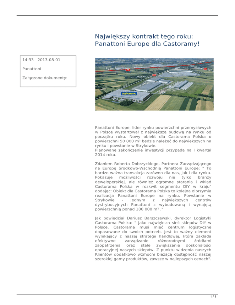 Największy kontrakt tego roku: Panattoni Europe dla Castoramy! 14:33 2013-08-01 Panattoni Załączone dokumenty: Panattoni Europe, lider rynku powierzchni przemysłowych w Polsce wystartował z największą budową na rynku od początku roku. Nowy obiekt dla Castorama Polska o powierzchni 50 000 m² będzie należeć do największych na rynku i powstanie w Strykowie. Planowane zakończenie inwestycji przypada na I kwartał 2014 roku. Zdaniem Roberta Dobrzyckiego, Partnera Zarządzającego na Europę Środkowo-Wschodnią Panattoni Europe: " To bardzo ważna transakcja zarówno dla nas, jak i dla rynku. Pokazuje możliwości rozwoju nie tylko branży deweloperskiej, ale również ogromne starania i wkład Castorama Polska w rozkwit segmentu DIY w kraju" dodając: Obiekt dla Castorama Polska to kolejna olbrzymia realizacja Panattoni Europe na rynku. Powstanie w Strykowie jednym z największych centrów dystrybucyjnych Panattoni z wybudowaną i wynajętą powierzchnią ponad 100 000 m² ." Jak powiedział Dariusz Barszczewski, dyrektor Logistyki Castorama Polska: " Jako największa sieć sklepów DIY w Polsce, Castorama musi mieć centrum logistyczne dopasowane do swoich potrzeb. Jest to ważny element wynikający z naszej strategii handlowej, która zakłada efektywne zarządzanie różnorodnymi źródłami zaopatrzenia oraz stałe zwiększanie doskonałości operacyjnej naszych sklepów. Z punktu widzenia naszych Klientów dodatkowo wzmocni bieżącą dostępność naszej szerokiej gamy produktów, zawsze w najlepszych cenach". 1/1