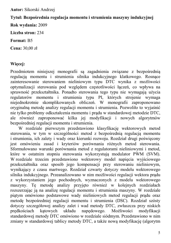 Autor: Sikorski Andrzej Tytuł: Bezpośrednia regulacja momentu i strumienia maszyny indukcyjnej Rok wydania: 2009 Liczba stron: 234 Format: B5 Cena: 30,00 zł Więcej: Przedmiotem niniejszej monografii są zagadnienia związane z bezpośrednią regulacją momentu i strumienia silnika indukcyjnego klatkowego. Rosnące zainteresowanie sterowaniem nieliniowym typu DTC wynika z możliwości optymalizacji sterowania pod względem częstotliwości łączeń, co wpływa na sprawność przekształtnika. Ponadto sterowania tego typu nie wymagają użycia regulatorów momentu i strumienia typu PI, których strojenie wymaga niejednokrotnie skomplikowanych obliczeń. W monografii zaproponowano oryginalną metodę analizy regulacji momentu i strumienia. Pozwoliło to wyjaśnić nie tylko problemy odkształcenia momentu i prądu w standardowej metodzie DTC, ale również zaproponować kilka jej modyfikacji i nowych algorytmów bezpośredniej regulacji momentu i strumienia. W rozdziale pierwszym przedstawiono klasyfikację wektorowych metod sterowania, w tym w szczególności metod z bezpośrednią regulacją momentu i strumienia, ich zalety i wady oraz kierunki rozwoju. Rozdział drugi poświęcony jest omówieniu zasad i kryteriów porównania różnych metod sterowania. Sformułowano warunki porównania metod z regulatorami nieliniowymi i metod, które w ostatnim stopniu sterowania wykorzystują modulator PWM (SVM). W rozdziale trzecim przedstawiono wektorowy model napięcia wyjściowego przekształtnika oraz sposób jego kompensacji przy sterowaniu nieliniowym, wynikający z czasu martwego. Rozdział czwarty dotyczy modelu wektorowego silnika indukcyjnego. Przeanalizowano w nim możliwości regulacji wektora prądu z wykorzystaniem jego pochodnych, wyznaczonych z modelu wektorowego maszyny. Tę metodę analizy przyjęto również w kolejnych rozdziałach rozszerzając ją na analizę regulacji momentu i strumienia maszyny. W rozdziale piątym omówiono podstawowe wady nieliniowych metod regulacji prądu oraz metodę bezpośredniej regulacji momentu i strumienia (DSC). Rozdział szósty dotyczy szczegółowej analizy zalet i wad metody DTC, zwłaszcza przy niskich prędkościach kątowych układu napędowego. Możliwości modyfikacji standardowej metody DTC omówiono w rozdziale siódmym. Przedstawiono w nim zmiany w standardowej tablicy metody DTC, a także nową modyfikację (algorytm 5 DTC-δ) likwidującą zniekształcenia strumienia i prądu podczas pracy z niskimi prędkościami kątowymi maszyny. Rozdział ósmy poświęcono omówieniu podstawowych błędów popełnianych przy realizacji sterowania z bezpośrednią regulacją momentu i strumienia. W kolejnych dwóch rozdziałach (9 i 10) zaprezentowano oryginalną metodę regulacji momentu i strumienia (DTFC-3A) oraz jej modyfikację (DTFC-3Am), umożliwiającą zmniejszenie tętnień momentu przełączania zaworów przekształtnika. Podsumowaniem i częstotliwości nieliniowych metod sterowania jest przedstawiona w rozdziale jedenastym jedna z możliwych wersji predykcyjnych algorytmów sterowania (DTFC-P). W celu porównania nieliniowych i liniowych metod bezpośredniej regulacji momentu i strumienia w rozdziale 12 omówiono trzy wersje tzw. metod DTC-SVM. Metody te charakteryzują się wykorzystaniem regulatorów PI i modulatora PWM w ostatnim członie układu sterowania. Monografię kończy porównanie właściwości wszystkich omówionych metod bezpośredniej regulacji momentu i strumienia, przedstawione w rozdziale trzynastym. Informacje uzupełniające dotyczące stanowiska laboratoryjnego, na którym prowadzono testy oraz modelu odtwarzania strumienia i momentu maszyny zaprezentowano w rozdziale czternastym. Fragmenty niniejszej monografii są efektem realizacji projektów badawczych, finansowanych ze środków na naukę w latach 2003-2007, realizowanych pod kierunkiem autora przez pracowników Katedry Energoelektroniki i Napędów Elektrycznych Wydziału Elektrycznego Politechniki Białostockiej. Szczególne podziękowania kieruje autor do mgra inż. Marka Korzeniewskiego, projektanta i wykonawcy mikroprocesorowego systemu sterowania oraz przekształtnika, a także współautora wielu cytowanych w monografii publikacji. Niniejsza praca adresowana jest przede wszystkim do doktorantów i studentów studiów drugiego stopnia i słuchaczy studiów podyplomowych na kierunku elektrotechnika oraz zaawansowanych kursów energoelektroniki i napędów elektrycznych, a także do inżynierów praktyków pragnących pogłębić swoją wiedzę w tematyce zaawansowanych układów sterowania z bezpośrednią regulacją momentu i strumienia silników indukcyjnych. Zaproponowane algorytmy mogą stanowić inspirację do tworzenia nowych nieliniowych metod sterowania przekształtników energoelektronicznych, zwłaszcza o strukturach wielopoziomowych. [Przedmowa] 6