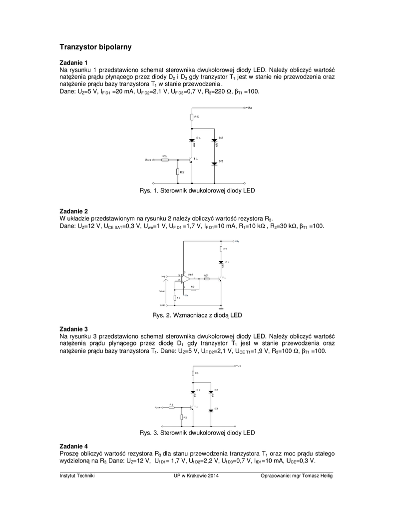 Tranzystor bipolarny Zadanie 1 Na rysunku 1 przedstawiono schemat sterownika dwukolorowej diody LED. Należy obliczyć wartość natężenia prądu płynącego przez diody D2 i D3 gdy tranzystor T1 jest w stanie nie przewodzenia oraz natężenie prądu bazy tranzystora T1 w stanie przewodzenia . Dane: UZ=5 V, IF D1 =20 mA, UF D2=2,1 V, UF D3=0,7 V, R3=220 Ω, βT1 =100. Rys. 1. Sterownik dwukolorowej diody LED Zadanie 2 W układzie przedstawionym na rysunku 2 należy obliczyć wartość rezystora R3. Dane: UZ=12 V, UCE SAT=0,3 V, Uwe=1 V, UF D1 =1,7 V, IF D1=10 mA, R1=10 kΩ , R2=30 kΩ, βT1 =100. Rys. 2. Wzmacniacz z diodą LED Zadanie 3 Na rysunku 3 przedstawiono schemat sterownika dwukolorowej diody LED. Należy obliczyć wartość natężenia prądu płynącego przez diodę D1 gdy tranzystor T1 jest w stanie przewodzenia oraz natężenie prądu bazy tranzystora T1. Dane: UZ=5 V, UF D2=2,1 V, UCE T1=1,9 V, R3=100 Ω, βT1 =100. Rys. 3. Sterownik dwukolorowej diody LED Zadanie 4 Proszę obliczyć wartość rezystora R3 dla stanu przewodzenia tranzystora T1 oraz moc prądu stałego wydzieloną na R3. Dane: UZ=12 V, Uf D1= 1,7 V, Uf D2=2,2 V, Uf D3=0,7 V, IfD1=10 mA, UCE=0,3 V. Instytut Techniki UP w Krakowie 2014 Opracowanie: mgr Tomasz Heilig Rys. 4. Schemat sygnalizatora świetlnego Zadanie 5 W układzie przedstawionym na rysunku 5 należy obliczyć wartość rezystora R4 oraz moc prądu stałego PR4. Dane: UZ=12 V, UCE SAT=0,3 V, UF D1 =1,7 V, IF D1=10 mA. Rys. 5. Wzmacniacz z diodą LED Zadanie 6 W układzie przedstawionym na rysunku 5 należy obliczyć minimalną wartość współczynnika wzmocnienie prądowego tranzystora T1, który umożliwi przejście tranzystora w stan przewodzenia i świecenie diody D1. Dane: R1=1 kΩ, R2=99 kΩ, R3=3 kΩ, Uwe=10 mV, UCE=0,5 V, UZ=12 V, R4=470 Ω, UD1=2,1 V, UBE=0,7 V. Zadanie 7 Na rysunku 6 przedstawiono układ kontroli napięcia. W przypadku gdy tranzystor T1 jest zatkany, świeci dioda D2 i natężenie prądu płynącego przez tę diodę jest równe ID2=9 mA. Proszę obliczyć wartość natężenia prądu płynącego przez diodę D1 gdy tranzystor T1 jest w stanie przewodzenia. Dane: UZ=12 V, UCET1=0,9 V, UFD1 =2,1 V, ID2=9 mA, UFD2 =3 V. Rys. 6. Układ kontroli napięcia akumulatora NiCd. Zadanie 8 W układzie przedstawionym na rysunku 6 proszę obliczyć wartości rezystorów: R5 i R6, wartość natężenia prądu przewodzenia IF diody D2 oraz minimalną wartość h21E dla następujących danych: UZ=12 V, UCET1=0,1 V, IFD1 =10 mA, IBT1=100 µA. Napięcie wyjściowe komparatora zmienia się w zakresie Uwy=(0,2-11,5)V. Instytut Techniki UP w Krakowie 2014 Opracowanie: mgr Tomasz Heilig