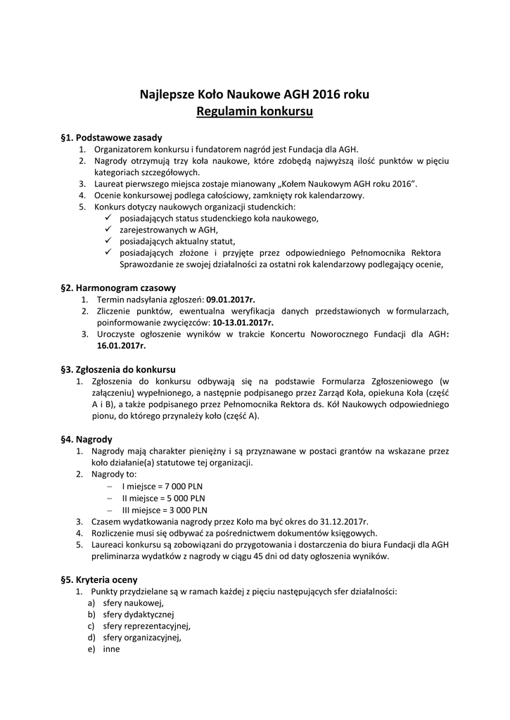 Najlepsze Koło Naukowe AGH 2016 roku Regulamin konkursu §1. Podstawowe zasady 1. Organizatorem konkursu i fundatorem nagród jest Fundacja dla AGH. 2. Nagrody otrzymują trzy koła naukowe, które zdobędą najwyższą ilość punktów w pięciu kategoriach szczegółowych. 3. Laureat pierwszego miejsca zostaje mianowany „Kołem Naukowym AGH roku 2016”. 4. Ocenie konkursowej podlega całościowy, zamknięty rok kalendarzowy. 5. Konkurs dotyczy naukowych organizacji studenckich:  posiadających status studenckiego koła naukowego,  zarejestrowanych w AGH,  posiadających aktualny statut,  posiadających złożone i przyjęte przez odpowiedniego Pełnomocnika Rektora Sprawozdanie ze swojej działalności za ostatni rok kalendarzowy podlegający ocenie, §2. Harmonogram czasowy 1. Termin nadsyłania zgłoszeń: 09.01.2017r. 2. Zliczenie punktów, ewentualna weryfikacja danych przedstawionych w formularzach, poinformowanie zwycięzców: 10-13.01.2017r. 3. Uroczyste ogłoszenie wyników w trakcie Koncertu Noworocznego Fundacji dla AGH: 16.01.2017r. §3. Zgłoszenia do konkursu 1. Zgłoszenia do konkursu odbywają się na podstawie Formularza Zgłoszeniowego (w załączeniu) wypełnionego, a następnie podpisanego przez Zarząd Koła, opiekuna Koła (część A i B), a także podpisanego przez Pełnomocnika Rektora ds. Kół Naukowych odpowiedniego pionu, do którego przynależy koło (część A). §4. Nagrody 1. Nagrody mają charakter pieniężny i są przyznawane w postaci grantów na wskazane przez koło działanie(a) statutowe tej organizacji. 2. Nagrody to: I miejsce = 7 000 PLN II miejsce = 5 000 PLN III miejsce = 3 000 PLN 3. Czasem wydatkowania nagrody przez Koło ma być okres do 31.12.2017r. 4. Rozliczenie musi się odbywać za pośrednictwem dokumentów księgowych. 5. Laureaci konkursu są zobowiązani do przygotowania i dostarczenia do biura Fundacji dla AGH preliminarza wydatków z nagrody w ciągu 45 dni od daty ogłoszenia wyników. §5. Kryteria oceny 1. Punkty przydzielane są w ramach każdej z pięciu następujących sfer działalności: a) sfery naukowej, b) sfery dydaktycznej c) sfery reprezentacyjnej, d) sfery organizacyjnej, e) inne 2. Rozwinięcie podpunktów dotyczących SFER DZIAŁALNOŚCI: a) sfera naukowa publikacje - wg punktacji MNiSW/publikację, publikacja bez punktacji MNiSW w konferencjach międzynarodowych – 2 pkt./publikację, publikacja bez punktacji MNiSW w konferencjach krajowych - 2 pkt./publikację, udział z referatem lub posterem, ale bez publikacji w konferencjach międzynarodowych 2 pkt./referat/poster, udział z referatem lub posterem, ale bez publikacji w konferencjach krajowych – 1 pkt./referat/poster, nagroda przyznana na konferencji międzynarodowej - I miejsce - 8 pkt., II miejsce - 4 pkt., III miejsce - 2 pkt. nagroda przyznana na konferencji ogólnopolskiej - I miejsce - 4 pkt., II miejsce – 2 pkt., III miejsce - 1 pkt., prowadzenie własnego grantu/projektu naukowego (np. Grantu Rektora) - 5 pkt. za każdy grant, organizacja konferencji - 5 pkt./konferencję, organizacja warsztatu lub szkolenia otwartego - 2 pkt./warsztat/szkolenie, organizacja własnego obozu naukowego - 4 pkt./obóz, b) sfera dydaktyczna: prowadzenie merytoryczne szkolenia lub warsztatu - 3 pkt./warsztat/szkolenie, prowadzenie lekcji w szkołach podstawowych i średnich – 3 pkt./warsztat/szkolenie, przeprowadzenie wymiany studenckiej z uczelnią zagraniczną - 3 pkt./event, przeprowadzenie wyjazdu studyjnego do zakładu przemysłowego - 2 pkt./wyjazd, c) sfera reprezentacyjna: organizacja i prowadzenie eventów promocyjnych dla AGH, macierzystego Wydziału, Katedry, kół naukowych - 3 pkt./reprezentację na 1 event'cie, reprezentacja/ambasadorstwo przedsiębiorstw lub innych jednostek w AGH – 2 pkt./przedsiębiorstwo, d) sfera organizacyjna: liczba członków: każde 10 osób = 1 pkt., ilość spotkań koła w roku: każde 5 spotkań = 1 pkt., e) inne: działania niestandardowe, "innowacyjne", nie mieszczące się w kategoriach a-d (maksymalnie 5 pkt.) 3. Punktacja i inne zasady, a także wyniki konkursu są jawne i pokazują się we wszystkich kanałach komunikacyjnych AGH i Fundacji dla AGH. 4. Wymagany jest załącznik objaśniający punktację przyznaną przez Zarząd Koła w Najlepsze Koło Naukowe AGH 2016 roku – Część B - Kwestionariusz Oceny. Załącznik pt.: „Objaśnienia do punktacji zawartej w dokumencie: Najlepsze Koło Naukowe AGH 2016 roku – Część B Kwestionariusz Oceny”.