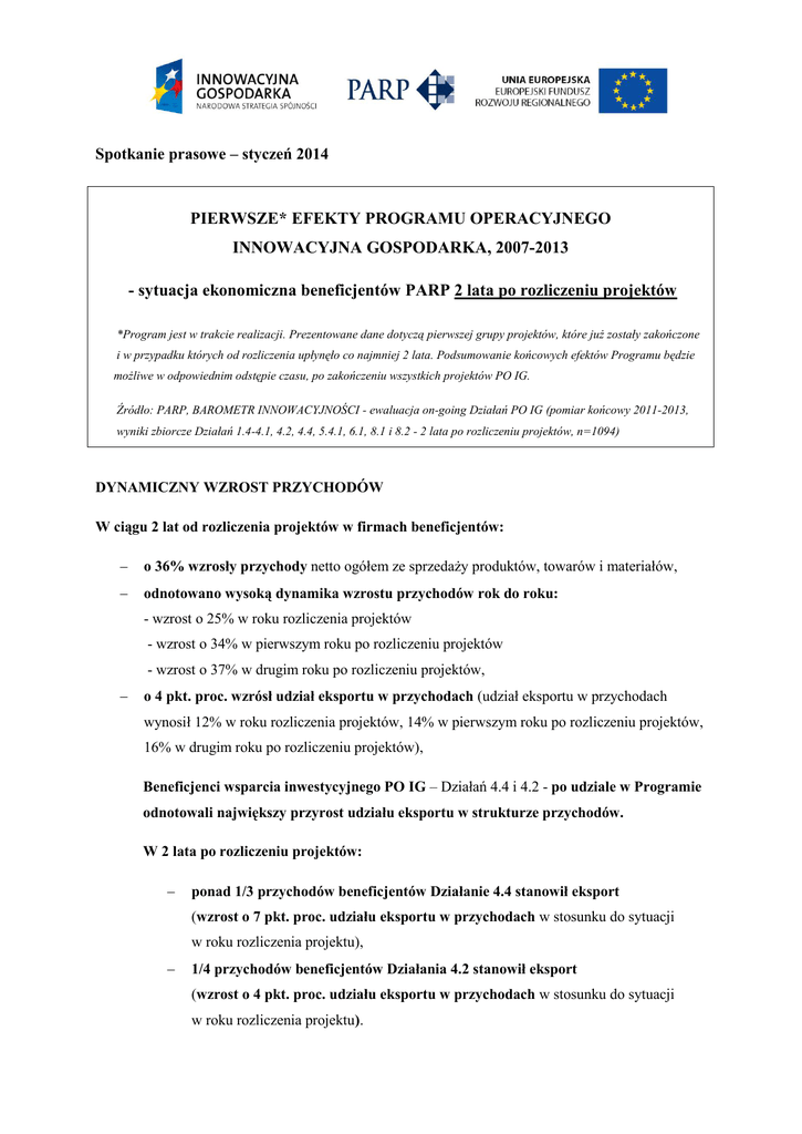 Spotkanie prasowe – styczeń 2014 PIERWSZE* EFEKTY PROGRAMU OPERACYJNEGO INNOWACYJNA GOSPODARKA, 2007-2013 - sytuacja ekonomiczna beneficjentów PARP 2 lata po rozliczeniu projektów *Program jest w trakcie realizacji. Prezentowane dane dotyczą pierwszej grupy projektów, które już zostały zakończone i w przypadku których od rozliczenia upłynęło co najmniej 2 lata. Podsumowanie końcowych efektów Programu będzie możliwe w odpowiednim odstępie czasu, po zakończeniu wszystkich projektów PO IG. Źródło: PARP, BAROMETR INNOWACYJNOŚCI - ewaluacja on-going Działań PO IG (pomiar końcowy 2011-2013, wyniki zbiorcze Działań 1.4-4.1, 4.2, 4.4, 5.4.1, 6.1, 8.1 i 8.2 - 2 lata po rozliczeniu projektów, n=1094) DYNAMICZNY WZROST PRZYCHODÓW W ciągu 2 lat od rozliczenia projektów w firmach beneficjentów: o 36% wzrosły przychody netto ogółem ze sprzedaży produktów, towarów i materiałów, odnotowano wysoką dynamika wzrostu przychodów rok do roku: - wzrost o 25% w roku rozliczenia projektów - wzrost o 34% w pierwszym roku po rozliczeniu projektów - wzrost o 37% w drugim roku po rozliczeniu projektów, o 4 pkt. proc. wzrósł udział eksportu w przychodach (udział eksportu w przychodach wynosił 12% w roku rozliczenia projektów, 14% w pierwszym roku po rozliczeniu projektów, 16% w drugim roku po rozliczeniu projektów), Beneficjenci wsparcia inwestycyjnego PO IG – Działań 4.4 i 4.2 - po udziale w Programie odnotowali największy przyrost udziału eksportu w strukturze przychodów. W 2 lata po rozliczeniu projektów: ponad 1/3 przychodów beneficjentów Działanie 4.4 stanowił eksport (wzrost o 7 pkt. proc. udziału eksportu w przychodach w stosunku do sytuacji w roku rozliczenia projektu), 1/4 przychodów beneficjentów Działania 4.2 stanowił eksport (wzrost o 4 pkt. proc. udziału eksportu w przychodach w stosunku do sytuacji w roku rozliczenia projektu). Blisko połowa beneficjentów twierdzi, że bez wsparcia uzyskanego z PO IG ich przychody ze sprzedaży ogółem byłby niższe. Co piąty beneficjent twierdzi, że niższy były roczny poziom przychodów ze sprzedaży na eksport. STABILNY WZROST ZATRUDNIENIA W ciągu 2 lat od rozliczenia projektów w firmach beneficjentów: o 4% wzrósł poziom zatrudnienia, łącznie zatrudnienie zwiększyło się o blisko 5 tys. dodatkowych miejsc pracy (etatów)1, średnio zatrudnienie wzrosło o 2 miejsca pracy (na jedną firmę); Dwóch na pięciu beneficjentów twierdzi, że bez wsparcia uzyskanego z PO IG poziom zatrudnienia w firmie byłby niższy. Dzięki realizacji projektu PO IG beneficjenci deklarują stworzenie średnio ok. 4 miejsc pracy w firmie. Utworzone miejsca pracy beneficjenci planują utrzymać zarówno w okresie trwałości projektu jak również po jego upływie (długofalowo). WZROST AKTYWNOŚCI INNOWACYJNEJ 2 lata po rozliczeniu projektów (w stosunku do okresu przed dofinansowaniem): zdecydowanie wzrosła liczba firm, które wprowadzają innowacje procesowe: o 14 pkt. proc wzrosła liczba firm wprowadzających innowacje w zakresie logistyki (wzrost z 24% przed dofinansowaniem do 38% po dofinansowaniu), o 9 pkt. proc. więcej firm wprowadza innowacje w procesie produkcji lub świadczenia usług (wzrost z 44% przed dofinansowaniem do 53% po dofinansowaniu), o 11 pkt. proc. wzrosła liczba firm wprowadzających innowacje wspierające pozostałe procesy w przedsiębiorstwie (wzrost z 35% przed dofinansowaniem do 46% po dofinansowaniu). Firmy częściej wprowadzają innowacje procesowe wcześniej nieobecne na rynku, na którym działają. o 8 pkt. proc. wzrosła liczba firm wprowadzających innowacje organizacyjne (wzrost z 74% przed dofinansowaniem do 82% po dofinansowaniu), 1 Wartość oszacowana = 4949 etatów, na podstawie KSI i 48% przebadanych projektów Działań 1.4-4.1, 4.2, 4.4, 5.4.1, 6.1, 8.1 i 8.2, w przypadku, których upłynęło już 2 lata od rozliczenia, n=1094). 2 o 3 pkt proc. wzrosła liczba firm wprowadzających innowacje produktowe - wzrost z 60% przed dofinansowaniem do 63% po dofinansowaniu (nieznacznie częściej są nimi nowe usługi niż wyroby oraz innowacje na poziomie przedsiębiorstwa niż dla rynku, na którym działa firma). W ciągu 2 lat od rozliczenia projektów firmy beneficjentów wprowadzały (dotyczy Działań 1.4-4.1, 4.2, 4.4, 5.4.1): średnio ponad 2 innowacje produktowe rocznie: średnio 2,27 innowacje produktowe w pierwszym roku po rozliczeniu projektu średnio 2,58 innowacje produktowe w drugim roku po rozliczeniu projektu średnio nieco poniżej jednej innowacji procesowej rocznie: średnio 0,58 innowacji procesowej w pierwszym roku po rozliczeniu projektu średnio 0,63 innowacji procesowej w drugim roku po rozliczeniu projektu Po zakończeniu projektów, firmom nie udało się utrzymać poziomu nakładów na działalność innowacyjną, jaki uzyskali w okresie udziału w Programie (podczas, gdy nakłady w okresie realizacji projektów rosły od 14% do 20% rok do roku, w pierwszym roku po rozliczeniu projektów nakłady wzrosły zaledwie o 5%, a w kolejnym spadły o 1%). Redukcja nakładów na działalność innowacyjną w firmach beneficjentów po zakończeniu udziału w Programie nie wpłynęła na spadek liczby tworzonych innowacji w badanym okresie. WZROST POTENCJAŁU DO DALSZEGO TWORZENIA INNOWACJI (dotyczy Działań 1.4-4.1, 4.2, 4.4, 5.4.1): 2 lata po rozliczeniu projektów (w stosunku do okresu przed dofinansowaniem): o 24 pkt. proc. wzrosła liczba firm, które prowadzą działalność badawczo-rozwojową Dwa lata po zakończeniu projektów 95% beneficjentów Działań 1.4-4.1, 4.2, 4.4, 5.4.1 prowadzi działalność B+R – wewnętrzną lub zewnętrzną; przed dofinansowaniem B+R prowadziło tylko 71%. o 36 pkt. proc wzrosła liczba firm, które prowadzą wewnętrzną działalność badawczorozwojową Firmy zainwestowały przede wszystkim we własny potencjał do tworzenia innowacji redukując przy tym o 14% skalę zlecania prac B+R podmiotom 