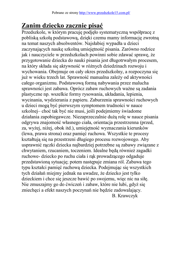Pobrano ze strony http://www.przedszkole15.com.pl/ Zanim dziecko zacznie pisać Przedszkole, w którym pracuję podjęło systematyczną współpracę z pobliską szkołą podstawową, dzięki czemu mamy informację zwrotną na temat naszych absolwentów. Najsłabiej wypadła u dzieci zaczynających naukę szkolną umiejętność pisania. Zarówno rodzice jak i nauczyciele w przedszkolach powinni sobie zdawać sprawę, że przygotowanie dziecka do nauki pisania jest długotrwałym procesem, na który składa się aktywność w różnych dziedzinach rozwoju i wychowania. Obejmuje on cały okres przedszkolny, a rozpoczyna się już w wieku trzech lat. Sprawność manualna zależy od aktywności całego organizmu. Podstawową formą nabywania przez malucha sprawności jest zabawa. Oprócz zabaw ruchowych ważne są zadania plastyczne np. wszelkie formy rysowania, układania, lepienia, wycinania, wydzierania z papieru. Zaburzenia sprawności ruchowych u dzieci mogą być pierwszym symptomem trudności w nauce szkolnej– choć tak być nie musi, jeśli podejmiemy świadome działania zapobiegawcze. Niezaprzeczalnie dużą rolę w nauce pisania odgrywa znajomość własnego ciała, orientacja przestrzenna (przed, za, wyżej, niżej, obok itd.), umiejętność wyznaczania kierunków (lewa, prawa strona) oraz pamięć ruchowa. Wszystkie te procesy kształtują się na przestrzeni długiego procesu rozwojowego. Aby usprawnić rączki dziecka najbardziej potrzebne są zabawy związane z chwytaniem, rzucaniem, toczeniem. Idealne będą również zagadki ruchowe- dziecko po ruchu ciała i rąk prowadzącego odgaduje przedstawioną sytuację; potem następuje zmiana ról. Zabawa tego typu kształci pamięć ruchową dziecka. Podejmując się wszystkich tych działań miejmy jednak na uwadze, że dziecko jest tylko dzieckiem i chce się jeszcze bawić po swojemu, więc nic na siłę. Nie zmuszajmy go do ćwiczeń i zabaw, które nie lubi, gdyż się zniechęci a efekt naszych poczynań nie będzie zadowalający. B. Krawczyk