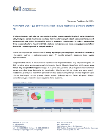 Warszawa, 7 października 2009 r. NewsPoint UGC – już 180 tysięcy źródeł i nowe możliwości pomiaru efektów PR W ciągu niespełna pół roku od uruchomienia usługi monitorowania blogów i forów NewsPoint UGC, NetSprint ponad dwukrotnie zwiększył ilość monitorowanych źródeł. Liczba monitorowanych forów wzrosła z 44 tysięcy do ponad 90 tysięcy, a blogów– z 29 tysięcy do 70 tysięcy. Jednocześnie firma rozszerzyła ofertę NewsPoint UGC o kolejne funkcjonalności, które pomagają mierzyć efekty działań PR i marketingowych w nowych mediach. Moduł statystyk oferuje teraz możliwość oceny wydźwięku poszczególnych postów lub komentarzy i stworzenia wykresu z podsumowaniem ocen. W module statystyk ulepszono także wygląd wykresów i tabel. Kolejna istotna zmiana w możliwościach raportowania dotyczy tworzenia listy artykułów w pliku csv (który można łatwo przekonwertować do formatu Excel). Obecnie NewsPoint UGC oferuje dwie wersje listy csv: podstawową (zawierającą m.in. pola: data, godzina, tytuł, długość wpisu w znakach, nazwa forum lub bloga, kategoria, do której należy blog/forum, link do tekstu oraz autor posta) i rozszerzoną (która poza wszystkimi parametrami listy podstawowej oferuje również fragment wpisu z forum lub bloga). Listy te grupują również wpisy z jednego wątku z forum lub post z bloga z komentarzami, jeśli wszystkie zawierają dane słowo kluczowe. NetSprint.pl Sp. z o.o. ul. BieŜanowska 7 02-655 Warszawa tel. +48 (022) 852 20 06, fax +48 (022) 852 20 60 [email protected], www.newspoint.pl NIP: 951-19-69-310 KRS 0000074676 Sąd Rejonowy dla m. St. Warszawy XIII Wydział Gospodarczy Krajowego Rejestru Sądowego Kapitał zakładowy: 85.250 PLN W ramach usług wsparcia dla PR i marketingu NewsPoint oferuje również nowy typ raportu, „Analiza opinii konsumenckiej”, przygotowywanego w oparciu o treści z blogów i forów. Dzięki przeanalizowaniu i sklasyfikowaniu opinii, raport przedstawia, jak kształtuje się konwersacja prowadzona w internecie na temat danej marki, firmy, produktu, usługi (lub całego typu usług). Materiał z tego typu badań pozwala na wychwycenie spontanicznie wyrażanych opinii konsumentów. Ponadto, wdrożono narzędzie do kontroli jakości, które – w odróżnieniu od konkurencyjnych rozwiązań monitorujących - umożliwia automatyczne wychwytywanie zmian przeprowadzonych w serwisach, takich jak dodanie nowych podstron czy zmiana struktury linków. Zmiany te powodują powstawanie luk w monitoringu, dlatego rozwiązaniach monitorujących internet tak istotna jest zaawansowana kontrola jakości, która pozwala na wychwytywanie większej liczby artykułów. ===== NewsPoint to usługa monitorowania komunikacji w internecie, wprowadzona przez NetSprint.pl dostawcę zaawansowanych rozwiązań wyszukiwawczych. System monitoruje prawie 2500 polskich i ponad 9000 serwisów zagranicznych, w tym portale, wortale oraz blogi. NewsPoint co kilka minut sprawdza obecność nowych publikacji w mediach online. Oprócz monitorowania mediów usługa umożliwia również łatwe zarządzanie pozyskanymi informacjami. Aplikacja automatycznie generuje wykresy i tabele, pozwala również na publikację znalezionych w sieci informacji na temat firmy na stronie WWW, intranecie lub kanale RSS. NewsPoint UGC to zaawansowany system przeszukujący blogi i fora. NewsPoint UGC monitoruje obecnie 90 tys. polskich forów i 70 tys. blogów z czterech największych platform w Polsce: blox.pl, blog.pl, bloog.pl i blog.onet.pl. NewsPoint jest narzędziem przydatnym podczas: . badania efektywności działań marketingowych i PR, . planowania marketingowego, . monitorowania działań konkurencji, . planowania kampanii reklamowych, . tworzenia strategii przedsiębiorstwa. Dodatkowe informacje: Olga Kamińska, PR Manager, NetSprint.pl Sp. z o.o. e-mail: [email protected] Ul. Bieżanowska 7, 02-655 Warszawa tel. 022 844 49 90 w. 404 Anna Miotk, dyrektor rozwoju biznesu NewsPoint, NetSprint.pl e-mail: [email protected] Ul. Bieżanowska 7, 02-655 Warszawa tel. 022 844 49 90 NetSprint.pl Sp. z o.o. ul. BieŜanowska 7 02-655 Warszawa tel. +48 (022) 852 20 06, fax +48 (022) 852 20 60 [email protected], www.newspoint.pl NIP: 951-19-69-310 KRS 0000074676 Sąd Rejonowy dla m. St. Warszawy XIII Wydział Gospodarczy Krajowego Rejestru Sądowego Kapitał zakładowy: 85.250 PLN