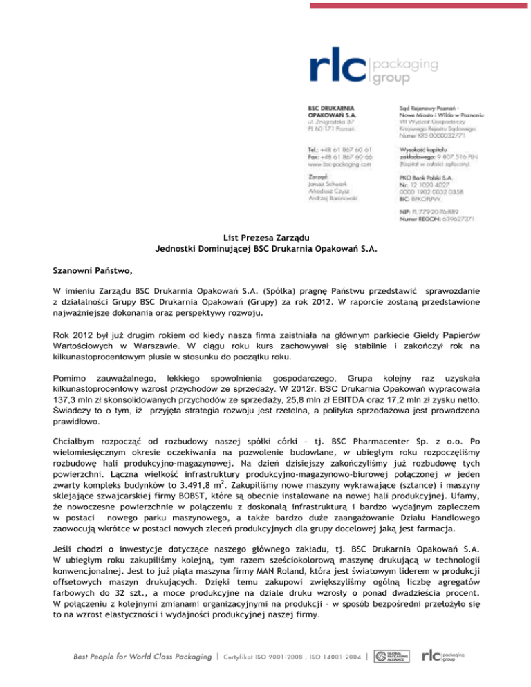 List Prezesa Zarządu Jednostki Dominującej BSC Drukarnia Opakowań S.A. Szanowni Państwo, W imieniu Zarządu BSC Drukarnia Opakowań S.A. (Spółka) pragnę Państwu przedstawić sprawozdanie z działalności Grupy BSC Drukarnia Opakowań (Grupy) za rok 2012. W raporcie zostaną przedstawione najwaŜniejsze dokonania oraz perspektywy rozwoju. Rok 2012 był już drugim rokiem od kiedy nasza firma zaistniała na głównym parkiecie Giełdy Papierów Wartościowych w Warszawie. W ciągu roku kurs zachowywał się stabilnie i zakończył rok na kilkunastoprocentowym plusie w stosunku do początku roku. Pomimo zauważalnego, lekkiego spowolnienia gospodarczego, Grupa kolejny raz uzyskała kilkunastoprocentowy wzrost przychodów ze sprzedaży. W 2012r. BSC Drukarnia Opakowań wypracowała 137,3 mln zł skonsolidowanych przychodów ze sprzedaży, 25,8 mln zł EBITDA oraz 17,2 mln zł zysku netto. Świadczy to o tym, iż przyjęta strategia rozwoju jest rzetelna, a polityka sprzedażowa jest prowadzona prawidłowo. Chciałbym rozpocząć od rozbudowy naszej spółki córki – tj. BSC Pharmacenter Sp. z o.o. Po wielomiesięcznym okresie oczekiwania na pozwolenie budowlane, w ubiegłym roku rozpoczęliśmy rozbudowę hali produkcyjno-magazynowej. Na dzień dzisiejszy zakończyliśmy juŜ rozbudowę tych powierzchni. Łączna wielkość infrastruktury produkcyjno-magazynowo-biurowej połączonej w jeden zwarty kompleks budynków to 3.491,8 m2. Zakupiliśmy nowe maszyny wykrawające (sztance) i maszyny sklejające szwajcarskiej firmy BOBST, które są obecnie instalowane na nowej hali produkcyjnej. Ufamy, Ŝe nowoczesne powierzchnie w połączeniu z doskonałą infrastrukturą i bardzo wydajnym zapleczem w postaci nowego parku maszynowego, a takŜe bardzo duŜe zaangaŜowanie Działu Handlowego zaowocują wkrótce w postaci nowych zleceń produkcyjnych dla grupy docelowej jaką jest farmacja. Jeśli chodzi o inwestycje dotyczące naszego głównego zakładu, tj. BSC Drukarnia Opakowań S.A. W ubiegłym roku zakupiliśmy kolejną, tym razem sześciokolorową maszynę drukującą w technologii konwencjonalnej. Jest to juŜ piąta maszyna firmy MAN Roland, która jest światowym liderem w produkcji offsetowych maszyn drukujących. Dzięki temu zakupowi zwiększyliśmy ogólną liczbę agregatów farbowych do 32 szt., a moce produkcyjne na dziale druku wzrosły o ponad dwadzieścia procent. W połączeniu z kolejnymi zmianami organizacyjnymi na produkcji – w sposób bezpośredni przełoŜyło się to na wzrost elastyczności i wydajności produkcyjnej naszej firmy. Ponadto nadal kontynuujemy wdraŜanie lean manufacturing, czego efektem jest poprawa większości wskaźników - zarówno wydajnościowych i jakościowych. Rozwijamy pracę naszego zespołu ds. Badań i Rozwoju. Wszystko to tylko w jednym celu – zadowolenia klienta. Z kolei dowodem na satysfakcję naszych klientów jest ich wzrastający popyt na nasze produkty wyraŜony 18% wzrostem obrotów. W roku 2013 chcielibyśmy się skupić na dalszej realizacji naszych celów emisyjnych. Zgodnie z zasadą „follow the customer” (tłum. „podąŜaj za klientem”) – mamy zamiar towarzyszyć naszym dotychczasowym międzynarodowym klientom w ich ekspansji na rynki wschodnie. WiąŜe się to z koniecznością inwestycji na wschodzie, tak aby tam na miejscu móc zaopatrywać ich tamtejsze zakłady produkcyjne, jak i pozyskiwać nowych klientów. Aktualnie skupiamy się na pozyskaniu na terenie Federacji Rosyjskiej działającej juŜ firmy z branŜy poligraficznej. Po wielomiesięcznym okresie poszukiwań oraz wnikliwych analizach, jesteśmy w trakcie negocjacji z potencjalnym partentrem, który miałby być dla nas przyczółkiem do dlaszej ekspansji na rynku rosyjskim. Jest to niewątpliwie ogromna szansa dla naszej Grupy, gdyŜ nadal uwaŜamy, Ŝe potencjał tego rynku jest bardzo obiecujący. Zarząd BSC podjął takŜe decyzję o inwestycji w nowy obszar poligrafii jakim jest druk flekso. Będzie to uzupełnienie naszej dotychczasowej działalności. Planujemy, Ŝe równieŜ część z obecnie produkowanych wyrobów w przyszłości będzie wytwarzana wg nowej technologii, co w efekcie spowoduje zmniejszenie kosztów produkcji i zwiększenie rentowności. Dzięki flekso będziemy mogli zaopatrywać naszych klientów bardziej kompleksowo. Inwestycja zostanie zrealizowana na terenie hali produkcyjnej oddanej do uŜytku w 2011 roku. Jest tam doskonale przygotowana infrastruktura i zaplecze, które pozwoli nam zrealizować zamierzenia. W rankingu miesięcznika „Diamenty Forbesa 2013” nasza firma zajęła 353 pozycję na liście ogólnopolskiej oraz została sklasyfikowana na 54 pozycji wśród wielkopolskich firm generujących obroty pomiędzy 50, a 250 mln PLN. Bez cienia wątpliwości moŜna powiedzieć, Ŝe jest powód do dumy, iŜ po raz kolejny z rzędu zakwalifikowaliśmy się do tego prestiŜowego grona. Jest to równieŜ gwarancją dla Pańswa, Ŝe środki nam powierzone pracują efektywnie i przyczyniają się do wzrostu wartości firmy. Chciałbym serdecznie podziękować wszystkim akcjonariuszom z okazane nam zaufanie i jednocześnie zapewnić, Ŝe cały Zarząd oraz wszyscy pracownicy - zgodnie z przyjętymi planami będą konsekwentnie realizować wszystkie strategiczne cele naszej Grupy. Wierzymyn w dalszy dynamiczny rozwój Grupy BSC między innymi poprzez realizację naszych głównych celów strateicznych. W przyszłość patrzymy pewnie i pełni optymizmu. Dotychczasowe wyniki, konsekwencja oraz nasze pełne zaangaŜowanie w dąŜeniu do celu z pewnością przyczynią się do osiągnięcia sukcesu, który będzie równieŜ Państwa sukcesem. Janusz Schwark Prezes Zarządu