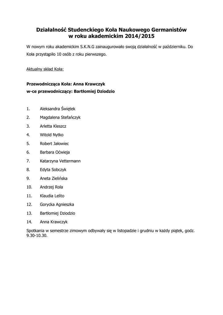 Działalność Studenckiego Koła Naukowego Germanistów w roku akademickim 2014/2015 W nowym roku akademickim S.K.N.G zainaugurowało swoją działalność w październiku. Do Koła przystąpiło 10 osób z roku pierwszego. Aktualny skład Koła: Przewodnicząca Koła: Anna Krawczyk w-ce przewodniczący: Bartłomiej Dziodzio 1. Aleksandra Świętek 2. Magdalena Stefańczyk 3. Arletta Kleszcz 4. Witold Nytko 5. Robert Jałowiec 6. Barbara Oćwieja 7. Katarzyna Vettermann 8. Edyta Sobczyk 9. Aneta Zielińska 10. Andrzej Rola 11. Klaudia Lelito 12. Gorycka Agnieszka 13. Bartłomiej Dziodzio 14. Anna Krawczyk Spotkania w semestrze zimowym odbywały się w listopadzie i grudniu w kaŜdy piątek, godz. 9.30-10.30. Tematyka spotkań: I semestr I. Przygotowanie do wycieczki historycznej „ Szlakiem frontu wschodniego I wojny światowej”. Studenci przygotowali krótkie wystąpienia na temat: przebieg działań wojennych na froncie wschodnim, Tarnów i powiat tarnowski w okresie I wojny światowej, Oddział Grobów Wojennych i jego dowódca major Rudolf Broch, twórcy: architekci, malarze i rzeźbiarze w słuŜbie wojska- twórcy cmentarzy wojennych w Galicji Zachodniej. Ustalenie trasy wycieczki. II. Wycieczka Studenckiego Koła Naukowego szlakiem frontu wschodniego z okresu I wojny światowej w dniu 22.11.2014. Nasze Koło „Szlakami Galicji” zajmowało się juŜ w semestrze letnim roku akademickiego 2013/2014 w stulecie wybuchu I Wojny Światowej historią Tarnowa i powiatu tarnowskiego w tym okresie. W dniu 20.05.2014 odbył się wykład pani dr Anny Pachowicz na w/w temat. III. Przygotowanie wyjazdu na Christkindlmarkt do Wiednia. Po ubiegłorocznej wycieczce na najstarszy jarmark boŜonarodzeniowy w Dreźnie postanowiliśmy odwiedzić tym razem stolicę Austrii i słynący z bogatych tradycji i wielkiej urody jarmark adwentowy w Wiedniu. Nasza wycieczka doszła do skutku w dn. 19.12.201421.12.2014 IV. BoŜonarodzeniowe spotkanie w „Smacznym Kąciku” Aby podzielić się wraŜeniami z Wiednia i wspólnie ze wszystkimi studentami germanistyki oraz wykładowcami cieszyć się atmosferą zbliŜających świąt, członkowie Koła postanowili aktywnie włączyć się w przygotowanie Spotkania Wigilijnego w tradycji krajów niemieckojęzycznych.