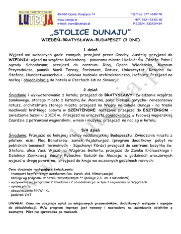 „STOLICE DUNAJU” WIEDEŃ-BRATYSŁAWA-BUDAPESZT (3 DNI) 1 dzień Wyjazd we wczesnych godz. rannych, przejazd przez Czechy, Austrię; przyjazd do WIEDNIA: wjazd na wzgórze Kahlenberg – panorama miasta i kościół Św. Józefa; Pałac i ogrody Schonbrunn; przejazd do centrum: Ring, Opera Wiedeńska, Muzeum Przyrodnicze, pomnik Marii Teresy, Parlament, Ratusz, Uniwersytet, Katedra św. Stefana, Hundertwasserhaus - ciekawa budowla architektoniczna, Hofburg; Przejazd na nocleg i obiadokolację do hotelu w Czechach lub na Słowacji; 2 dzień Śniadanie i wykwaterowanie z hotelu; przejazd do BRATYSŁAWY: zwiedzanie wzgórza zamkowego, starego miasta z Katedrą św. Marcina, pałac biskupi, gotycko- renesansowy ratusz, architektura starego miasta; przejazd na Węgry na zakole Dunaju – na trasie moŜliwość krótkiego pobytu w SZENTENDRE; następnie przejazd do ESZTERGOM zwiedzanie bazyliki z XIX w. Przejazd na uroczystą obiadokolację w typowej węgierskiej Csardzie z potrawami węgierskimi, winem i muzyką; przejazd na nocleg w hotelu; 3/4 dzień Śniadanie; Przejazd do kolejnej stolicy naddunajskiej Budapesztu: Zwiedzanie miasta z pilotem, m.in.: Plac Bohaterów, zamek Vajdahunjad; (program dodatkowy: pobyt na pobliskich basenach termalnych - Szechenyi Főrdo) przejazd do centrum: bazylika św. Stefana, ulica Vaci. Wjazd na Wzgórze Gellerta, przejazd do Zamku Królewskiego i Dzielnicy Zamkowej: Baszty Rybackie, Kościół św. Macieja; w godzinach wieczornych wyjazd w drogę powrotną; przyjazd do kraju we wczesnych godzinach rannych; Cena obejmuje następujące świadczenia: - transport komfortowym autokarem (wc, barek, dvd, klimatyzacja) - noclegi wg programu w hotelu turystycznym ** (pokoje 2,3 –os. z łazienkami) - wyŜywienie wg programu: 2 śniadania i 2 obiadokolacje: w tym 1 regionalna na Węgrzech - opieka pilota - ubezpieczenie NNW i KL - podatek VAT UWAGA! Cena nie obejmuje opłat za miejscowych przewodników, dodatkowych wstępów i napojów do obiadokolacji. W/w program imprezy jest ramowy i nastawiony na zwiedzanie obiektów z zewnątrz. Pilot nie oprowadza po muzeach.