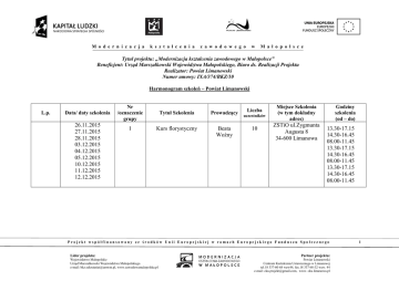 M o d e r n i z a c j a k s z t a ł c e n i a z a w o d o w e g o w M a ł o p o l s c e Tytuł projektu: „Modernizacja kształcenia zawodowego w Małopolsce” Beneficjent: Urząd Marszałkowski Województwa Małopolskiego, Biuro ds. Realizacji Projektu Realizator: Powiat Limanowski Numer umowy: IXA/374/BKZ/10 Harmonogram szkoleń – Powiat Limanowski L.p. Data/ daty szkolenia 26.11.2015 27.11.2015 28.11.2015 03.12.2015 04.12.2015 05.12.2015 10.12.2015 11.12.2015 12.12.2015 Nr /oznaczenie grupy Tytuł Szkolenia Prowadzący 1 Kurs florystyczny Beata Woźny Liczba uczestników 10 Miejsce Szkolenia (w tym dokładny adres) ZSTiO ul.Zygmunta Augusta 8 34-600 Limanowa Godziny szkolenia (od – do) 13.30-17.15 14.30-16.45 08.00-11.45 13.30-17.15 14.30-16.45 08.00-11.45 13.30-17.15 14.30-16.45 08.00-11.45 Projekt współfinansowany ze środków Unii Europejskiej w ramach Europejskiego Funduszu Społecznego Lider projektu: Województwo Małopolskie Urząd Marszałkowski Województwa Małopolskiego e-mail: [email protected], www.zawodowamalopolska.pl Partner projektu: Powiat Limanowski Centrum Kształcenia Ustawicznego w Limanowej tel.18 337-60-68 wew44, fax.18 337-68-32 wew. 44 e-mail: [email protected], www. cku.limanowa.pl 1 M o d e r n i z a c j a 28.11.2015 02.12.2015 05.12.2015 09.12.2015 12.12.2015 13.12.2015 16.12.2015 k s z t a ł c e n i a z a w o d o w e g o w M a ł o p o l s c e Kurs florystyczny Beata Woźny 10 Zespół Szkół Nr 1 w Limanowej im. Józefa Piłsudskiego ul. J Piłsudskiego 81 34-600 Limanowa 2 1 Kurs ochrony roślin Bernadetta Łabuz 10 1) 26.11.2015 28.11.2015 03.12.2015 05.12.2015 10.12.2015 12.12.2015 ZSTiO ul.Zygmunta Augusta 8 34-600 Limanowa 1 Kurs pośrednika nieruchomości Grzegorz Lekki 10 2) 28.11.2015 29.11.2015 02.12.2015 05.12.2015 06.12.2015 09.12.2015 12.12.2015 Zespół Szkół Nr 1 w Limanowej im. Józefa Piłsudskiego ul. J Piłsudskiego 81 34-600 Limanowa 12.00-18.00 16.15-19.15 12.00-18.00 16.15-19.15 12.00-18.00 09.00-12.00 16.15-19.15 Projekt współfinansowany ze środków Unii Europejskiej w ramach Europejskiego Funduszu Społecznego Lider projektu: Województwo Małopolskie Urząd Marszałkowski Województwa Małopolskiego e-mail: [email protected], www.zawodowamalopolska.pl Partner projektu: Powiat Limanowski Centrum Kształcenia Ustawicznego w Limanowej tel.18 337-60-68 wew44, fax.18 337-68-32 wew. 44 e-mail: [email protected], www. cku.limanowa.pl 13.30-17.15 08.00-11.45 13.30-17.15 08.00-11.45 13.30-17.15 08.00-11.45 08.00-14.00 08.00-14.00 15.30-19.15 08.00-14.00 08.00-14.00 15.30-19.15 08.00-14.00 2 M o d e r n i z a c j a 3) 4) 5) 6) 7) 8) 9) 28.11.2015 29.11.2015 05.12.2015 06.12.2015 07.12.2015 05.12.2015 06.12.2015 12.12.2015 13.12.2015 2015-11-25 2015-11-28 2015-12-02 2015-12-05 2015-12-09 1 k s z t a ł c e n i a Kurs opiekunów i wycieczek kolonii 1 1 1 1 Magdalena Kiełbasa Kurs barmański Kacper Bogacz obsługa obrabiarek numerycznych CNC obsługa obrabiarek numerycznych CNC obsługa obrabiarek numerycznych CNC obsługa obrabiarek numerycznych CNC obsługa obrabiarek Paweł Liszka Paweł Liszka Paweł Liszka Paweł Liszka Paweł 1 1 z a w o d o w e g o w 10 10 10 10 10 10 10 M a ł o p o l s c e Zespół Szkół Nr 1 w Limanowej im. Józefa Piłsudskiego ul. J Piłsudskiego 81 34-600 Limanowa Zespół Szkół Nr 1 w Limanowej im. Józefa Piłsudskiego ul. J Piłsudskiego 81 34-600 Limanowa Województwo Małopolskie Urząd Marszałkowski Województwa Małopolskiego e-mail: [email protected], www.zawodowamalopolska.pl 08.00-14.30 08.00-14.30 08.00-14.30 08.00-14.30 1435-1750 ZSTiO Limanowa sala 1 ZSTiO Limanowa sala 1 1400-1300 ZSTiO Limanowa sala 1 1435-1750 ZSTiO Limanowa sala 1 800-1300 ZSTiO Limanowa sala 1 1435-1750 Projekt współfinansowany ze środków Unii Europejskiej w ramach Europejskiego Funduszu Społecznego Lider projektu: 08.00-14.00 08.00-14.00 08.00-14.00 08.00-14.00 08.00-11.15 Partner projektu: Powiat Limanowski Centrum Kształcenia Ustawicznego w Limanowej tel.18 337-60-68 wew44, fax.18 337-68-32 wew. 44 e-mail: [email protected], www. cku.limanowa.pl 3 M o d e r n i z a c j a 10) 11) 12) 2015-12-12 2015-12-16 2015-12-19 1 1 1 28.11.2015 13) 1 6.12.2015 14) 1 13.12.2015 15) 1 29.11.2015 16) 2 5.12.2015 17) 2 13.12.2015 18) 2 k s z t a ł c e n i a z a w o d o w e g o numerycznych CNC obsługa obrabiarek numerycznych CNC obsługa obrabiarek numerycznych CNC obsługa obrabiarek numerycznych CNC obsługa i eksploatacja instalacji i urządzeń elektrycznych do 1kV obsługa i eksploatacja instalacji i urządzeń elektrycznych do 1kV obsługa i eksploatacja instalacji i urządzeń elektrycznych do 1kV Liszka Paweł Liszka Paweł Liszka Paweł Liszka Rafał Dutka obsługa i eksploatacja instalacji i urządzeń elektrycznych do 1kV obsługa i eksploatacja instalacji i urządzeń elektrycznych do 1kV obsługa i eksploatacja instalacji i urządzeń elektrycznych do 1kV w 10 M a ł o p o l s c e sala 1 10 ZSTiO Limanowa sala 1 1435-1750 10 ZSTiO Limanowa sala 1 800-1300 10 ZSTiO Limanowa 30 8:00 (5h) Rafał Dutka 10 ZSTiO Limanowa 30 13:00 (5 h) Rafał Dutka 10 ZSTiO Limanowa 30 8:00 (5 h) Rafał Dutka 10 ZSTiO Limanowa 30 8:00 (5h) Rafał Dutka 10 ZSTiO Limanowa 30 8:00 (5h) Rafał Dutka 10 ZSTiO Limanowa 30 13:00 (5 h) Projekt współfinansowany ze środków Unii Europejskiej w ramach Europejskiego Funduszu Społecznego Lider projektu: Województwo Małopolskie Urząd Marszałkowski Województwa Małopolskiego e-mail: [email protected], www.zawodowamalopolska.pl 800-1300 ZSTiO Limanowa Partner projektu: Powiat Limanowski Centrum Kształcenia Ustawicznego w Limanowej tel.18 337-60-68 wew44, fax.18 337-68-32 wew. 44 e-mail: [email protected], www. cku.limanowa.pl 4 M o d e r n i z a c j a ZSTiO Limanowa 30 13:00 (5 h) 3 Rafał Dutka 10 ZSTiO Limanowa 30 8:00 (5h) 3 obsługa i eksploatacja instalacji i urządzeń elektrycznych do 1kV Rafał Dutka 10 ZSTiO Limanowa 30 8:00 (5h) 3 obsługa i eksploatacja instalacji i 