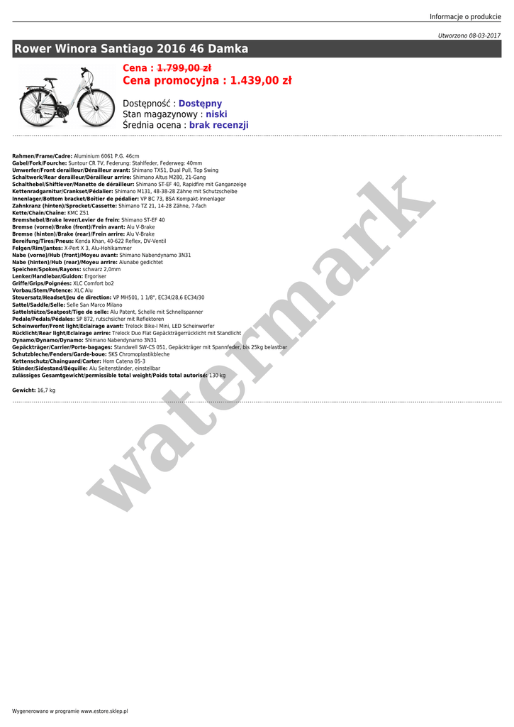 Informacje o produkcie Utworzono 08-03-2017 Rower Winora Santiago 2016 46 Damka Cena : 1.799,00 zł Cena promocyjna : 1.439,00 zł Dostępność : Dostępny Stan magazynowy : niski Średnia ocena : brak recenzji er m ar k Rahmen/Frame/Cadre: Aluminium 6061 P.G. 46cm Gabel/Fork/Fourche: Suntour CR 7V, Federung: Stahlfeder, Federweg: 40mm Umwerfer/Front derailleur/Dérailleur avant: Shimano TX51, Dual Pull, Top Swing Schaltwerk/Rear derailleur/Dérailleur arrire: Shimano Altus M280, 21-Gang Schalthebel/Shiftlever/Manette de dérailleur: Shimano ST-EF 40, Rapidfire mit Ganganzeige Kettenradgarnitur/Crankset/Pédalier: Shimano M131, 48-38-28 Zähne mit Schutzscheibe Innenlager/Bottom bracket/Boîtier de pédalier: VP BC 73, BSA Kompakt-Innenlager Zahnkranz (hinten)/Sprocket/Cassette: Shimano TZ 21, 14-28 Zähne, 7-fach Kette/Chain/Chaîne: KMC Z51 Bremshebel/Brake lever/Levier de frein: Shimano ST-EF 40 Bremse (vorne)/Brake (front)/Frein avant: Alu V-Brake Bremse (hinten)/Brake (rear)/Frein arrire: Alu V-Brake Bereifung/Tires/Pneus: Kenda Khan, 40-622 Reflex, DV-Ventil Felgen/Rim/Jantes: X-Pert X 3, Alu-Hohlkammer Nabe (vorne)/Hub (front)/Moyeu avant: Shimano Nabendynamo 3N31 Nabe (hinten)/Hub (rear)/Moyeu arrire: Alunabe gedichtet Speichen/Spokes/Rayons: schwarz 2,0mm Lenker/Handlebar/Guidon: Ergoriser Griffe/Grips/Poignées: XLC Comfort bo2 Vorbau/Stem/Potence: XLC Alu Steuersatz/Headset/Jeu de direction: VP MH501, 1 1/8", EC34/28,6 EC34/30 Sattel/Saddle/Selle: Selle San Marco Milano Sattelstütze/Seatpost/Tige de selle: Alu Patent, Schelle mit Schnellspanner Pedale/Pedals/Pédales: SP 872, rutschsicher mit Reflektoren Scheinwerfer/Front light/Eclairage avant: Trelock Bike-I Mini, LED Scheinwerfer Rücklicht/Rear light/Eclairage arrire: Trelock Duo Flat Gepäckträgerrücklicht mit Standlicht Dynamo/Dynamo/Dynamo: Shimano Nabendynamo 3N31 Gepäckträger/Carrier/Porte-bagages: Standwell SW-CS 051, Gepäckträger mit Spannfeder, bis 25kg belastbar Schutzbleche/Fenders/Garde-boue: SKS Chromoplastikbleche Kettenschutz/Chainguard/Carter: Horn Catena 05-3 Ständer/Sidestand/Béquille: Alu Seitenständer, einstellbar zulässiges Gesamtgewicht/permissible total weight/Poids total autorisé: 130 kg w at Gewicht: 16,7 kg Wygenerowano w programie www.estore.sklep.pl