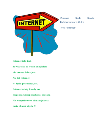 Zuzanna Szulc Podstawowa nr 4 kl. I b tytuł "Internet" Internet taki jest, że wszystko co w nim znajdziesz nie zawsze dobre jest. Ale też Internet w życiu potrzebny jest. Internet zalety i wady ma czego ma więcej przekonaj się sam. Nie wszystko co w nim znajdziesz może okazać się złe !! Szkoła Lena Pasternak Szkoła Podstawowa nr 4 kl. I B tytuł "W Internecie” Gdy serfujesz w Internecie pomyśl może małe dziecię ile rzeczy złych może spotkać cię w tym necie. Wirusy i hakerzy już blokują, już pytają mnie o dane, które nie są im jeszcze znane. Zaraz znikam z takiej strony bo uczyłam się obrony. Tak naprawdę chcecie wiedzieć to pytajcie mamy taty, które strony są bezpieczne, które służy do zabawy? Tak, tych używaj bez obawy. Oliwia Szudarek Szkoła Podstawowa nr 1 w Pile Klasa 3 D „Internet kopalnią wiedzy” Gdy czegoś nie wiemy i nie rozumiemy, to w internecie poszukujemy. Tam są wiadomości i rozmaitości. Kliknij raz i masz. Alicja Ratajska – klasa IA Szkoła Podstawowa nr Kopernika w Pile Bezpieczny Internet- co to takiego? To nie surfować po nieznanych stronach ,koleżanko i kolego! Internet to źródło co wiedzę nam daje. Ale nie wierzcie we wszystko co wam podaje! 4 im. M. Autorem rymowanki pt. "Bezpieczny Internet" jest uczeń Zespołu Szkół nr 2 w Pile, z klasy 2b - Michał Lorenc BEZPIECZNY INTERNET Gdy chcesz kogoś w sieci poznać, bądź nieufny na początku. Nie podawaj swoich danych – użyj nicka i w porządku. Nigdy nie wysyłaj obcym swoich zdjęć oraz filmików. Nie otwieraj w komputerze dziwnych, podejrzanych plików. Gdy cię coś zaniepokoi do rodziców szybko leć. Wtedy pewność możesz mieć, że to jest bezpieczna sieć. Niech największą tajemnicą pozostanie twoje hasło – Bo gdy ktoś się o nim dowie to kłopoty są gotowe. A na koniec zapamiętaj jeszcze jedną ważną rzecz: Korzystając z Internetu musisz zawsze umiar mieć! Antonina Małachowska klasa Ia Szkoła Podstawowa nr 4 w Pile. Tytuł rymowanki : Nie wszystko złoto co się świeci… W internecie sobie siedzę , gry, zabawy z tatą śledzę. Lecz nie wszędzie wchodzić mogę, taką tata dał przestrogę: „Moje drogie, słodkie dzieci , nie wszystko złoto, co pod myszkę wleci.” Wiktoria Nowacka Szkoła Podstawowa nr 4 w Pile kl. I B "W internetowym świecie" Świat internetowy jest jak świat bajkowy. Ciekawy, piękny, ale zawsze zagadkowy. Każde dziecko w nim być chce, Lecz uważać trzeba, aby to nie skończyło się źle. Bohaterów jest w nim dużo, i tych dobrych i tych złych. Trzeba zawsze być ostrożnym, aby móc odróżnić ich. Z Internetem możesz wszystko. Jednak bez nadzoru mamy, Nie podawaj żadnych danych, Bo możesz zostać źle wykorzystany! Wiktoria Pielech, lat 7 Klasa 1C Szkoła Podstawowa nr 4 w Pile. „Internet to nie lada pokusa, Lecz uważaj, bo ściągniesz wirusa. Korzystając z zabezpieczeń, Surfujesz bez wyrzeczeń. A i mama się ucieszy, Jeśli wie, że bezpieczne są dzieci!”