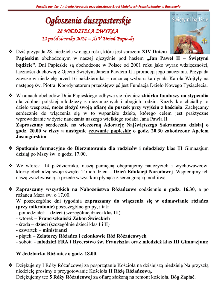 Parafia pw. św. Andrzeja Apostoła przy Klasztorze Braci Mniejszych Franciszkanów w Barczewie O g ł o s z e n ia d u s z p a s t e r s k ie 28 NIEDZIELA ZWYKŁA 12 października 2014 – XIV Dzień Papieski Dziś przypada 28. niedziela w ciągu roku, która jest zarazem XIV Dniem Papieskim obchodzonym w naszej ojczyźnie pod hasłem „Jan Paweł II – Świętymi bądźcie”. Dni Papieskie są obchodzone w Polsce od 2001 roku jako wyraz wdzięczności, łączności duchowej z Ojcem Świętym Janem Pawłem II i promocji jego nauczania. Przypada zawsze w niedzielę przed 16 października – rocznicą wyboru kardynała Karola Wojtyły na następcę św. Piotra. Koordynatorem przedsięwzięć jest Fundacja Dzieło Nowego Tysiąclecia. W ramach obchodów Dnia Papieskiego odbywa się również zbiórka funduszy na stypendia dla zdolnej polskiej młodzieży z niezamożnych i ubogich rodzin. Każdy kto chciałby to dzieło wesprzeć, może złożyć swoją ofiarę do puszek przy wyjściu z kościoła. Zachęcamy serdecznie do włączenia się w to wspaniałe dzieło, którego celem jest praktyczne wprowadzanie w życie nauczania naszego wielkiego rodaka Jana Pawła II. Zapraszamy serdecznie na wieczorną Adorację Najświętszego Sakramentu dzisiaj o godz. 20.00 w ciszy a następnie czuwanie papieskie o godz. 20.30 zakończone Apelem Jasnogórskim Spotkanie formacyjne do Bierzmowania dla rodziców i młodzieży klas III Gimnazjum dzisiaj po Mszy św. o godz. 17.00. We wtorek, 14 października, naszą pamięcią obejmujemy nauczycieli i wychowawców, którzy obchodzą swoje święto. To ich dzień – Dzień Edukacji Narodowej. Wspierajmy ich naszą życzliwością, a przede wszystkim płynącą z serca gorącą modlitwą. Zapraszamy wszystkich na Nabożeństwa Różańcowe codziennie o godz. 16.30, a po różańcu Msza św. o 17.00. W poszczególne dni tygodnia zapraszamy do włączenia się w odmawianie różańca (przy mikrofonie) poszczególne grupy, i tak: - poniedziałek – dzieci (szczególnie dzieci klas III) - wtorek – Franciszkański Zakon Świeckich - środa – dzieci (szczególnie dzieci klas I i II) - czwartek – ministranci - piątek – Zelatorzy Różańca i członkowie Róż Różańcowych - sobota - młodzież FRA i Rycerstwo św. Franciszka oraz młodzież klas III Gimnazjum; W Jedzbarku Różaniec o godz. 18.00. Dziękujemy I Róży Różańcowej za posprzątanie Kościoła na dzisiejszą niedzielę Na przyszłą niedzielę prosimy o przygotowanie Kościoła II Różę Różańcową. Dziękujemy też 5 Róży Różańcowej za ofiarę złożoną na remont kościoła. Bóg Zapłać. Parafia pw. św. Andrzeja Apostoła przy Klasztorze Braci Mniejszych Franciszkanów w Barczewie WIZYTACJA KANONICZNA NASZEJ PARAFII. Jednym z bardzo ważnych wydarzeń każdej wspólnoty parafialnej jest przewidziana w prawie Kościoła – wizytacja duszpasterska, która odbywa się w każdej parafii diecezji co 5 lat. W naszej parafii przeprowadzi ją w przyszłą niedzielę, 19 października 2014 r. w imieniu Księdza Arcybiskupa - ks. prał. kan. prof. dr hab. Władysław Nowak. CZYM JEST WIZYTACJA KANONICZNA? Po pierwsze wizytacja biskupa w parafii jest czynnością apostolską, pasterską. Biskup jako następca apostołów, i jak niegdyś oni sami, odwiedza parafię, by spotkać się z wiernymi i wspólnie przeżywać radość chrześcijańskiej wiary. Przyjeżdża by słuchać o radościach, wejść w nasze troski, by prosić Boga o błogosławieństwo dla naszego życia. Ksiądz biskup na wizytację przybywa zawsze jako gospodarz diecezji, by zapoznać się z sytuacją duszpasterską i gospodarczą parafii. Trzeba podkreślić, że wizytacja jest to nie tyle czas sprawdzania i kontroli, ale czas spotkań z wiernymi, czas umacniania ich wierności Chrystusowi, Ewangelii i Kościołowi. Wizytacja kanoniczna wskazuje też bardzo czytelnie, że biskup jest fundamentem oraz znakiem jedności Kościoła diecezjalnego, a jedność jest sprawą zasadniczą, o którą już Jezus prosił Ojca. Po drugie wizytacja biskupa w parafii ma wymiar kanoniczny. Wizytacji kanonicznej podlegają wszystkie dziedziny życia religijnego, moralnego, apostolskiego i administracyjno-gospodarczego. Podczas wizytacji, ksiądz biskup poznaje charakterystykę parafii, życie religijne parafii, interesuje go przebieg katechizacji, oraz zapoznaje się z innymi formami duszpasterstwa występującymi w parafii. Wizytacja pasterska jest jakby duszą biskupiego posługiwania i rozszerzeniem duchowej obecności biskupa pomiędzy wiernymi. Właśnie tak objawia się ona w swojej prawdziwej istocie, czyli jako znak obecności Pana, który odwiedza swój lud, przynosząc mu pokój. Stąd też jutro – w poniedziałek po wieczornej Mszy św. odbędzie się spotkanie wszystkich Róż Różańcowych a także Wspólnoty Franciszkańskiego Zakonu Świeckich w sprawie przygotowania Liturgii. We wtorek po wieczornej Mszy św. spotkanie wszystkich obecnych i byłych lektorów a także dorosłych już mężczyzn, którzy chcieliby służyć przy ołtarzy jako Honorowa Liturgiczna Służba Ołtarza. W przyszłą niedzielę podczas Wizytacji liturgię przygotują i poprowadzą: na Mszy św. o godz. 8.00 – Franciszkański Zakon Świeckich; o godz. 9.30 – Róże Różańcowe; o godz. 12.00 – Rycerstwo św. Franciszka i dzieci przygotowujące się do I Komunii Św.; o godz. 17.00 – młodzież FRA i młodzież przygotowująca się do Bierzmowania; w Jedzbarku o godz. 10.30 – ministranci oraz mieszkańcy Jedzbarka i okolic. Wszystkich drogich Parafian i Sympatyków naszego kościoła gorąco zachęcamy do licznego udziału w Mszach świętych wizytacyjnych w przyszłą niedzielę. Przy wyjściu z kościoła do nabycia „Gość Niedzielny”, „Mały Gość Niedzielny” i „Posłaniec św. Antoniego”. Intencje Mszy św. na nadchodzący tydzień: … Życzymy wszystkim franciszkańskiego „Pokoju i Dobra” Franciszkanie 