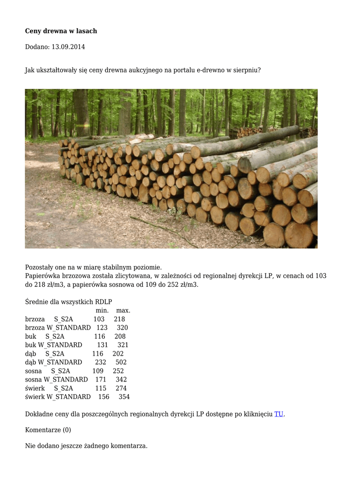 Ceny drewna w lasach Dodano: 13.09.2014 Jak ukształtowały się ceny drewna aukcyjnego na portalu e-drewno w sierpniu? Pozostały one na w miarę stabilnym poziomie. Papierówka brzozowa została zlicytowana, w zależności od regionalnej dyrekcji LP, w cenach od 103 do 218 zł/m3, a papierówka sosnowa od 109 do 252 zł/m3. Średnie dla wszystkich RDLP min. max. brzoza S_S2A 103 218 brzoza W_STANDARD 123 320 buk S_S2A 116 208 buk W_STANDARD 131 321 dąb S_S2A 116 202 dąb W_STANDARD 232 502 sosna S_S2A 109 252 sosna W_STANDARD 171 342 świerk S_S2A 115 274 świerk W_STANDARD 156 354 Dokładne ceny dla poszczególnych regionalnych dyrekcji LP dostępne po kliknięciu TU. Komentarze (0) Nie dodano jeszcze żadnego komentarza.