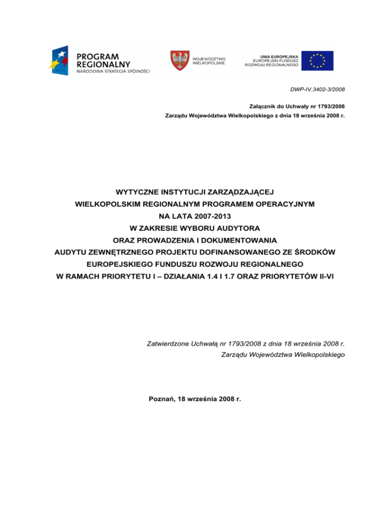 DWP-IV.3402-3/2008 Załącznik do Uchwały nr 1793/2008 Zarządu Województwa Wielkopolskiego z dnia 18 września 2008 r. WYTYCZNE INSTYTUCJI ZARZĄDZAJĄCEJ WIELKOPOLSKIM REGIONALNYM PROGRAMEM OPERACYJNYM NA LATA 2007-2013 W ZAKRESIE WYBORU AUDYTORA ORAZ PROWADZENIA I DOKUMENTOWANIA AUDYTU ZEWNĘTRZNEGO PROJEKTU DOFINANSOWANEGO ZE ŚRODKÓW EUROPEJSKIEGO FUNDUSZU ROZWOJU REGIONALNEGO W RAMACH PRIORYTETU I – DZIAŁANIA 1.4 I 1.7 ORAZ PRIORYTETÓW II-VI Zatwierdzone Uchwałą nr 1793/2008 z dnia 18 września 2008 r. Zarządu Województwa Wielkopolskiego Poznań, 18 września 2008 r. 2 Spis treści Wstęp 4 Używane pojęcia i skróty 6 Rozdział 1 – Obowiązek przeprowadzenia audytu 7 1.1. Wartość projektu 7 1.2. Termin przeprowadzenia audytu 7 1.3. Warunki kwalifikowalności kosztu audytu zewnętrznego 8 Rozdział 2 – Wybór audytora 10 2.1. Podmioty uprawnione do prowadzenia audytu zewnętrznego projektu 10 2.2. Kompetencje zespołu audytorskiego 11 2.3. Podstawowe zasady dotyczące wyboru audytora 12 Rozdział 3 – Zakres audytu 14 3.1. Gotowość organizacyjna beneficjenta i jego procedury wewnętrzne 14 3.2. Audyt finansowy 14 3.3. Audyt realizacji projektu 15 3.4. Wizyta na miejscu realizacji projektu 16 3.5. Prawidłowość i rzetelność prowadzenia i archiwizowania dokumentacji 17 3.6. Zgodność projektu z politykami wspólnotowymi 17 3.7. Wdrożenie zaleceń pokontrolnych 18 3.8. Analiza powodzenia projektu 18 Rozdział 4 – Wyniki audytu 19 4.1. Elementy sprawozdania z audytu 19 4.2. Informacje wynikające ze sprawozdania z audytu 19 3 4.3. Pozostałe informacje dotyczące sporządzania i treści sprawozdania z audytu 21 Rozdział 5 – Kontrole projektu 22 4 Wstęp Zgodnie z treścią umowy o dofinansowanie projektu w ramach Wielkopolskiego Regionalnego Programu Operacyjnego na lata 2007-2013, beneficjent zobowiązany jest do przeprowadzenia audytu zewnętrznego projektu w przypadku gdy jego wartość przekracza 20.000.000 PLN lub wartość kilku realizowanych przez tego beneficjenta projektów, dofinansowanych ze środków Europejskiego Funduszu Rozwoju Regionalnego w ramach Wielkopolskiego Regionalnego Programu Operacyjnego na lata 2007-2013 przekracza 30.000.000 PLN. Dla potrzeb niniejszych „Wytycznych” audytem zewnętrznym jest zakres działań, których celem jest uzyskanie dowodów pozwalających na jednoznaczną ocenę przez audytora, czy realizacja projektu przebiega zgodnie z obowiązującym prawem, umową i wnioskiem o dofinansowanie projektu. Audyt zewnętrzny projektu jest prowadzony w celu uzyskania zapewnienia, że: ▬ projekt jest realizowany zgodnie z obowiązującymi przepisami prawa wspólnotowego i krajowego (w tym wytycznych Instytucji Zarządzającej Wielkopolskim Regionalnym Programem Operacyjnym na lata 2007-2013 i innych instytucji uprawnionych do wydawania wytycznych), umową i wnioskiem o dofinansowanie, ▬ wydatki poniesione w ramach projektu są kwalifikowalne, ▬ informacje przekazane do Instytucji Pośredniczącej, Instytucji Zarządzającej Wielkopolskim Regionalnym Programem Operacyjnym na lata 2007-2013 oraz innych uprawnionych instytucji są zgodne z prawdą i wynikają z dostępnych w siedzibie beneficjenta dokumentów źródłowych (przede wszystkim z dokumentów finansowo-księgowych i rzeczowych) oraz z prowadzonej przez niego ewidencji księgowej. Szczegółowy zakres audytu podano w Rozdziale 3 niniejszych „Wytycznych”. 5 Rzetelnie przeprowadzony audyt projektu stanowi niezależne potwierdzenie prawidłowości realizacji projektu dofinansowanego ze środków Europejskiego Funduszu Rozwoju Regionalnego w ramach Wielkopolskiego Regionalnego Programu Operacyjnego na lata 20072013. Potwierdzenie to jest jedną z podstaw do ostatecznego rozliczenia projektu przez Departament Wdrażania Programu Regionalnego Urzędu Marszałkowskiego Województwa Wielkopolskiego w Poznaniu lub przez Wojewódzki Fundusz Ochrony Środowiska i Gospodarki Wodnej w Poznaniu. 6 Używane pojęcia i skróty audyt – zadanie audytowe obejmujące projekt dofinansowany ze środków Europejskiego Funduszu Rozwoju Regionalnego w ramach Wielkopolskiego Regionalnego Programu Operacyjnego na lata 2007-2013, realizowane przez zewnętrzny podmiot, niezależny od beneficjenta, posiadający uprawnienia wskazane Rozdziale 2 niniejszych „Wytycznych” oraz wybrany w sposób zgodny z zapisami Rozdziału 2 niniejszych „Wytycznych”, DWP – Departament Wdrażania Programu Regionalnego w Urzędzie Marszałkowskim Województwa Wielkopolskiego w Poznaniu, EFRR – Europejski Fundusz Rozwoju Regionalnego, UMWW – Urząd Marszałkowski Województwa Wielkopolskiego w Poznaniu, WFOŚiGW – Wojewódzki Fundusz Ochrony Środowiska i Gospodarki Wodnej w Poznaniu, WRPO – Wielkopolski Regionalny Program Operacyjny na lata 2007-2013. 7 Rozdział 1 – Obowiązek przeprowadzenia audytu 1.1. Wartość projektu 1.1.1. Beneficjent zobowiązany jest do przeprowadzenia audytu projektu dofinansowanego ze środków EFRR w ramach WRPO jeżeli wartość tego projektu przekracza 20.000.000 PLN. 1.1.2. W przypadku realizowania kilku projektów dofinansowanych ze środków EFRR w ramach WRPO, których wartość jednostkowa nie przekracza 20.000.000 PLN, beneficjent zobowiązany jest do przeprowadzenia audytu realizowanych przez siebie projektów, jeżeli ich łączna wartość przekracza 30.000.000 PLN. W takim przypadku badaniu audytowemu podlega projekt, którego realizacja spowodowała przekroczenie kwoty 30.000.000 PLN. Każdy kolejny projekt realizowany przez beneficjenta w ramach WRPO podlega badaniu audytowemu. 1.1.3. Koszt audytu zewnętrznego projektu będzie uznany za koszt kwalifikowalny również w przypadku, gdy wartość audytowanego projektu nie przekracza 20.000.000 PLN (lub wartość kilku projektów nie przekracza 30.000.000 PLN), pod warunkiem zachowania wszelkich zasad określonych w niniejszych „Wytycznych”. 1.2. Termin przeprowadzenia audytu Beneficjen