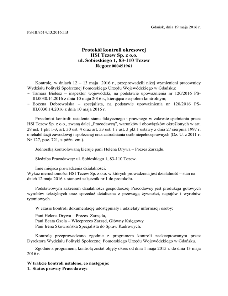 Gdańsk, dnia 19 maja 2016 r. PS-III.9514.13.2016.TB Protokół kontroli okresowej HSI Tczew Sp. z o.o. ul. Sobieskiego 1, 83-110 Tczew Regon:000451961 Kontrolę, w dniach 12 – 13 maja 2016 r., przeprowadzili niżej wymienieni pracownicy Wydziału Polityki Społecznej Pomorskiego Urzędu Wojewódzkiego w Gdańsku: - Tamara Bielesz – inspektor wojewódzki, na podstawie upoważnienia nr 120/2016 PSIII.0030.14.2016 z dnia 10 maja 2016 r., kierująca zespołem kontrolnym; - Bożena Dobrowolska – specjalista, na podstawie upoważnienia nr 120/2016 PSIII.0030.14.2016 z dnia 10 maja 2016 r. Przedmiot kontroli: ustalenie stanu faktycznego i prawnego w zakresie spełniania przez HSI Tczew Sp. z o.o., zwaną dalej „Pracodawcą”, warunków i obowiązków określonych w art. 28 ust. 1 pkt 1-3, art. 30 ust. 4 oraz art. 33 ust. 1 i ust. 3 pkt 1 ustawy z dnia 27 sierpnia 1997 r. o rehabilitacji zawodowej i społecznej oraz zatrudniania osób niepełnosprawnych (Dz. U. z 2011 r. Nr 127, poz. 721, z późn. zm.). Jednostką kontrolowaną kieruje pani Helena Drywa – Prezes Zarządu. Siedziba Pracodawcy: ul. Sobieskiego 1, 83-110 Tczew. Inne miejsca prowadzenia działalności: Wykaz nieruchomości HSI Tczew Sp. z o.o. w których prowadzona jest działalność – stan na dzień 12 maja 2016 r. stanowi załącznik nr 1 do protokołu. Podstawowym zakresem działalności gospodarczej Pracodawcy jest produkcja gotowych wyrobów tekstylnych oraz sprzedaż detaliczna z przewagą żywności, napojów i wyrobów tytoniowych. W czasie kontroli dokumentację udostępniały i udzielały informacji osoby: Pani Helena Drywa – Prezes Zarządu, Pani Beata Gzela – Wiceprezes Zarząd, Główny Księgowy Pani Irena Skowrońska Specjalista do Spraw Kadrowych. Kontrolę przeprowadzono zgodnie z programem kontroli zaakceptowanym przez Dyrektora Wydziału Polityki Społecznej Pomorskiego Urzędu Wojewódzkiego w Gdańsku. Zgodnie z programem, kontrolą został objęty okres od dnia 1 maja 2015 r. do dnia 13 maja 2016 r. W trakcie kontroli ustalono, co następuje: 1. Status prawny Pracodawcy: Pracodawca prowadzi działalność na podstawie: Wpisu do KRS nr 0000515378 Rejestru Przedsiębiorców, prowadzonego przez Sąd Rejonowy Gdańsk-Północ, VII Wydział Gospodarczy Krajowego Rejestru Sądowego. Decyzji Wojewody Pomorskiego nr C/00032 z dnia 30 czerwca 1992 r. 2. Spełnianie przez Pracodawcę warunków określonych w art. 28 ustawy z dnia 27 sierpnia 1997 r. o rehabilitacji zawodowej i społecznej oraz zatrudniania osób niepełnosprawnych: 1) stan zatrudnienia: ogółem[.]*osób ([.]*etatów), w tym niepełnosprawnych [.]* osób ([.]* etatów). Wszystkie osoby zatrudnione są na podstawie przepisów kodeksu pracy. [.]*osób ([.]*etatów) ma orzeczony umiarkowany stopień niepełnosprawności, [.]* osób ([.]* etatów) ma orzeczony znaczny stopień niepełnosprawności (zestawienie osób stanowi załącznik nr 2 do protokołu, zestawienie etatów stanowi załącznik nr 3 do protokołu). Pracodawca przedstawił zespołowi kontrolnemu stan zatrudnienia w losowo wybranym czasie kontrolowanego okresu: maj 2015 r. (zestawienie osób stanowi załącznik nr 4 do protokołu, zestawienie etatów stanowi załącznik nr 5 do protokołu), lipiec 2015 r. (zestawienie osób stanowi załącznik od nr 6 do protokołu, zestawienie etatów stanowi załącznik nr 7 do protokołu), grudzień 2015 r. (zestawienie stanowi załącznik od nr 8 do protokołu, zestawienie etatów stanowi załącznik nr 9 do protokołu,), marzec 2016 r. (zestawienie stanowi załącznik od nr 10 do protokołu, zestawienie etatów stanowi załącznik nr11 do protokołu). Zespół kontrolny stwierdził, że w okresie poddanym kontroli pracodawca wypełniał warunki zatrudnienia, określone w art. 28 ust. 1 ustawy z dnia 27 sierpnia 1997 r. o rehabilitacji zawodowej i społecznej oraz zatrudniania osób niepełnosprawnych, dla pracodawców posiadających status zakładu pracy chronionej. W trakcie czynności kontrolnych skontrolowano akta osobowe [.]* osób niepełnosprawnych zatrudnionych w zakładzie:[.]*osoby mającej orzeczony znaczny stopień niepełnosprawności, [.]* osób mających orzeczony umiarkowany stopień niepełnosprawności. We wszystkich aktach osobowych, objętych kontrolą, stwierdza się aktualne umowy o pracę (z treści umowy wynika zakres czynności), aktualne zaświadczenia lekarskie o braku przeciwwskazań zdrowotnych do wykonywania pracy na stanowisku oraz orzeczenia o stopniu niepełnosprawności. 2) wskaźnik zatrudnienia osób niepełnosprawnych wynosi [.]* wskaźnik zatrudnienia osób niepełnosprawnych z umiarkowanym lub znacznym stopniem niepełnosprawności wynosi [.]*(stan na dzień kontroli). Pracodawca przedstawił wskaźniki zatrudnienia w ww. miesiącach kontrolowanego okresu. Zespół kontrolny stwierdził, że w okresie poddanym kontroli pracodawca osiągał wartości wskaźników zatrudnienia, określone w art. 28 ust. 1 pkt 1a ustawy z dnia 27 sierpnia 1997 r. o rehabilitacji zawodowej i społecznej oraz zatrudniania osób niepełnosprawnych, dla pracodawców posiadających status zakładu pracy chronionej. 3) obiekty i pomieszczenia przy ul. Sobieskiego 1, użytkowane na podstawie decyzji Państwowej Inspekcji Pracy nr rej.:03119-K033-Ao0006/2010 z dnia 09.04.2010 r.; pomieszczenia sklepów przy ul. Kubusia Puchatka 5 użytkowane na podstawie decyzji PIP nr rej.:03119-51202-34/2006 z dnia 25 października 2006 r., pomieszczenia przy ul. 1 Maja 4; ul. Reymonta 2; Al. Solidarności 9, ul. 30 Stycznia 7A; Al. Zwycięstwa 5; ul. Łąkowej 4; ul. Gdańskiej 40 B; ul. Robotniczej 12A; ul. Konarskiego 7 użytkowane na podstawie postanowienia PIP znak: P-2)TO-03)19)06)92 z dnia 30 czerwca 1992 r., potwierdzające, że obiekty i pomieszczenia użytkowane przez Pracodawcę, w ramach statusu zakładu pracy chronionej odpowiadają przepisom i zasadom bezpieczeństwa i higieny pracy, uwzględniają potrzeby osób niepełnospra